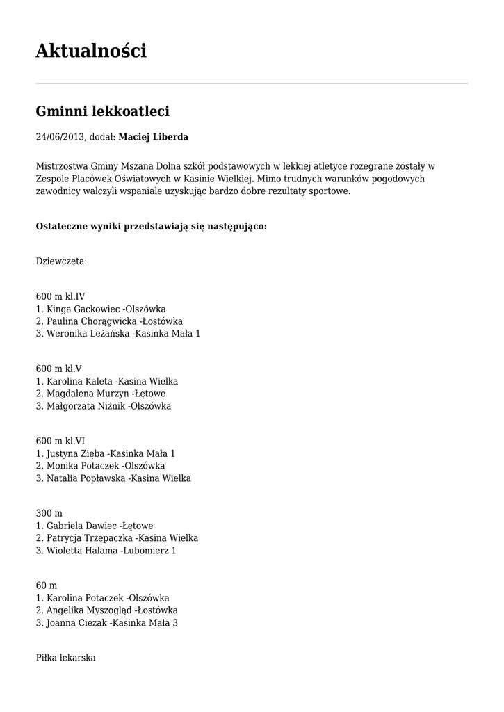 Aktualności Gminni lekkoatleci 24/06/2013, dodał: Maciej Liberda Mistrzostwa Gminy Mszana Dolna szkół podstawowych w lekkiej atletyce rozegrane zostały w Zespole Placówek Oświatowych w Kasinie Wielkiej. Mimo trudnych warunków pogodowych zawodnicy walczyli wspaniale uzyskując bardzo dobre rezultaty sportowe. Ostateczne wyniki przedstawiają się następująco: Dziewczęta: 600 m kl.IV 1. Kinga Gackowiec -Olszówka 2. Paulina Chorągwicka -Łostówka 3. Weronika Leżańska -Kasinka Mała 1 600 m kl.V 1. Karolina Kaleta -Kasina Wielka 2. Magdalena Murzyn -Łętowe 3. Małgorzata Niżnik -Olszówka 600 m kl.VI 1. Justyna Zięba -Kasinka Mała 1 2. Monika Potaczek -Olszówka 3. Natalia Popławska -Kasina Wielka 300 m 1. Gabriela Dawiec -Łętowe 2. Patrycja Trzepaczka -Kasina Wielka 3. Wioletta Halama -Lubomierz 1 60 m 1. Karolina Potaczek -Olszówka 2. Angelika Myszogląd -Łostówka 3. Joanna Cieżak -Kasinka Mała 3 Piłka lekarska 1. Kamila Kundys -Lubomierz 1 2. Monika Łabuz -Kasina Wielka 3. Agnieszka Mucha -Kasinka Mała 1 Piłeczka palantowa 1. Edyta Fryc -Kasinka Mała 1 2. Weronika Wronka -Olszówka 3. Dorota Potaczek -Łostówka Skok w dal 1. Magdalena Kościelniak -Olszówka 2. Katarzyna Sobczak -Kasinka Mała 1 3. Ewelina Kołodziej -Łętowe Sztafeta 1. Olszówka 2. Łętowe 3. Kasinka Mała 1 Drużynowo 1. Olszówka 2. Kasina Wielka 3. Kasinka Mała 1 Chłopcy: 600 m kl.IV 1. Jakub Czyszczoń -Olszówka 2. Adam Jania -Lubomierz 1 3. Krystian Faron -Kasina Wielka 600 m kl.V 1. Łukasz Gackowiec -Olszówka 2. Daniel Wacławik -Olszówka 3. Grzegorz Krzysztofiak -Kasinka Mała 3 600 m kl.VI 1. Paweł Rapta -Kasina Wielka 2. Adam Cież -Kasinka Mała 1 3. Jakub Kowalczyk -Lubomierz 1 300 m 1. Robert Szczęsnowski -Mszana Górna 2. Kewin Rzepka -Olszówka 3. Bartłomiej Puto -Kasina Wielka 60 m 1. Paweł Wacławik -Olszówka 2. Krzysztof Łacny -Kasina Wielka 3. Daniel Wójtowicz -Mszana Górna 1 Piłka lekarska 1. Mateusz Jarosz -Łętowe 2. Eryk Zwierczyk -Łostówka 3. Marcin Cież -Kasina Wielka Piłeczka palantowa 1. Rafał Klimek -Łostówka 2. Karol Drąg -Kasina Wielka 3. Mateusz Wojtyczka -Lubomierz 1 Skok w dal 1. Paweł Sabura -Kasina Wielka 2. Krzysztof Rzepka -Olszówka 3. Adam Zięba -Kasinka Mała 1 Sztafeta 1. Olszówka 2. Lubomierz 1 3. Kasinka Mała 1 Drużynowo 1. Olszówka 2. Kasina Wielka 3. Lubomierz 1 Nagrody dla najlepszych zawodników, ufundowane przez Urząd Gminy Mszana Dolna, wręczała dyrektor szkoły w Kasinie Wielkiej Pani Janina Ziemianin. red. Piotr Kowalik Tabela punktowa szkół podst. 2012-2013 - tutaj zdjęcia