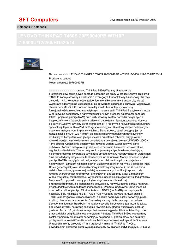 SFT Computers Utworzono: niedziela, 03 kwiecień 2016 Notebooki > notebooki LENOVO THINKPAD T460S 20F90040PB W7/10P I7-6600U/12/256/HD520/14 Nazwa produktu: LENOVO THINKPAD T460S 20F90040PB W7/10P I7-6600U/12/256/HD520/14 Producent: Lenovo Model produktu: 20F90040PB Lenovo ThinkPad T460sWydajny Ultrabook dla profesjonalistów szukających dobrego narzędzia do pracy w drodze.Lenovo ThinkPad T460s to zaprojektowany z dbałością o szczegóły Ultrabook klasy biznesowej. Ważący zaledwie 1,4 kg komputer jest urządzeniem nie tylko łatwym w transporcie, ale też wyjątkowo odpornym na uszkodzenia, co potwierdza zgodność z surowym, wojskowym standardem MIL-SPEC. Pomimo smukłej konstrukcji laptop wydajnością i funkcjonalnością nie odbiega od większych maszyn serii ThinkPad ? użytkownik może więc liczyć na podzespoły z najwyższej półki (w tym procesor najnowszej generacji Intel? i pojemną pamięć RAM) oraz rozbudowany zestaw narzędzi związanych z bezpieczeństwem (pozwolą zminimalizować zagrożenie nieautoryzowanego dostępu do danych).Jasny i czytelny ekran o przekątnej 14?Jednym z najważniejszych punktów specyfikacji laptopa ThinkPad T460s jest rewelacyjny, 14-calowy ekran zbudowany w oparciu o matrycę typu In-plane switching. Standardowo, panel dostępny jest w rozdzielczości FHD (1920 x 1080), ale dla bardziej wymagających użytkowników, szukających komputera oferującego większą przestrzeń roboczą, przygotowano również wersję z wyświetlaczem o ponadstandardowej rozdzielczości WQHD (2560 x 1440 pikseli). Opcjonalnie dostępny jest również wariant wyposażony w panel dotykowy. Każda z matryc oferuje dobre odwzorowanie barw oraz szeroki zakres regulacji podświetlenia ? to, w połączeniu z powłoką antyodblaskową niwelującą niechciane odbicia, gwarantuje czytelność obrazu nawet w niesprzyjających warunkach ? na przykład przy silnym świetle słonecznym lub sztucznym.Mocny procesor, szybka pamięć RAMBez względu na konfigurację, moc obliczeniową dostarczy jeden z najnowszych i zarazem najmocniejszych układów mobilnych na rynku ? procesor Intel? Core? generacji Skylake. Wielordzeniowy i wielowątkowy model i5 lub i7 bez trudu radzi sobie z obsługą nawet najbardziej zaawansowanych aplikacji, sprawdzi się również w programach graficznych, projektowych a także przy pracy z materiałem wideo w wysokiej rozdzielczości. Wyposażenie uzupełnia zintegrowany układ graficzny firmy Intel?, zoptymalizowany pod kątem uzyskania możliwie dużej energooszczędności, ale jednocześnie pozwalający na wyświetlenie obrazu na nawet dwóch dodatkowych monitorach jednocześnie. Ponadto, użytkownik liczyć może na obecność szybkiej pamięci RAM na kościach DDR4 (do 24 GB) oraz wydajnych nośników SSD na złączu M.2 SATA lub PCIe.Wygodna klawiatura, duży gładzik i TrackPoint?Wygodnie ułożone klawisze, o dobrze dobranym skoku pozwalają pisać szybko, i bez uczucia zmęczenia. Charakterystyczny dla biznesowych urządzeń Lenovo, manipulator TrackPoint? umożliwia szybkie i precyzyjne zaznaczanie tekstu bez użycia myszki, na uwagę zasługuje również duży gładzik wspierający obsługę gestami. Ponad 10 godzin na jednym ładowaniuW wypadku Ultrabooków długi czas pracy z daleka od gniazdka jest priorytetem ? dlatego ThinkPad T460s wyposażony został w pojemny akumulator pozwalający na ponad 10 godzin pracy bez potrzeby podłączania ładowarki!Smukła obudowa, bezkompromisowa wytrzymałośćObudowa Ultrabooka mierzy zaledwie 17 mm grubości ? mimo to ThinkPad T460s z powodzeniem przeszedł przez wymagające testy związane z certyfikacją MIL-SPEC. A http://sft.net.pl | [email protected] | | Strona 1/2 SFT Computers Utworzono: niedziela, 03 kwiecień 2016 Notebooki > notebooki LENOVO THINKPAD T460S 20F90040PB W7/10P I7-6600U/12/256/HD520/14 to oznacza, że laptop jest nie tylko wyjątkowo odporny na fizyczne uszkodzenia, ale nie straszne mu również czynniki środowiskowe, jak wysokie ciśnienie, wilgotność, drgania czy gwałtowne skoki temperatur. Bezpieczeństwo przede wszystkimLenovo ThinkPad T460s to Ultrabook biznesowy w każdym calu ? także w zakresie bezpieczeństwa. Dlatego na wyposażeniu laptopa znalazł się czytnik linii papilarnych i kart mikroprocesorowych, jak również szereg narzędzi minimalizujących ryzyko nieautoryzowanego dostępu do poufnych danych ? już na poziomie sprzętowym. Co więcej, wsparcie dla technologii Intel? vPro? umożliwia zdalną konfigurację i serwisowanie urządzenia niezależnie od stanu systemu operacyjnego. Zawsze w kontakcieZa połączenie z lokalną siecią bezprzewodową odpowiadać będzie moduł WiFi w najnowszym, szybkim standardzie ac, uzupełniony przez układ Bluetooth? w wersji 4.x (także w opcji vPro). W drodze przyda się natomiast opcjonalny modem LTE. Wideokonferencje prowadzić można w oparciu o wbudowaną kamerkę HD, stereofoniczne głośniki korzystające z zalet technologii Dolby? Home Theater? v4 oraz certyfikowany pod kątem obsługi oprogramowania Microsoft Skype? mikrofon, którego konstrukcja gwarantuje skutecznie usunięcie zakłóceń z tła, pozwalając skutecznie prowadzić konwersację nawet w hałaśliwym środowisku. Cena: 9608zł Dostępność: Ten produkt został dodany do sklepu w dniu środa, 30 marzec 2016 http://sft.net.pl | [email protected] | | Strona 2/2