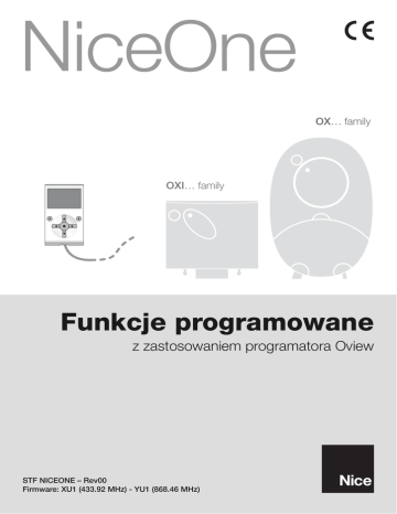 NiceOne OX… family OXI… family Funkcje programowane z zastosowaniem programatora Oview STF NICEONE – Rev00 Firmware: XU1 (433.92 MHz) - YU1 (868.46 MHz) FUNKCJE PODSTAWOWE nazwa Parametr ten pozwala na nadanie automatyce nowej, indywidualnej nazwy, która będzie ułatwiać jej identyfikację (np. brama północna). Nazwa może składać się maksymalnie z 24 znaków (wraz ze spacjami). zestaw Wartość tego parametru może zawierać się w przedziale pomiędzy 0 a 63. Ustawienie fabryczne to “0”. Zestaw to numer, który obowiązkowo musi zostać przypisany każdemu siłownikowi, odbiornikowi lub innemu urządzeniu, które potencjalnie mogłoby zostać podłączone do sieci BusT4, w celu określenia jego “obszaru przynależności”. Dzięki temu później, podczas użytkowania instalacji złożonej z kilku automatyk będzie istniała możliwość wydawania poleceń jednocześnie wszystkim urządzeniom o takim samym numerze zestawu. adres Wartość tego parametru może zawierać się w przedziale pomiędzy 1 a 128. Ustawienie fabryczne to 2 dla Odbiorników oraz 3 dla Centralek. Adres to numer, który obowiązkowo musi zostać przypisany każdemu siłownikowi, odbiornikowi lub innemu urządzeniu, które potencjalnie mogłoby zostać podłączone do sieci BusT4, w celu odróżnienia go od innych urządzeń tworzących zestaw. W związku z tym urządzenia składające się na jeden zestaw muszą posiadać odrębne adresy. wersja firmware (bez możliwości zmiany) Funkcja ta pozwala na wizualizację wersji firmware wbudowanej w urządzenie. wersja hardware (bez możliwości zmiany)) Funkcja ta pozwala na wizualizację wersji hardware wbudowanej w urządzenie. numer seryjny (bez możliwości zmiany) Funkcja ta pozwala na wizualizację numeru seryjnego, dzięki któremu można jednoznacznie zidentyfikować urządzenie. Każde urządzenie - nawet tego samego modelu - posiada swój indywidualny numer. FUNKCJE RADIOWE hasło instalatora Hasło może składać się z maksimum 6 znaków alfanumerycznych. Uwaga! – Hasło nie może zawierać wielkich liter. Dzięki tej funkcji istnieje możliwość ograniczania dostępu osobom nieupoważnionym do wszystkich lub tylko niektórych funkcji programowania urządzenia. Jeśli urządzenie jest chronione hasłem, przed rozpoczęciem sesji programowania należy zalogować się, a po jej zakończeniu należy wylogować się. Pamiętaj – dzięki procedurze wylogowania uniemożliwiasz dostęp osobom nieupoważnionym. Uwaga! – Jeśli przewidujesz wprowadzenie hasła do kilku urządzeń (na przykład Oview, Centrali sterującej, Odbiornika itd.), zaleca się użycie tego samego hasła dla wszystkich urządzeń, włącznie z Oview. Dzięki temu podczas korzystania z Oview lub z powiązanego z nim oprogramowania nie będziesz musiał logować się za każdym razem, kiedy będziesz zmieniał urządzenie. klucze opera Funkcja ta pozwalana na personalizację odbiornika poprzez nadanie jego kluczowi numeru indywidualnego. Dostępne są następujące klucze “Klucz O-Box”, “Klucz Instalatora”, “Klucz Instalacji” oraz “ Klucz Altera(*)”. (*)Pamiętaj – Klucz “Altera” jest kompatybilny z odbiornikiem z serii “FloR”. WAŻNE: – Po wprowadzeniu zmian w kluczach odbiornika, te same zmiany należy wprowadzić również do przypisanego nadajnika oraz do O-Box, o ile urządzenie to jest wykorzystywane do programowania nadajników. – Po wprowadzeniu zmian w kluczu należy zachować jego nowy numer, w przeciwnym razie będzie niemożliwe odczytanie oraz zmiana danych i kodów wczytanych do odbiornika. certyfikaty Funkcja ta pozwala na odczyt i ustawienie certyfikatów odbiornika. “Certyfikat” to indywidualny numer (zaprogramowany fabrycznie i zapisany na karcie towarzyszącej każdemu odbiornikowi), który identyfikuje i wyróżnia poszczególne odbiorniki. 2 – NiceOne Używanie certyfikatu upraszcza procedurę wczytywania nadajnika do odbiornika, ponieważ instalator nie musi znajdować się w zasięgu odbiornika. Na ekranie można wpisać 4 certyfikaty: patrząc od góry, pierwszy (1) jest przypisany oryginalnemu certyfikatowi odbiornika a pozostałe trzy (2 - 3 - 4) są przeznaczone na ewentualne certyfikaty personalizowane. Pamiętaj – Więcej informacji odnośnie zastosowania certyfikatów znajdziesz w instrukcji “NiceOpera System Book”. zarządzanie kodami radiowymi Funkcja ta pozwala na zarządzanie kodami radiowymi Odbiornika, a w szczególności: – tworzenie nowego kodu: wybierz przycisk “Nowy”; wpisz nowy kod i zapisz go wciskając przycisk “Potwierdź”; – odbiór kodu przesyłanego przez nadajnik: wybierz “Odbierz od TX”; – wyszukiwanie istniejącego kodu: wybierz “Szukaj”; – zmianę istniejącego kodu: jeśli Odbiornik, w którym należy wprowadzić zmianę został już wybrany, wybierz przycisk “Zmień” i przystąp do zmiany danych. W przeciwnym razie musisz najpierw znaleźć urządzenie przy użyciu przycisku “Szukaj”; – usunięcie istniejącego kodu: jeśli Odbiornik, w którym należy wprowadzić zmianę został już wybrany, wybierz przycisk “Usuń” i przystąp do usuwania danych. W przeciwnym razie musisz najpierw znaleźć urządzenie przy użyciu przycisku “Szukaj”. usuwanie pamięci Funkcja ta pozwala na usunięcie danych znajdujących się w pamięci Odbiornika. Istnieje możliwość usunięcia kodów (Kody), kodów i kluczy razem (Kody i Klucze) lub wszystkich wczytanych parametrów (Wszystko), przywracając w ten sposób Odbiornikowi ustawienia fabryczne. FUNKCJE ZAAWANSOWANE historia zdarzeń Funkcja ta pozwala na wizualizację “zdarzeń” wytworzonych lub odebranych przez Centralę. Przez “zdarzenie” rozumie się sytuację, która zmienia stan pracy Centrali jak na przykład: aktywacja jednego z wejść, zakończenie manewru, zadziałanie fotokomórki lub wejścia alt, itd. Wizualizacja obejmuje datę oraz rodzaj zdarzenia. pozwolenia użytkownika 