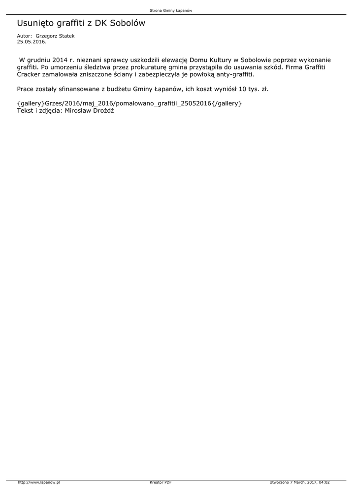 graffiti. Po umorzeniu śledztwa przez prokuraturę gmina przystąpiła do usuwania szkód. Firma Graffiti