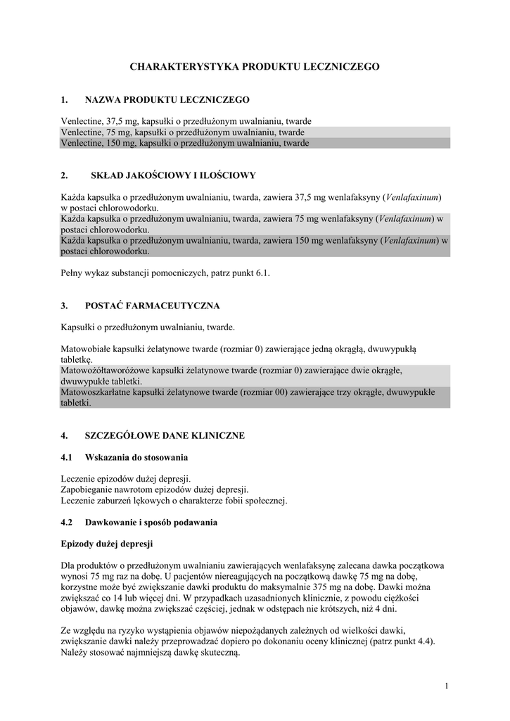 CHARAKTERYSTYKA PRODUKTU LECZNICZEGO 1. NAZWA PRODUKTU LECZNICZEGO Venlectine, 37,5 mg, kapsułki o przedłużonym uwalnianiu, twarde Venlectine, 75 mg, kapsułki o przedłużonym uwalnianiu, twarde Venlectine, 150 mg, kapsułki o przedłużonym uwalnianiu, twarde 2. SKŁAD JAKOŚCIOWY I ILOŚCIOWY Każda kapsułka o przedłużonym uwalnianiu, twarda, zawiera 37,5 mg wenlafaksyny (Venlafaxinum) w postaci chlorowodorku. Każda kapsułka o przedłużonym uwalnianiu, twarda, zawiera 75 mg wenlafaksyny (Venlafaxinum) w postaci chlorowodorku. Każda kapsułka o przedłużonym uwalnianiu, twarda, zawiera 150 mg wenlafaksyny (Venlafaxinum) w postaci chlorowodorku. Pełny wykaz substancji pomocniczych, patrz punkt 6.1. 3. POSTAĆ FARMACEUTYCZNA Kapsułki o przedłużonym uwalnianiu, twarde. Matowobiałe kapsułki żelatynowe twarde (rozmiar 0) zawierające jedną okrągłą, dwuwypukłą tabletkę. Matowożółtaworóżowe kapsułki żelatynowe twarde (rozmiar 0) zawierające dwie okrągłe, dwuwypukłe tabletki. Matowoszkarłatne kapsułki żelatynowe twarde (rozmiar 00) zawierające trzy okrągłe, dwuwypukłe tabletki. 4. SZCZEGÓŁOWE DANE KLINICZNE 4.1 Wskazania do stosowania Leczenie epizodów dużej depresji. Zapobieganie nawrotom epizodów dużej depresji. Leczenie zaburzeń lękowych o charakterze fobii społecznej. 4.2 Dawkowanie i sposób podawania Epizody dużej depresji Dla produktów o przedłużonym uwalnianiu zawierających wenlafaksynę zalecana dawka początkowa wynosi 75 mg raz na dobę. U pacjentów niereagujących na początkową dawkę 75 mg na dobę, korzystne może być zwiększanie dawki produktu do maksymalnie 375 mg na dobę. Dawki można zwiększać co 14 lub więcej dni. W przypadkach uzasadnionych klinicznie, z powodu ciężkości objawów, dawkę można zwiększać częściej, jednak w odstępach nie krótszych, niż 4 dni. Ze względu na ryzyko wystąpienia objawów niepożądanych zależnych od wielkości dawki, zwiększanie dawki należy przeprowadzać dopiero po dokonaniu oceny klinicznej (patrz punkt 4.4). Należy stosować najmniejszą dawkę skuteczną. 1 Pacjentów należy leczyć przez wystarczająco długi okres, zazwyczaj kilka miesięcy lub dłużej. Należy regularnie dokonywać oceny leczenia, podchodząc indywidualnie do każdego pacjenta. Długotrwała terapia może być również odpowiednia w zapobieganiu nawrotom epizodów dużej depresji. U większości pacjentów dawka zalecana w zapobieganiu nawrotom epizodów dużej depresji jest taka sama, jak dawka stosowana podczas leczenia ostatniego epizodu depresji. Stosowanie leków przeciwdepresyjnych należy kontynuować przez co najmniej 6 miesięcy od czasu osiągnięcia remisji. Fobia społeczna Dla produktów o przedłużonym uwalnianiu zawierających wenlafaksynę zalecana dawka wynosi 75 mg raz na dobę. Brak dowodów, które by świadczyły, że większe dawki przynoszą dodatkowe korzyści. U pacjentów, którzy nie reagują na początkową dawkę 75 mg na dobę, można jednak rozważyć zwiększenie dawki produktu do maksymalnie 225 mg na dobę. Dawki można zwiększać co 14 lub więcej dni. Ze względu na ryzyko wystąpienia objawów niepożądanych zależnych od wielkości dawki, zwiększanie dawki należy przeprowadzać dopiero po dokonaniu oceny klinicznej (patrz punkt 4.4). Należy stosować najmniejszą dawkę skuteczną. Pacjentów należy leczyć przez wystarczająco długi okres, zazwyczaj kilka miesięcy lub dłużej. Należy regularnie dokonywać oceny leczenia, podchodząc indywidualnie do każdego pacjenta. Pacjenci w podeszłym wieku Nie jest konieczne zmienianie dawkowania wenlafaksyny tylko ze względu na wiek pacjenta. Stosując produkt u pacjentów w podeszłym wieku należy jednak zachować szczególną ostrożność (m. in. z powodu zwiększonego ryzyka zaburzenia czynności nerek, możliwych zmian dotyczących wrażliwości oraz powinowactwa neuroprzekaźników, co następuje wraz z wiekiem). Zawsze należy stosować najmniejszą dawkę skuteczną, a w razie konieczności zwiększenia dawki produktu należy szczególnie dokładnie monitorować stan pacjenta. Dzieci i młodzież poniżej 18 lat Wenlafaksyna nie jest zalecana do stosowania u dzieci i młodzieży. W kontrolowanych badaniach klinicznych przeprowadzonych u dzieci i młodzieży z epizodami dużej depresji nie udało się wykazać skuteczności i nie uzasadniają one stosowania wenlafaksyny w tej grupie pacjentów (patrz punkt 4.4 i 4.8). Nie określono bezpieczeństwa stosowania ani skuteczności wenlafaksyny u dzieci i młodzieży poniżej 18 lat w innych wskazaniach. Pacjenci z zaburzeniami czynności wątroby Ogólnie, u pacjentów z łagodnymi i umiarkowanymi zaburzeniami czynności wątroby należy rozważyć zmniejszenie dawki o 50%. Jednak ze względu na zmienność międzyosobniczą klirensu, może być konieczne indywidualne dostosowanie dawkowania dla danego pacjenta. Dane dotyczące pacjentów z ciężkimi zaburzeniami czynności wątroby są ograniczone. Zaleca się zachowanie ostrożności oraz rozważenie zmniejszenia dawki o ponad 50%. Podczas leczenia 2 pacjentów z ciężkimi zaburzeniami czynności wątroby należy rozważyć potencjalne korzyści względem ryzyka. Pacjenci z zaburzeniami czynności nerek Chociaż u pacjentów ze współczynnikiem przesączania kłębuszkowego (GFR) wynoszącym od 30 do 70 ml/minutę zmiana dawkowania nie jest konieczna, to jednak zaleca się zachowanie ostrożności. U pacjentów wymagających hemodializy oraz pacjentów z ciężkimi zaburzeniami czynności nerek (GFR <30 ml/min) dawkę należy zmniejszyć o 50%. Z powodu zmienności międzyosobniczej klirensu w tej grupie pacjentów może być konieczne indywidualne dostosowanie dawkowania dla danego pacjenta. Objawy odstawienia obserwowane w trakcie przerywania leczenia wenlafaksyną Należy unikać nagłego odstawiania produktu. W przypadku przerywania terapii wenlafaksyną, w celu zmniejszenia ryzyka wy