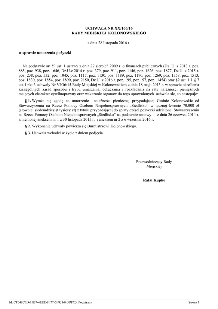 UCHWAŁA NR XX/166/16 RADY MIEJSKIEJ KOLONOWSKIEGO z dnia 28 listopada 2016 r. w sprawie umorzenia pożyczki Na podstawie art.59 ust. 1 ustawy z dnia 27 sierpień 2009 r. o finansach publicznych (Dz. U. z 2013 r. poz. 885, poz. 938, poz. 1646, Dz.U.z 2014 r. poz. 379, poz. 911, poz. 1146, poz. 1626, poz. 1877, Dz.U. z 2015 r. poz. 238, poz. 532, poz. 1045, poz. 1117, poz. 1130, poz. 1189, poz. 1190, poz. 1269, poz. 1358, poz. 1513, poz. 1830, poz. 1854, poz. 1890, poz. 2150, Dz.U. z 2016 r. poz. 195, poz.157, poz. 1454) oraz §2 ust. 1 i § 7 ust.1 pkt 3 uchwały Nr VI/36/15 Rady Miejskiej w Kolonowskiem z dnia 18 maja 2015 r. w sprawie określenia szczególnych zasad sposobu i trybu umarzania, odraczania i rozkładania na raty należności pieniężnych mających charakter cywilnoprawny oraz wskazanie organów do tego uprawnionych uchwala się, co następuje: § 1. Wyraża się zgodę na umorzenie należności pieniężnej przypadającej Gminie Kolonowskie od Stowarzyszenia na Rzecz Pomocy Osobom Niepełnosprawnych „Siedlisko” w łącznej kwocie 70.000 zł (słownie: siedemdziesiąt tysięcy zł) z tytułu przypadającej do spłaty części pożyczki udzielonej Stowarzyszeniu na Rzecz Pomocy Osobom Niepełnosprawnych „Siedlisko” na podstawie umowy z dnia 26 czerwca 2014 r. zmienionej aneksem nr 1 z 30 listopada 2015 r. i aneksem nr 2 z 6 września 2016 r. § 2. Wykonanie uchwały powierza się Burmistrzowi Kolonowskiego. § 3. Uchwała wchodzi w życie z dniem podjęcia. Przewodniczący Rady Miejskiej Rafał Kupke Id: CF648C7D-15B7-4EEE-8F77-6F83144BDFC5. Podpisany Strona 1 Uzasadnienie Uchwałą Nr XXXIX/324/14 19 maja 2014 r. Rada Miejska w Kolonowskiem udzieliła pożyczki Stowarzyszeniu na Rzecz Pomocy Osobom Niepełnosprawnym „Siedlisko”. Burmistrz Kolonowskiego 26 czerwca 2014 r. zawarł umowę pożyczki na kwotę 200 000 zł, aneksem Nr 1 z 30 listopada 2015 r. i aneksem nr 2 z 6 września 2016 r. zmienił termin spłaty pożyczki. Zgodnie z umową pożyczkobiorca zobowiązał się do dokonania zwrotu pełnej kwoty pożyczki do 20 grudnia 2016 r. W dniu 29 czerwca 2016 r. Stowarzyszenie na Rzecz Pomocy Osobom Niepełnosprawnym „Siedlisko” dokonało zwrotu w wysokości 130 000 zł. W dniu 17 października 2016 r. wpłynął wniosek Stowarzyszenia na Rzecz Pomocy Osobom Niepełnosprawnym „Siedlisko” z prośbą o umorzenie należności w wysokości 70 000 zł. w związku z zaistnieniem okoliczności o których mowa w tym wniosku. Rada uwzględniając te okoliczności, w trakcie posiedzenia Komisji Budżetu i Finansów, jak również w trakcie sesji uznała za zasadne wyrażenie zgody na umorzenie ww. należności. Id: CF648C7D-15B7-4EEE-8F77-6F83144BDFC5. Podpisany Strona 1