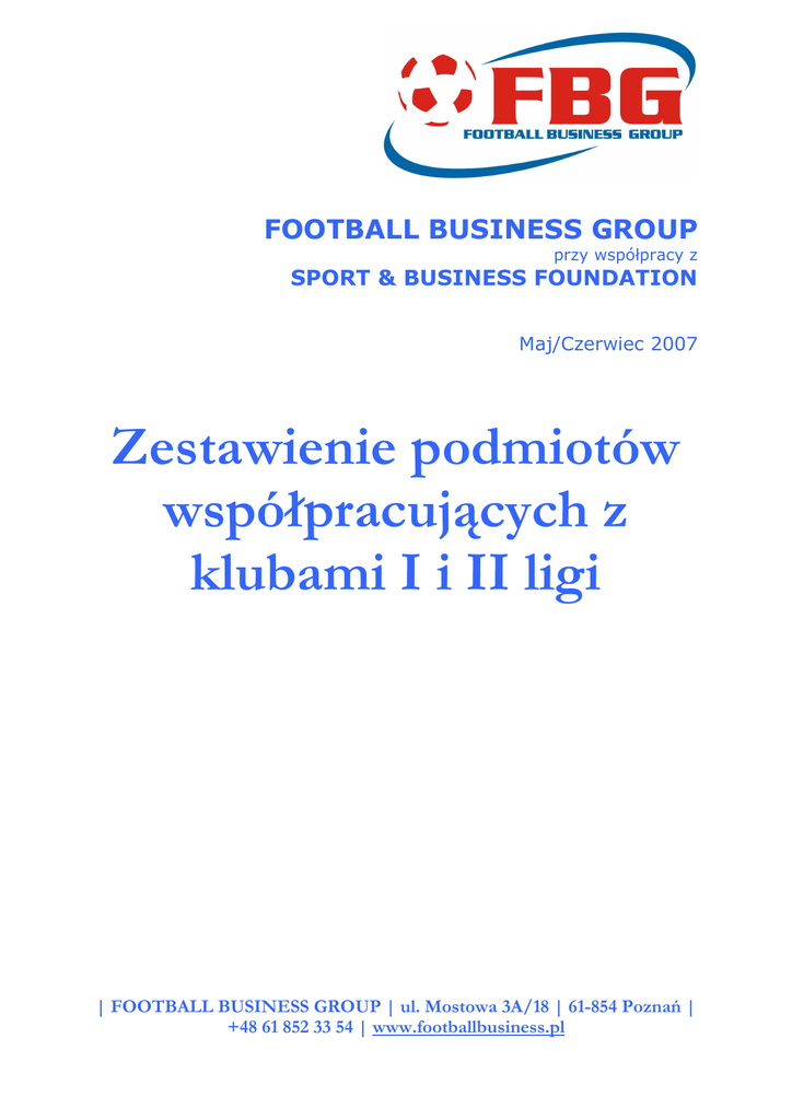 FOOTBALL BUSINESS GROUP przy współpracy z SPORT & BUSINESS FOUNDATION Maj/Czerwiec 2007 Zestawienie podmiotów współpracujących z klubami I i II ligi | FOOTBALL BUSINESS GROUP | ul. Mostowa 3A/18 | 61-854 Poznań | +48 61 852 33 54 | www.footballbusiness.pl Spis treści 1. Wprowadzenie .............................................................................. 3 2. Podmioty współpracujące z klubami I ligi i II ligi .............................. 4 3. Nomenklatura podmiotów współpracujących z klubami I i II ligi ......... 7 4. Branże podmiotów reklamujących się na stronach internetowych klubów I i II ligi. .......................................................................................... 9 Football Business Group 1. Wprowadzenie „Reklama jest dźwignią handlu” – głosi stare powiedzenie, dlatego aby móc skutecznie sprzedać dany produkt należy go skutecznie zareklamować. Często okazuje się to zasadniczą kwestią dla osiągnięcia sukcesu. Firmy, które rezygnują z reklamy mogą stracić sprzedaż i zyski kosztem firm prowadzących regularne kampanie reklamowe. Wybór odpowiadającego branży i firmie nośnika reklamy, który byłby najbardziej efektywny, nie jest sprawą łatwą. Ze względu na swoja popularność, sport, a w szczególności piłka nożna, jest doskonałym „kąskiem” dla reklamodawców. Stroje piłkarzy, stadiony i ich otoczenie czy programy meczowe są świetnymi nośnikami reklamy. W ostatniej dekadzie bardzo atrakcyjnym dla reklamodawców stał się także Internet. W dobie jego rozwoju, każdy dobrze rozwinięty pod względem marketingowym klub posiada swoją oficjalną stronę internetową, na której swoje logo, logotypy czy znaki firmowe umieszczają wszelkie podmioty współpracujące z klubem (sponsorzy, patroni medialni czy władze lokalne). Zjawisko to obserwujemy od pewnego czasu także w polskich klubach ligowych. W poniższym raporcie przedstawiamy i analizujemy zestawienie podmiotów, których logo bądź logotyp znaleźć można na oficjalnych witrynach internetowych klubów polskiej I i II ligi. Wszelkie dane opublikowane poniżej pochodzą z oficjalnych stron polskich klubów. 3 Football Business Group 2. Podmioty współpracujące z klubami I ligi i II ligi Na poniższym wykresie przedstawiony został rozkład podmiotów reklamujących się na oficjalnych stronach klubów Orange Ekstraklasy poprzez eksponowanie na nich swojego logo lub logotypu. *Dane aktualne na kwiecieć 2007 Klasyfikacji zdecydowanie przewodzi strona internetowa klubu Arka Gdynia, którą wyświetla reklamy aż 55 podmiotów, stawkę zamyka strona internetowa klubu Groclin Grodzisk, na której znaleźć można tylko 3 reklamujące się firmy. Średnia liczba podmiotów występująca na oficjalnych stronach klubów pierwszoligowych to 16, ich suma wynosi 254. 4 Football Business Group Na kolejnym wykresie przedstawiamy rozkład podmiotów umieszczających swoje logo lub logotyp na oficjalnych stronach klubów drugoligowych. *Dane aktualne na kwiecieć 2007 *Nie brano pod uwagę oficjalnej strony klubu Zawisza Bydgoszcz – klub wycofał się z rozgrywek Wyraźnym liderem jest strona internetowa klubu Lechia Gdańsk, na której znajdują się reklamy 27 podmiotów. Ranking zamykają strony internetowe klubów Podbeskidzie oraz Kmita Zabierzów, na których nie reklamują się żadne podmioty. Średnia liczba podmiotów występująca na stronach klubów drugiej ligi wynosi 7, a ich suma to 110. 5 Football Business Group Kolejny wykres przedstawia zbiorcze zestawienie 15 oficjalnych stron internetowych klubów pierwszej i drugiej ligi polskiej, które wyświetlają znaki największej liczby podmiotów. Spośród wszystkich klubów ujętych w zestawieniu 11 to kluby pierwszoligowe, 4 to kluby drugoligowe – oznaczone jaśniejszym kolorem. *Dane aktualne na kwiecieć 2007 *Nie brano pod uwagę oficjalnej strony klubu Zawisza Bydgoszcz – klub wycofał się z rozgrywek Wśród wszystkich podmiotów reklamujących się na oficjalnych witrynach polskich klubów, najbardziej aktywnymi firmami są: FIRMA ORANGE DOMINET WARKA JAKO GATORADE BET-AT-HOME ILOŚĆ STRON 10 9 6 4 4 4 6 Football Business Group 3. Nomenklatura podmiotów współpracujących z klubami I i II ligi Część klubów polskiej I i II ligi przyznaje swoim partnerom tytuł, który jest pewnego rodzaju określeniem poziomu zaawansowania współpracy między klubem a podmiotem. Najczęściej, tytuł jakim honoruje się dany podmiot zależny jest od jego wkładu finansowego w klub. Poniżej, w tabelach, przedstawiamy zestawienie podmiotów klubów I i II ligi oraz ich nazewnictwo stosowane na oficjalnych witrynach klubowych. KLUB LICZBA PODMIOTÓW TYTUŁ PODMIOTU STOSOWANY NA WITRYNIE KLUBOWEJ ORANGE EKSTRAKLASA Arka Gdynia 55 Cracovia Kraków 13 GKS Bełchatów 11 Górnik Łęczna 12 Górnik Zabrze Groclin Grodzisk 18 3 Korona Kielce 8 Lech Poznań 14 • • • • • • • • • • • • • • • • • • • • • • • • • • • 1 sponsor tytularny 2 sponsorów głównych 5 złotych partnerów 11 srebrnych partnerów 18 brązowych partnerów 10 żółto – niebieskich partnerów 1 partner 7 patronów medialnych 1 inwestor i główny sponsor 9 sponsorów – partnerów 3 patronów medialnych 11 sponsorów 1 sponsor strategiczny 11 sponsorów 18 partnerów – reklamodawców 3 sponsorów 3 sponsorów 3 partnerów 2 patronów medialnych 1 sponsor główny 1 sponsor strategiczny 1 sponsor techniczny 4 sponsorów 7 patronów medialnych 3 sponsorów głównych Legia Warszawa 14 ŁKS Łódź 12 Odra Wodzisław 9 • • 1 sponsor główny Pogoń Szczecin 7 • 7 sponsorów 11 sponsorów 12 sponsorów 8 partnerów 7 Football Business Group Widzew Łódź Wisła Kraków Wisła Płock Zagłębie Lubin 22 22 24 10 • • • • • • • 1 sponsor główny • • 3 sponsorów głównych • • • • • • • 1 sponsor oficjalny 2 sponsorów oficjalnych 