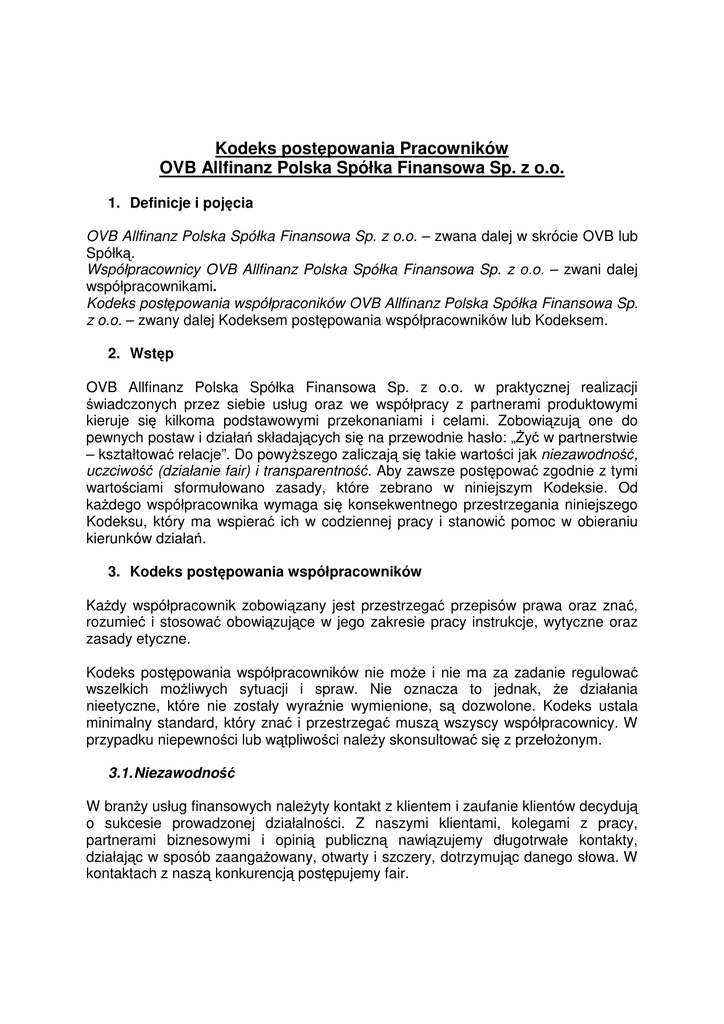 Kodeks postępowania Pracowników OVB Allfinanz Polska Spółka Finansowa Sp. z o.o. 1. Definicje i pojęcia OVB Allfinanz Polska Spółka Finansowa Sp. z o.o. – zwana dalej w skrócie OVB lub Spółką. Współpracownicy OVB Allfinanz Polska Spółka Finansowa Sp. z o.o. – zwani dalej współpracownikami. Kodeks postępowania współpraconików OVB Allfinanz Polska Spółka Finansowa Sp. z o.o. – zwany dalej Kodeksem postępowania współpracowników lub Kodeksem. 2. Wstęp OVB Allfinanz Polska Spółka Finansowa Sp. z o.o. w praktycznej realizacji świadczonych przez siebie usług oraz we współpracy z partnerami produktowymi kieruje się kilkoma podstawowymi przekonaniami i celami. Zobowiązują one do pewnych postaw i działań składających się na przewodnie hasło: „Żyć w partnerstwie – kształtować relacje”. Do powyższego zaliczają się takie wartości jak niezawodność, uczciwość (działanie fair) i transparentność. Aby zawsze postępować zgodnie z tymi wartościami sformułowano zasady, które zebrano w niniejszym Kodeksie. Od każdego współpracownika wymaga się konsekwentnego przestrzegania niniejszego Kodeksu, który ma wspierać ich w codziennej pracy i stanowić pomoc w obieraniu kierunków działań. 3. Kodeks postępowania współpracowników Każdy współpracownik zobowiązany jest przestrzegać przepisów prawa oraz znać, rozumieć i stosować obowiązujące w jego zakresie pracy instrukcje, wytyczne oraz zasady etyczne. Kodeks postępowania współpracowników nie może i nie ma za zadanie regulować wszelkich możliwych sytuacji i spraw. Nie oznacza to jednak, że działania nieetyczne, które nie zostały wyraźnie wymienione, są dozwolone. Kodeks ustala minimalny standard, który znać i przestrzegać muszą wszyscy współpracownicy. W przypadku niepewności lub wątpliwości należy skonsultować się z przełożonym. 3.1. Niezawodność W branży usług finansowych należyty kontakt z klientem i zaufanie klientów decydują o sukcesie prowadzonej działalności. Z naszymi klientami, kolegami z pracy, partnerami biznesowymi i opinią publiczną nawiązujemy długotrwałe kontakty, działając w sposób zaangażowany, otwarty i szczery, dotrzymując danego słowa. W kontaktach z naszą konkurencją postępujemy fair. Relacje z klientami i partnerami biznesowymi Współpracownik OVB obowiązany jest: 1. zachować uczciwość, solidność i lojalność przy wykonywaniu czynności pośrednictwa ubezpieczeniowego; 2. postępować w dobrze rozumianym interesie klienta, w dobrej wierze oraz z należytą starannością; należy mieć na uwadze, że zasada dobrej wiary nie wyklucza zasady ograniczonego zaufania ze względu na dobro innych klientów, OVB i osób trzecich; 3. oferować klientom produkty ubezpieczeniowe odpowiadające pod względem rodzaju i zakresu ubezpieczenia ich potrzebom i możliwościom, zgodnie z najlepszą wiedzą, uzupełnioną o etyczną i profesjonalną poradę w zakresie wyboru optymalnego dla ubezpieczającego wariantu ubezpieczenia; 4. wyjaśniać różnice pomiędzy poszczególnymi produktami ubezpieczeniowymi oferowanymi przez OVB, ze zwróceniem uwagi klienta na korzyści, które gwarantuje dany produkt, oraz takie, które może on uzyskać poprzez zawarcie dodatkowych klauzul do umowy ubezpieczenia; 5. rzetelnie informować klienta o warunkach umowy ubezpieczenia; 6. nie stosować sformułowań mogących wprowadzić ewentualnych klientów w błąd, między innymi co do zakresu ochrony ubezpieczeniowej i warunków umowy ubezpieczenia oraz celu zawarcia umowy ubezpieczenia; 7. sugerować klientowi celowość działań prewencyjnych, mających na celu ograniczenie ryzyka, a tym samym kosztów ubezpieczenia; 8. informować klienta o przysługujących mu prawach i obowiązkach; 9. nie przyjmować od klientów żadnego typu wynagrodzeń i prezentów; 10. nie proponować klientowi wynagrodzeń w zamian za zawarcie umowy; 11. dochować tajemnicy zawodowej, zabezpieczyć informacje o klientach i zawartych umowach ubezpieczenia; 12. dbać o klienta, udzielać mu fachowej pomocy w czasie całego okresu trwania umowy ubezpieczenia. Współpracownik OVB w szczególności nie może: 1. wymuszać na kliencie rezygnacji z wiążącej go umowy ubezpieczenia ani zmiany jej warunków; 2. sprzeciwiać się decyzji klienta co do wyboru lub zmiany pośrednika ubezpieczeniowego, a także wymuszać na kliencie dokonania tej zmiany; 3. ujawniać, z wyłączeniem przypadków określonych przez przepisy prawa, informacji o klientach i umowach ubezpieczenia; 4. zatajać przed klientem ważnych dla niego informacji ani wprowadzać go w błąd; 5. uzależniać jakość obsługi klienta od wysokości osiąganego dochodu z tytułu danej umowy ubezpieczenia Relacje z OVB Współpracownik OVB obowiązany jest: 1. przyczyniać się do realizacji wizji i misji firmy, sumiennie wykonując swoje obowiązki zawodowe; 2. dokładać starań do rozwoju i wzrostu pozycji OVB na rynku; 3. wykorzystywać w pełni ofertę produktową oraz dążyć do tego, aby klient posiadał wiele produktów z oferty OVB; 4. dbać o dobre imię OVB; 5. informować OVB o podaniu przez ubezpieczającego nieprawdziwych danych lub zatajeniu prawdy, przy wypełnianiu dokumentów związanych z zawieraniem lub obsługą umów ubezpieczenia; 6. powiadamiać OVB o okolicznościach towarzyszących zawieraniu umowy ubezpieczenia wskazujących, że wartości majątkowe mogą pochodzić z nielegalnych lub nieujawnionych źródeł, aby przeciwdziałać wprowadzaniu do obrotu finansowego takich wartości majątkowych; 7. dochować tajemnicy zawodowej. Współpracownik OVB powinien: 1. przestrzegać terminowości i punktualności oraz ogólnie przyjętych form kultury organizacyjnej w bezpośrednich kontaktach, korespondencji i przekazywaniu informacji; 2. dążyć do podnoszenia swoich kwalifikacji zawodowych i poziomu wiedzy; 3. dbać o dobry wizerunek zawodu agenta; 4. dbać o swój
