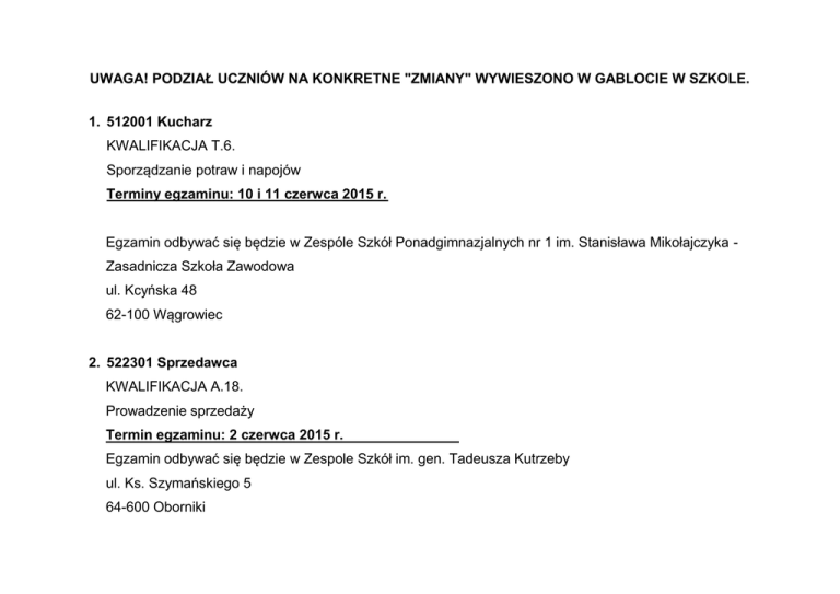 UWAGA! PODZIAŁ UCZNIÓW NA KONKRETNE "ZMIANY" WYWIESZONO W GABLOCIE W SZKOLE. 1. 512001 Kucharz KWALIFIKACJA T.6. Sporządzanie potraw i napojów Terminy egzaminu: 10 i 11 czerwca 2015 r. Egzamin odbywać się będzie w Zespóle Szkół Ponadgimnazjalnych nr 1 im. Stanisława Mikołajczyka Zasadnicza Szkoła Zawodowa ul. Kcyńska 48 62-100 Wągrowiec 2. 522301 Sprzedawca KWALIFIKACJA A.18. Prowadzenie sprzedaży Termin egzaminu: 2 czerwca 2015 r. Egzamin odbywać się będzie w Zespole Szkół im. gen. Tadeusza Kutrzeby ul. Ks. Szymańskiego 5 64-600 Oborniki 3. 351203 Technik informatyk KWALIFIKACJA E.12. Montaż i eksploatacja komputerów osobistych oraz urządzeń peryferyjnych Termin egzaminu: 24 czerwca 2015 r., sala 216 4. 351203 Technik informatyk KWALIFIKACJA E.13. Projektowanie lokalnych sieci komputerowych i administrowanie sieciami Termin egzaminu: 25 czerwca 2015 r. sala 216 5. 311504 Technik mechanik KWALIFIKACJA M.19. Użytkowanie obrabiarek skrawających Egzamin odbywać się będzie w Poznańskim Centrum Edukacji Ustawicznej i Praktycznej, ul. Jawornicka 1 60-161 Poznań Terminy egzaminów: 28 i 29 maja 2015 r.