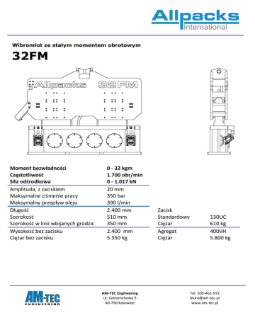Wibromłot ze stałym momentem obrotowym 32FM Moment bezwładności Częstotliwość Siła odśrodkowa Amplituda, z zaciskiem Maksymalne ciśnienie pracy Maksymalny przepływ oleju Długość Szerokość Szerokość w linii wbijanych grodzic Wysokość bez zacisku Ciężar bez zacisku 0 - 32 kgm 1.700 obr/min 0 - 1.017 kN 20 mm 350 bar 390 l/min 2.400 mm 510 mm 350 mm 2.400 mm 5.350 kg AM-TEC Engineering ul. Czeremchowa 5 40-750 Katowice Zacisk Standardowy Ciężar Agregat Ciężar 130UC 610 kg 400VH 5.800 kg Tel. 505-451-972 [email protected] www.am-tec.pl