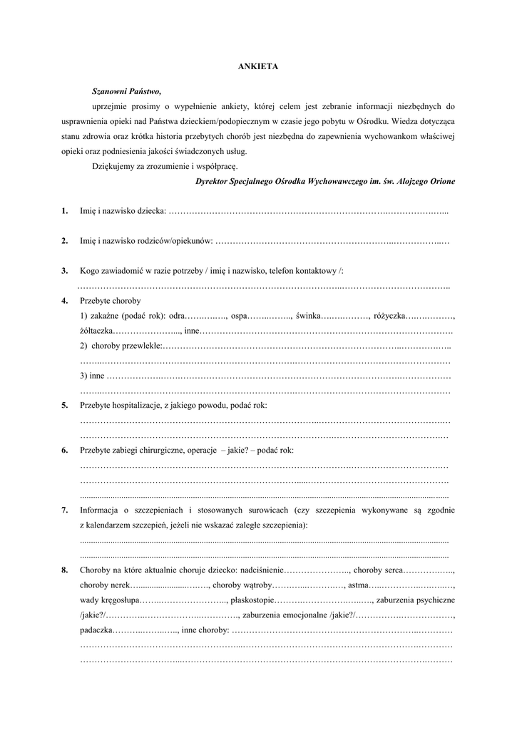 ANKIETA Szanowni Państwo, uprzejmie prosimy o wypełnienie ankiety, której celem jest zebranie informacji niezbędnych do usprawnienia opieki nad Państwa dzieckiem/podopiecznym w czasie jego pobytu w Ośrodku. Wiedza dotycząca stanu zdrowia oraz krótka historia przebytych chorób jest niezbędna do zapewnienia wychowankom właściwej opieki oraz podniesienia jakości świadczonych usług. Dziękujemy za zrozumienie i współpracę. Dyrektor Specjalnego Ośrodka Wychowawczego im. św. Alojzego Orione 1. Imię i nazwisko dziecka: ………………………………………………………………….…………….…... 2. Imię i nazwisko rodziców/opiekunów: ……………………………………………………..……………..… 3. Kogo zawiadomić w razie potrzeby / imię i nazwisko, telefon kontaktowy /: ………………………………………………………………………………..……………………………….. 4. Przebyte choroby 1) zakaźne (podać rok): odra…….….…., ospa……..…….., świnka….….………, różyczka….….………, żółtaczka…………………..., inne……………………………………………………………………………. 2) choroby przewlekłe:………………………………………………………………………..………….….. ……..………………………………………………………….……………………………………………… 3) inne ……………….…….………………………………………………………………….……………… ……..………………………………………………………….……………………………………………… 5. Przebyte hospitalizacje, z jakiego powodu, podać rok: ………………………………………………………………………..…………………………………….… …………………………………………………………………………….……………………………….… 6. Przebyte zabiegi chirurgiczne, operacje – jakie? – podać rok: ………………………………………………………………………………….………………………….… ………………………………………………………………….....…………………………………………. .......................................................................................................................................................................... 7. Informacja o szczepieniach i stosowanych surowicach (czy szczepienia wykonywane są zgodnie z kalendarzem szczepień, jeżeli nie wskazać zaległe szczepienia): .......................................................................................................................................................................... .......................................................................................................................................................................... 8. Choroby na które aktualnie choruje dziecko: nadciśnienie………………….., choroby serca………….….., choroby nerek…......................….…., choroby wątroby…….…...……….…, astma…..…………..….…..…, wady kręgosłupa……..………………….., płaskostopie……….…………….…..…., zaburzenia psychiczne /jakie?/…………..………………..…………., zaburzenia emocjonalne /jakie?/…………….………………, padaczka………..……..….., inne choroby: ………………………………………………………..………… ………………………………………………...…………………………………………………….………… ……………………………...………………………………………………………………………….……… 9. Obecnie największy problem zdrowotny dziecka: .............................................................................................................................................................................. .............................................................................................................................................................................. .............................................................................................................................................................................. 10. Czy dziecko jest pod stałą opieką lekarzy specjalistów – jakich? (podać adres placówki i tel. kontaktowy) .............................................................................................................................................................................. ………………………………………………………………….……………………………………………… .............................................................................................................................................................................. 11. Adres Przychodni Rodzinnej, w której jest zarejestrowany, oraz nazwisko lekarza. .............................................................................................................................................................................. .............................................................................................................................................................................. .............................................................................................................................................................................. 12. Leki, które przyjmuje na stałe, dawki leków, okres przez jaki ma mieć podawane leki, nazwisko lekarza zlecającego (proszę dołączyć PISEMNE ZLECENIE LEKARSKIE dla pielęgniarki na podawanie leków w Ośrodku) ……………………