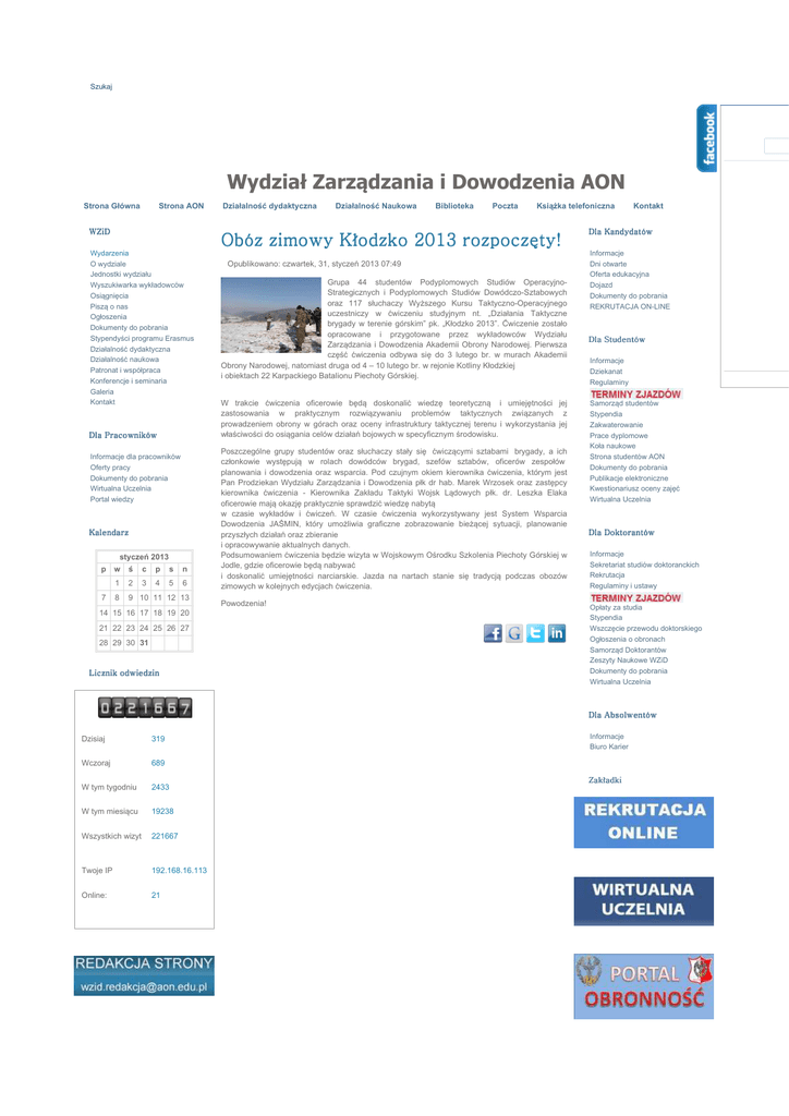 Szukaj Wydział Zarządzania i Dowodzenia AON Strona Główna Strona AON WZiD Działalność dydaktyczna Działalność Naukowa Biblioteka Poczta Książka telefoniczna Obóz zimowy K odzko 2013 rozpocz ty! Wydarzenia O wydziale Jednostki wydziału Wyszukiwarka wykładowców Osiągnięcia Piszą o nas Ogłoszenia Dokumenty do pobrania Stypendyści programu Erasmus Działalność dydaktyczna Działalność naukowa Patronat i współpraca Konferencje i seminaria Galeria Kontakt Dla Pracowników Informacje dla pracowników Oferty pracy Dokumenty do pobrania Wirtualna Uczelnia Portal wiedzy Kalendarz styczeń 2013 p w ś c p s n 7 1 2 3 4 5 6 8 9 10 11 12 13 14 15 16 17 18 19 20 21 22 23 24 25 26 27 28 29 30 31 Licznik odwiedzin Opublikowano: czwartek, 31, styczeń 2013 07:49 Grupa 44 studentów Podyplomowych Studiów OperacyjnoStrategicznych i Podyplomowych Studiów Dowódczo-Sztabowych oraz 117 słuchaczy Wyższego Kursu Taktyczno-Operacyjnego uczestniczy w ćwiczeniu studyjnym nt. „Działania Taktyczne brygady w terenie górskim” pk. „Kłodzko 2013”. Ćwiczenie zostało opracowane i przygotowane przez wykładowców Wydziału Zarządzania i Dowodzenia Akademii Obrony Narodowej. Pierwsza część ćwiczenia odbywa się do 3 lutego br. w murach Akademii Obrony Narodowej, natomiast druga od 4 – 10 lutego br. w rejonie Kotliny Kłodzkiej i obiektach 22 Karpackiego Batalionu Piechoty Górskiej. W trakcie ćwiczenia oficerowie będą doskonalić wiedzę teoretyczną i umiejętności jej zastosowania w praktycznym rozwiązywaniu problemów taktycznych związanych z prowadzeniem obrony w górach oraz oceny infrastruktury taktycznej terenu i wykorzystania jej właściwości do osiągania celów działań bojowych w specyficznym środowisku. Poszczególne grupy studentów oraz słuchaczy stały się ćwiczącymi sztabami brygady, a ich członkowie występują w rolach dowódców brygad, szefów sztabów, oficerów zespołów planowania i dowodzenia oraz wsparcia. Pod czujnym okiem kierownika ćwiczenia, którym jest Pan Prodziekan Wydziału Zarządzania i Dowodzenia płk dr hab. Marek Wrzosek oraz zastępcy kierownika ćwiczenia - Kierownika Zakładu Taktyki Wojsk Lądowych płk. dr. Leszka Elaka oficerowie mają okazję praktycznie sprawdzić wiedzę nabytą w czasie wykładów i ćwiczeń. W czasie ćwiczenia wykorzystywany jest System Wsparcia Dowodzenia JAŚMIN, który umożliwia graficzne zobrazowanie bieżącej sytuacji, planowanie przyszłych działań oraz zbieranie i opracowywanie aktualnych danych. Podsumowaniem ćwiczenia będzie wizyta w Wojskowym Ośrodku Szkolenia Piechoty Górskiej w Jodle, gdzie oficerowie będą nabywać i doskonalić umiejętności narciarskie. Jazda na nartach stanie się tradycją podczas obozów zimowych w kolejnych edycjach ćwiczenia. Powodzenia! Kontakt Dla Kandydatów Informacje Dni otwarte Oferta edukacyjna Dojazd Dokumenty do pobrania REKRUTACJA ON-LINE Dla Studentów Informacje Dziekanat Regulaminy Samorząd studentów Stypendia Zakwaterowanie Prace dyplomowe Koła naukowe Strona studentów AON Dokumenty do pobrania Publikacje elektroniczne Kwestionariusz oceny zajęć Wirtualna Uczelnia Dla Doktorantów Informacje Sekretariat studiów doktoranckich Rekrutacja Regulaminy i ustawy Opłaty za studia Stypendia Wszczęcie przewodu doktorskiego Ogłoszenia o obronach Samorząd Doktorantów Zeszyty Naukowe WZiD Dokumenty do pobrania Wirtualna Uczelnia Dla Absolwentów Dzisiaj 319 Wczoraj 689 W tym tygodniu 2433 W tym miesiącu 19238 Wszystkich wizyt 221667 Twoje IP 192.168.16.113 Online: 21 Informacje Biuro Karier Zak adki