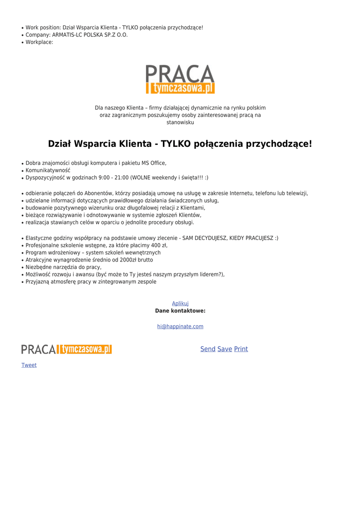● ● ● Work position: Dział Wsparcia Klienta - TYLKO połączenia przychodzące! Company: ARMATIS-LC POLSKA SP.Z O.O. Workplace: Dla naszego Klienta – firmy działającej dynamicznie na rynku polskim oraz zagranicznym poszukujemy osoby zainteresowanej pracą na stanowisku Dział Wsparcia Klienta - TYLKO połączenia przychodzące! ● ● ● ● ● ● ● ● ● ● ● ● ● ● ● Dobra znajomości obsługi komputera i pakietu MS Office, Komunikatywność Dyspozycyjność w godzinach 9:00 - 21:00 (WOLNE weekendy i święta!!! :) odbieranie połączeń do Abonentów, którzy posiadają umowę na usługę w zakresie Internetu, telefonu lub telewizji, udzielane informacji dotyczących prawidłowego działania świadczonych usług, budowanie pozytywnego wizerunku oraz długofalowej relacji z Klientami, bieżące rozwiązywanie i odnotowywanie w systemie zgłoszeń Klientów, realizacja stawianych celów w oparciu o jednolite procedury obsługi. Elastyczne godziny współpracy na podstawie umowy zlecenie - SAM DECYDUJESZ, KIEDY PRACUJESZ :) Profesjonalne szkolenie wstępne, za które płacimy 400 zł, Program wdrożeniowy – system szkoleń wewnętrznych Atrakcyjne wynagrodzenie średnio od 2000zł brutto Niezbędne narzędzia do pracy, Możliwość rozwoju i awansu (być może to Ty jesteś naszym przyszłym liderem?), Przyjazną atmosferę pracy w zintegrowanym zespole Aplikuj Dane kontaktowe: [email protected] Send Save Print Tweet