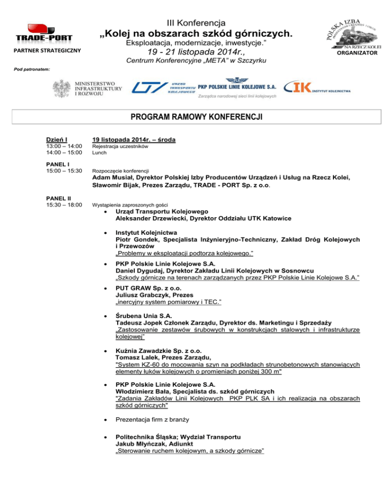 III Konferencja „Kolej na obszarach szkód górniczych. Eksploatacja, modernizacje, inwestycje.” PARTNER STRATEGICZNY 19 - 21 listopada 2014r., ORGANIZATOR Centrum Konferencyjne „META” w Szczyrku Pod patronatem: PROGRAM RAMOWY KONFERENCJI Dzień I 19 listopada 2014r. – środa 13:00 – 14:00 14:00 – 15:00 Rejestracja uczestników Lunch PANEL I 15:00 – 15:30 Rozpoczęcie konferencji Adam Musiał, Dyrektor Polskiej Izby Producentów Urządzeń i Usług na Rzecz Kolei, Sławomir Bijak, Prezes Zarządu, TRADE - PORT Sp. z o.o. PANEL II 15:30 – 18:00 Wystąpienia zaproszonych gości Urząd Transportu Kolejowego Aleksander Drzewiecki, Dyrektor Oddziału UTK Katowice Instytut Kolejnictwa Piotr Gondek, Specjalista Inżynieryjno-Techniczny, Zakład Dróg Kolejowych i Przewozów „Problemy w eksploatacji podtorza kolejowego.” PKP Polskie Linie Kolejowe S.A. Daniel Dygudaj, Dyrektor Zakładu Linii Kolejowych w Sosnowcu „Szkody górnicze na terenach zarządzanych przez PKP Polskie Linie Kolejowe S.A.” PUT GRAW Sp. z o.o. Juliusz Grabczyk, Prezes „inercyjny system pomiarowy i TEC.” Śrubena Unia S.A. Tadeusz Jopek Członek Zarządu, Dyrektor ds. Marketingu i Sprzedaży „Zastosowanie zestawów śrubowych w konstrukcjach stalowych i infrastrukturze kolejowej” Kuźnia Zawadzkie Sp. z o.o. Tomasz Lalek, Prezes Zarządu, "System KZ-60 do mocowania szyn na podkładach strunobetonowych stanowiących elementy łuków kolejowych o promieniach poniżej 300 m" PKP Polskie Linie Kolejowe S.A. Włodzimierz Bała, Specjalista ds. szkód górniczych "Zadania Zakładów Linii Kolejowych PKP PLK SA i ich realizacja na obszarach szkód górniczych" Prezentacja firm z branży Politechnika Śląska; Wydział Transportu Jakub Młyńczak, Adiunkt „Sterowanie ruchem kolejowym, a szkody górnicze” 19:00 Uroczysta kolacja Wręczenie statuetek „SOLIDNY PARTNER TRADE – PORT” Pokaz mody: prezentacja mundurów i odzieży korporacyjnej Przedsiębiorstwo Odzieżowe – MODUS S.A. Dzień II 20 listopada 2014r. – czwartek 8:00 – 10:00 Śniadanie PANEL III 10:00 10:30 – 14:30 Zbiórka przed hotelem 15:00 – 16:00 Obiad PANEL IV 16:00 – 18.00 19:00 Indywidualne spotkania biznesowe 20:00 Wieczór – II edycja „Zawody TRADE – STRONG” (sala KOMINKOWA – hotel META) Dzień III 21 listopada 2014r. – piątek 7:00 – 9:00 10:00 Śniadanie Wyjazd studyjny – ŚRUBENA UNIA S.A. (zwiedzanie zakładu) Kolacja (restauracja hotel META) Dyskusja oraz podsumowanie konferencji. *)Organizator zastrzega sobie możliwość zmiany powyższego programu Zaproszeni do udziału zostali: Instytut Kolejnictwa, Urząd Transportu Kolejowego, PKP Polskie Linie Kolejowe S.A., Politechnika Śląska, Politechnika Wrocławska, Politechnika Krakowska, Akademia Górniczo Hutnicza, Przedsiębiorstwa z branży. Organizator: Polska Izba Producentów Urządzeń i Usług na rzecz Kolei, ul. Hetmańska 38, 85-039 Bydgoszcz Tel.: 52 324 93 80, tel./fax: 52 324 93 87 [email protected], www.izbakolei.pl www.gorniczeszkody.pl Do dyspozycji Gości konferencji: - bezpłatny parking, - łączność WiFi (strefa recepcja i restauracja), - bezpłatny Internet w pokojach, - bezpłatny relaks OAZA RELAKSU (sauna sucha, sauna ziołowa, łaźnia parowa, prysznic wrażeń, jacuzzi)