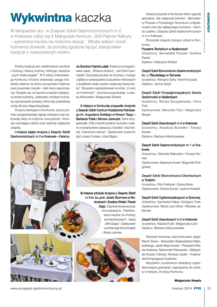 W listopadzie ub.r. w Zespole Szkół Gastronomicznych nr 2 w Krakowie odbył się X Małopolski Konkurs „Stół Pięknie Nakryty – wykwintna kaczka na rodzinne okazje”. Młodzi adepci sztuki kulinarnej dowiedli, że potrafią zgrabnie łączyć staropolskie tradycje z nowoczesnym stylem. ty Proszek z Prywatnego Technikum w Myślenicach oraz dla najlepszego kucharza – Kamila Łudzika z Zespołu Szkół Gastronomicznych nr 2 w Krakowie. Konkursy Wykwintna kaczka Goście przyznali w Konkursie dwie nagrody specjalne: dla najlepszej kelnerki – Bernadet- Pozostałe zespoły biorące udział w Konkursie: Prywatne Technikum w Myślenicach Uczestnicy: Bernadetta Proszek i Ewelina Pawlik Opiekun: Katarzyna Wróbel Polską tradycją jest celebrowanie spotkań na Grochot i Kamil Łudzik. Katarzyna przygoto- z bliższą i dalszą rodziną, hołdując zasadzie „czym chata bogata”. W X edycji krakowskie- wała napój: „Różana słodycz”, zaś Kamil spo- Zespół Szkół Ekonomiczno-Gastronomicznych rządził „Soczystą kaczkę na chutney z mango i jabłka w towarzystwie buraczków imbirowych im. J. Piłsudskiego w Tarnowie go Konkursu chciano skierować uwagę mło- z dodatkiem duetu sosów i prażonej morwy bia- Uczestnicy: Roksana Tyrka i Kamil Kurczab Opiekun: Janina Grzyb nej. Okazało się, że kaczka to bardzo wdzięcz- łej”. Wszystko zaprezentowali na stole „U cioci na imieninach”. Uczniów przygotowały: Ludwi- Zespół Szkół Ponadgimnazjalnych Szkoła ny temat kulinarny. Jedenastu młodych kucha- ka Marszałek i Małgorzata Smęda. Gościnności w Myślenicach dzieży właśnie na różne uroczystości rodzinne oraz przysmaki z kaczki – dziś nieco zapomnia- rzy wyczarowało potrawy, które były prawdziwą ucztą dla jury degustacyjnego. II miejsce w Konkursie przypadło drużynie Drużyny startujące w Konkursie, oprócz po- z Zespołu Szkół Centrum Kształcenia Rolnicze- Opiekunowie: Weronika Fijoł i Małgorzata traw, przygotowywały napoje mieszane oraz na- go im. Augustyna Suskiego w Nowym Targu – Bergel krywały stoły na rodzinne uroczystości. Komisje oceniające całość prac wyłoniły najlepsze Barbarze Polak i Monice Janeczek, które przygotowały „Filet z kaczki podany na purée z sele- zespoły. ra w towarzystwie carpaccio z buraka” oraz kok- Zespół Szkół Zawodowych nr 2 w Krakowie Uczestnicy: Arkadiusz Burnetko i Tomasz tajl „Czerwona rozkosz”. Opiekunami uczennic byli Łukasz Fudala i Józef Bąbol. Kwater Opiekun: Barbara Adamczewska I miejsce zajęła drużyna z Zespołu Szkół Gastronomicznych nr 2 w Krakowie – Katarzy- Uczestnicy: Renata Szczypkowska i Anna Fraś Zespół Szkół Gastronomicznych nr 1 w Krakowie Uczestnicy: Gabriela Makulska i Tomasz Nowak Opiekunowie: Seweryna Kurek i Bogumiła Podgórska Zespół Szkół Ekonomiczno-Chemicznych w Trzebini Uczestnicy: Piotr Feliksiak i Sylwia Mirek Opiekunowie: Dorota Suruło i Joanna Kulawik III miejsce zdobyła drużyna z Zespołu Szkół nr 3 im. ks. prof. Józefa Tischnera w Wadowicach: Ewelina Wolak i Paweł Zając. Zaprezentowana przez nich potrawa to: „Flambirowana kaczka na chutney pomarańczowym”, napój „Mint Grape”. Opiekunami uczniów były Anna Knapik i Marta Leśniak. Zespół Szkół Ogólnokształcących w Bobowej Uczestnicy: Agnieszka Habaj i Grzegorz Turek Opiekunowie: Marta Lach-Mruk i Wiesław Jabłoński Zespół Szkół Zawodowych nr 2 w Krakowie Uczestnicy: Natalia Pyzik i Małgorzata Łach Opiekun: Barbara Adamczewska Patronat honorowy nad Konkursem objęli: Marek Sowa – Marszałek Województwa Małopolskiego, Jacek Majchrowski – Prezydent Miasta Krakowa, Aleksander Palczewski – Małopolski Kurator Oświaty, Wiesław Jopek – Krakowska Kongregacja Kupiecka. Wszystkim uczestnikom składamy najserdeczniejsze gratulacje i zapraszamy do udziału w kolejnej, XI edycji Konkursu. Małgorzata Smęda www.przeglad-gastronomiczny.pl marzec 2014 25