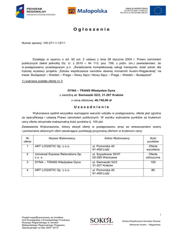 Ogłoszenie Numer sprawy: VIII-271-1-12/11 Działając w oparciu o art. 92 ust. 2 ustawy z dnia 29 stycznia 2004 r. Prawo zamówień publicznych (tekst jednolity Dz. U. z 2010 r. Nr 113, poz. 759, z późn. zm.) zawiadamiam, że w postępowaniu przetargowym p.n. „Świadczenie kompleksowej usługi transportu dzieł sztuki dla trzeciej wystawy projektu „Sztuka współczesna narodów dawnej monarchii Austro-Węgierskiej” na trasie: Budapeszt – Wiedeń – Praga – Nowy Sącz i Nowy Sącz – Praga – Wiedeń – Budapeszt” 1) wybrana została oferta nr 3: DYNA – TRANS Władysław Dyna z siedzibą ul. Siemaszki 52/2, 31-207 Kraków z ceną ofertową: 46.740,00 zł Uzasadnienie Wykonawca spełnił wszystkie wymagane warunki udziału w postępowaniu, oferta jest zgodna ze specyfikacją i ustawą Prawo zamówień publicznych. W wyniku wyliczenia punktów za kryterium ceny oferta otrzymała maksymalną ilość punktów tj. 100 pkt. Zestawienie Wykonawców, którzy złożyli oferty w postępowaniu wraz ze streszczeniem oceny i porównania złożonych ofert zawierające punktację przyznaną ofertom w kryterium ceny: Nr oferty Nazwa Wykonawcy Adres Wykonawcy Ilość punktów 1 ART LOGISTIC Sp. z o.o. ul. Pomorska 40 91-408 Łódź Oferta wycofana 2 Universal Express Relocations Sp. z o. o. ul. Szyszkowa 35/37 02-285 Warszawa Oferta odrzucona 3 DYNA – TRANS Władysław Dyna ul. Siemaszki 52/2 31-207 Kraków 100 4 ART LOGISTIC Sp. z o.o. ul. Pomorska 40 91-408 Łódź 85 1 Projekt współfinansowany ze środków Unii Europejskiej z Europejskiego Funduszu Rozwoju Regionalnego w ramach Małopolskiego Regionalnego Programu Operacyjnego na lata 2007–2013. Sztuka Współczesna Narodów Dawnej Monarchii Austro – Węgierskiej
