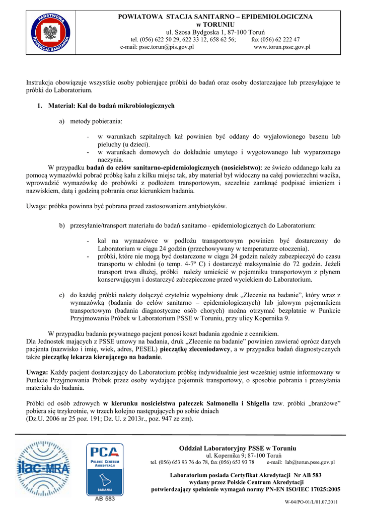 POWIATOWA STACJA SANITARNO – EPIDEMIOLOGICZNA w TORUNIU ul. Szosa Bydgoska 1, 87-100 Toruń tel. (056) 622 50 29, 622 33 12, 658 62 56; e-mail: [email protected] e-mail :[email protected] fax (056) 62 222 47 www.torun.psse.gov.pl Instrukcja obowiązuje wszystkie osoby pobierające próbki do badań oraz osoby dostarczające lub przesyłające te próbki do Laboratorium. 1. Materiał: Kał do badań mikrobiologicznych a) metody pobierania: w warunkach szpitalnych kał powinien być oddany do wyjałowionego basenu lub pieluchy (u dzieci). - w warunkach domowych do dokładnie umytego i wygotowanego lub wyparzonego naczynia. W przypadku badań do celów sanitarno-epidemiologicznych (nosicielstwo): ze świeżo oddanego kału za pomocą wymazówki pobrać próbkę kału z kilku miejsc tak, aby materiał był widoczny na całej powierzchni wacika, wprowadzić wymazówkę do probówki z podłożem transportowym, szczelnie zamknąć podpisać imieniem i nazwiskiem, datą i godziną pobrania oraz kierunkiem badania. - Uwaga: próbka powinna być pobrana przed zastosowaniem antybiotyków. b) przesyłanie/transport materiału do badań sanitarno - epidemiologicznych do Laboratorium: - kał na wymazówce w podłożu transportowym powinien być dostarczony do Laboratorium w ciągu 24 godzin (przechowywany w temperaturze otoczenia). próbki, które nie mogą być dostarczone w ciągu 24 godzin należy zabezpieczyć do czasu transportu w chłodni (o temp. 4-7º C) i dostarczyć maksymalnie do 72 godzin. Jeżeli transport trwa dłużej, próbki należy umieścić w pojemniku transportowym z płynem konserwującym i dostarczyć zabezpieczone przed wyciekiem do Laboratorium. c) do każdej próbki należy dołączyć czytelnie wypełniony druk „Zlecenie na badanie”, który wraz z wymazówką (badania do celów sanitarno – epidemiologicznych) lub jałowym pojemnikiem transportowym (badania diagnostyczne osób chorych) można otrzymać bezpłatnie w Punkcie Przyjmowania Próbek w Laboratorium PSSE w Toruniu, przy ulicy Kopernika 9. W przypadku badania prywatnego pacjent ponosi koszt badania zgodnie z cennikiem. Dla Jednostek mających z PSSE umowy na badania, druk „Zlecenie na badanie” powinien zawierać oprócz danych pacjenta (nazwisko i imię, wiek, adres, PESEL) pieczątkę zleceniodawcy, a w przypadku badań diagnostycznych także pieczątkę lekarza kierującego na badanie. Uwaga: Każdy pacjent dostarczający do Laboratorium próbkę indywidualnie jest wcześniej ustnie informowany w Punkcie Przyjmowania Próbek przez osoby wydające pojemnik transportowy, o sposobie pobrania i przesyłania materiału do badania. Próbki od osób zdrowych w kierunku nosicielstwa pałeczek Salmonella i Shigella tzw. próbki „branżowe” pobiera się trzykrotnie, w trzech kolejno następujących po sobie dniach (Dz.U. 2006 nr 25 poz. 191; Dz. U. z 2013r., poz. 947 ze zm). Oddział Laboratoryjny PSSE w Toruniu ul. Kopernika 9; 87-100 Toruń tel. (056) 653 93 76 do 78, fax (056) 653 93 78 e-mail: [email protected] Laboratorium posiada Certyfikat Akredytacji Nr AB 583 wydany przez Polskie Centrum Akredytacji potwierdzający spełnienie wymagań normy PN-EN ISO/IEC 17025:2005 W-04/PO-01/L/01.07.2011