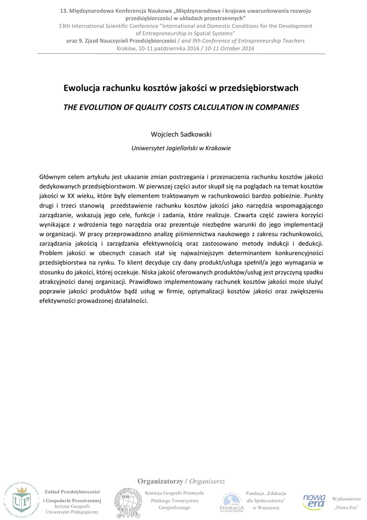 13. Międzynarodowa Konferencja Naukowa „Międzynarodowe i krajowe uwarunkowania rozwoju przedsiębiorczości w układach przestrzennych” 13th International Scientific Conference “International and Domestic Conditions for the Development of Entrepreneurship in Spatial Systems” oraz 9. Zjazd Nauczycieli Przedsiębiorczości / and 9th Conference of Entrepreneurship Teachers Kraków, 10-11 października 2016 / 10-11 October 2016 Ewolucja rachunku kosztów jakości w przedsiębiorstwach THE EVOLUTION OF QUALITY COSTS CALCULATION IN COMPANIES Wojciech Sadkowski Uniwersytet Jagielloński w Krakowie Głównym celem artykułu jest ukazanie zmian postrzegania i przeznaczenia rachunku kosztów jakości dedykowanych przedsiębiorstwom. W pierwszej części autor skupił się na poglądach na temat kosztów jakości w XX wieku, które były elementem traktowanym w rachunkowości bardzo pobieżnie. Punkty drugi i trzeci stanowią przedstawienie rachunku kosztów jakości jako narzędzia wspomagającego zarządzanie, wskazują jego cele, funkcje i zadania, które realizuje. Czwarta część zawiera korzyści wynikające z wdrożenia tego narzędzia oraz prezentuje niezbędne warunki do jego implementacji w organizacji. W pracy przeprowadzono analizę piśmiennictwa naukowego z zakresu rachunkowości, zarządzania jakością i zarządzania efektywnością oraz zastosowano metody indukcji i dedukcji. Problem jakości w obecnych czasach stał się najważniejszym determinantem konkurencyjności przedsiębiorstwa na rynku. To klient decyduje czy dany produkt/usługa spełnił/a jego wymagania w stosunku do jakości, której oczekuje. Niska jakość oferowanych produktów/usług jest przyczyną spadku atrakcyjności danej organizacji. Prawidłowo implementowany rachunek kosztów jakości może służyć poprawie jakości produktów bądź usług w firmie, optymalizacji kosztów jakości oraz zwiększeniu efektywności prowadzonej działalności. Organizatorzy / Organisers: Zakład Przedsiębiorczości Komisja Geografii Przemysłu i Gospodarki Przestrzennej Instytut Geografii Uniwersytet Pedagogiczny Polskiego Towarzystwa Geograficznego Fundacja „Edukacja dla Społeczeństwa” w Warszawie Wydawnictwo „Nowa Era”