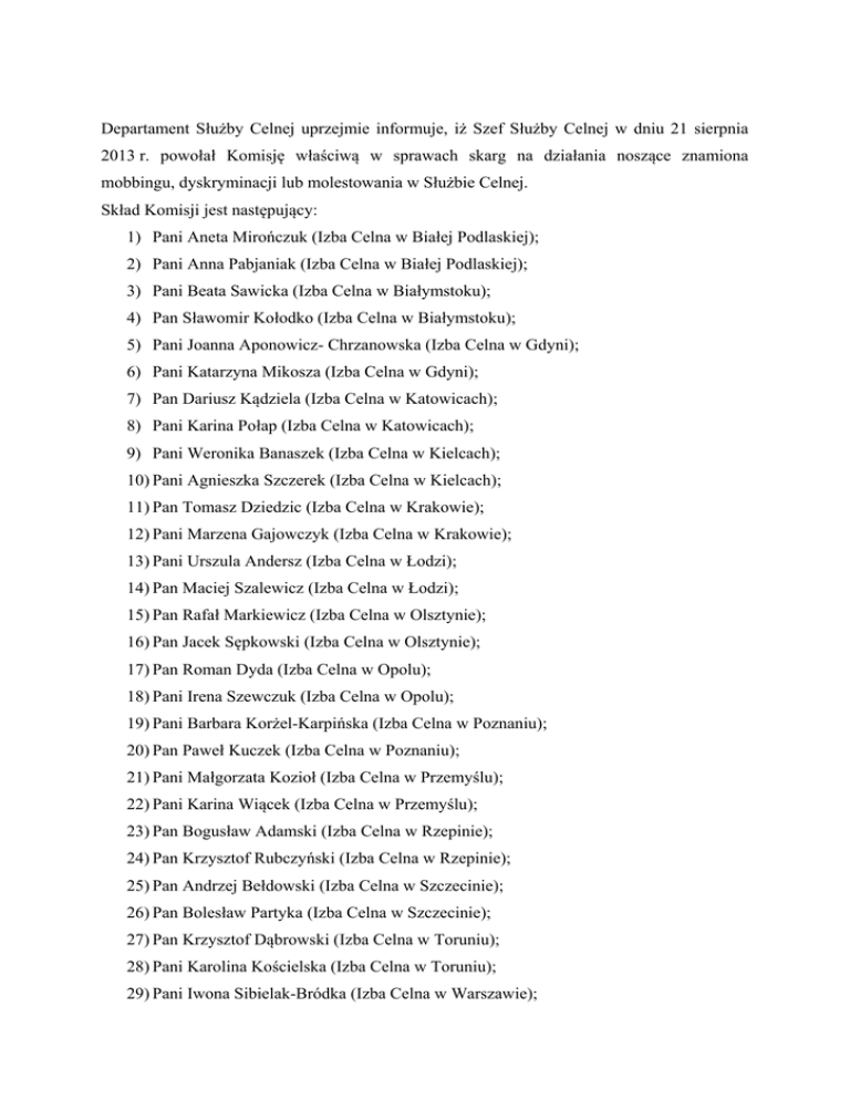 Departament Służby Celnej uprzejmie informuje, iż Szef Służby Celnej w dniu 21 sierpnia 2013 r. powołał Komisję właściwą w sprawach skarg na działania noszące znamiona mobbingu, dyskryminacji lub molestowania w Służbie Celnej. Skład Komisji jest następujący: 1) Pani Aneta Mirończuk (Izba Celna w Białej Podlaskiej); 2) Pani Anna Pabjaniak (Izba Celna w Białej Podlaskiej); 3) Pani Beata Sawicka (Izba Celna w Białymstoku); 4) Pan Sławomir Kołodko (Izba Celna w Białymstoku); 5) Pani Joanna Aponowicz- Chrzanowska (Izba Celna w Gdyni); 6) Pani Katarzyna Mikosza (Izba Celna w Gdyni); 7) Pan Dariusz Kądziela (Izba Celna w Katowicach); 8) Pani Karina Połap (Izba Celna w Katowicach); 9) Pani Weronika Banaszek (Izba Celna w Kielcach); 10) Pani Agnieszka Szczerek (Izba Celna w Kielcach); 11) Pan Tomasz Dziedzic (Izba Celna w Krakowie); 12) Pani Marzena Gajowczyk (Izba Celna w Krakowie); 13) Pani Urszula Andersz (Izba Celna w Łodzi); 14) Pan Maciej Szalewicz (Izba Celna w Łodzi); 15) Pan Rafał Markiewicz (Izba Celna w Olsztynie); 16) Pan Jacek Sępkowski (Izba Celna w Olsztynie); 17) Pan Roman Dyda (Izba Celna w Opolu); 18) Pani Irena Szewczuk (Izba Celna w Opolu); 19) Pani Barbara Korżel-Karpińska (Izba Celna w Poznaniu); 20) Pan Paweł Kuczek (Izba Celna w Poznaniu); 21) Pani Małgorzata Kozioł (Izba Celna w Przemyślu); 22) Pani Karina Wiącek (Izba Celna w Przemyślu); 23) Pan Bogusław Adamski (Izba Celna w Rzepinie); 24) Pan Krzysztof Rubczyński (Izba Celna w Rzepinie); 25) Pan Andrzej Bełdowski (Izba Celna w Szczecinie); 26) Pan Bolesław Partyka (Izba Celna w Szczecinie); 27) Pan Krzysztof Dąbrowski (Izba Celna w Toruniu); 28) Pani Karolina Kościelska (Izba Celna w Toruniu); 29) Pani Iwona Sibielak-Bródka (Izba Celna w Warszawie); 30) Pan Andrzej Wasilewski (Izba Celna w Warszawie); 31) Pani Agnieszka Bartoszewska (Izba Celna we Wrocławiu); 32) Pan Jan Tomaszkiewicz (Izba Celna we Wrocławiu). Na Przewodniczącego Komisji Szef Służby Celnej wyznaczył Panią Anetę Mirończuk, na Zastępcę Przewodniczącego Komisji – Panią Beatę Sawicką. Ponadto Szef Służby Celnej powołał grupę mediatorów w składzie: 1) Pani Edyta Rzymowska (Izba Celna w Białej Podlaskiej); 2) Pani Jowita Walczuk (Izba Celna w Białej Podlaskiej); 3) Pani Alicja Sidorczuk (Izba Celna w Białymstoku); 4) Pan Andrzej Tomczak (Izba Celna w Krakowie); 5) Pani Agnieszka Irena Kozłowska (Izba Celna w Poznaniu); 6) Pani Katarzyna Bartkowiak (Izba Celna w Toruniu); 7) Pan Robert Sadowski (Izba Celna w Toruniu); 8) Pani Joanna Niemczuk (Izba Celna w Warszawie); 9) Pan Kamil Swat (Izba Celna w Warszawie); 10) Pan Robert Ostowicz (Izba Celna we Wrocławiu). Szef Służby Celnej powołał również grupę psychologów w składzie: 1) Pani Joanna Trochimiuk (Izba Celna w Białej Podlaskiej); 2) Pani Ewa Zych (Izba Celna w Katowicach); 3) Pani Karolina Dylewska – Kowalska (Izba Celna w Łodzi); 4) Pani Katarzyna Grześkowiak (Izba Celna w Poznaniu); 5) Pan Artur Szuban (Izba Celna w Przemyślu).
