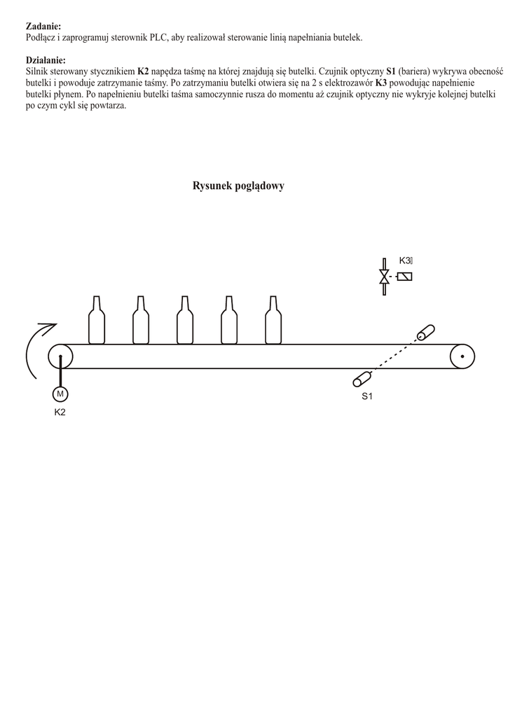Zadanie: Podłącz i zaprogramuj sterownik PLC, aby realizował sterowanie linią napełniania butelek. Działanie: Silnik sterowany stycznikiem K2 napędza taśmę na której znajdują się butelki. Czujnik optyczny S1 (bariera) wykrywa obecność butelki i powoduje zatrzymanie taśmy. Po zatrzymaniu butelki otwiera się na 2 s elektrozawór K3 powodując napełnienie butelki płynem. Po napełnieniu butelki taśma samoczynnie rusza do momentu aż czujnik optyczny nie wykryje kolejnej butelki po czym cykl się powtarza. Rysunek poglądowy K3 M.. K2 S1 Schemat elektryczny + 24V DC S1 I1 I2 I3 I4 C1 I5 I6 FANUC IC200NDR001 + 24V 0V Q1 Q2 F1 K2 Q3 F2 K3 0V PE Legenda S1 - czujnik wykrywania butelki K2 - cewka sterowania silnikiem taśmy K3 - cewka sterowania elektrozaworem napełniania F1- bezpiecznik F2 - bezpiecznik Lista przyporządkowania Lp. 1. 2. 3. Symbol S1 K2 K3 Wej/Wyj I1 Q1 Q2 Opis Czujnik optyczny (bariera) NC Cewka sterowania silnikiemnapędu taśmy Cewka sterowania elektrozaworem Q4 C1 Przykładowy schemat drabinkowy. S1 K2 R K3 S K2 K3 TMR S TENTH... K3 20 PV Na potrzeby: Tarnowskiego Centrum Kształcenia Praktycznego Przygotował - Kazimierz Grochulski [email protected] R