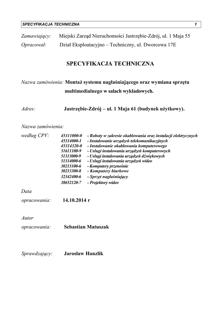 specyfikacja techniczna - Miejski Zarząd Nieruchomości Jastrzębie