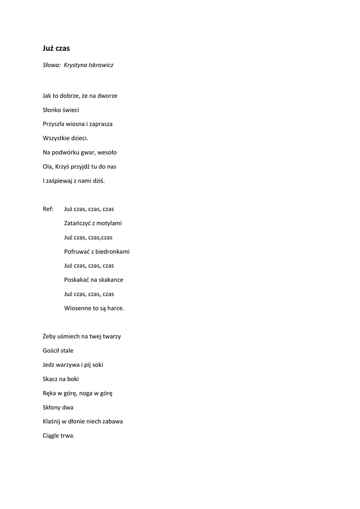 Już czas Słowa: Krystyna Iskrowicz Jak to dobrze, że na dworze Słonko świeci Przyszła wiosna i zaprasza Wszystkie dzieci. Na podwórku gwar, wesoło Ola, Krzyś przyjdź tu do nas I zaśpiewaj z nami dziś. Ref: Już czas, czas, czas Zataoczyd z motylami Już czas, czas,czas Pofruwad z biedronkami Już czas, czas, czas Poskakad na skakance Już czas, czas, czas Wiosenne to są harce. Żeby uśmiech na twej twarzy Gościł stale Jedz warzywa i pij soki Skacz na boki Ręka w górę, noga w górę Skłony dwa Klaśnij w dłonie niech zabawa Ciągle trwa.