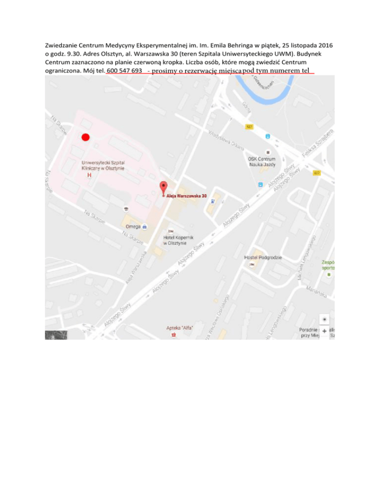 Zwiedzanie Centrum Medycyny Eksperymentalnej im. Im. Emila Behringa w piątek, 25 listopada 2016 o godz. 9.30. Adres Olsztyn, al. Warszawska 30 (teren Szpitala Uniwersyteckiego UWM). Budynek Centrum zaznaczono na planie czerwoną kropka. Liczba osób, które mogą zwiedzić Centrum ograniczona. Mój tel. 600 547 693 - prosimy o rezerwację miejsca pod tym numerem tel
