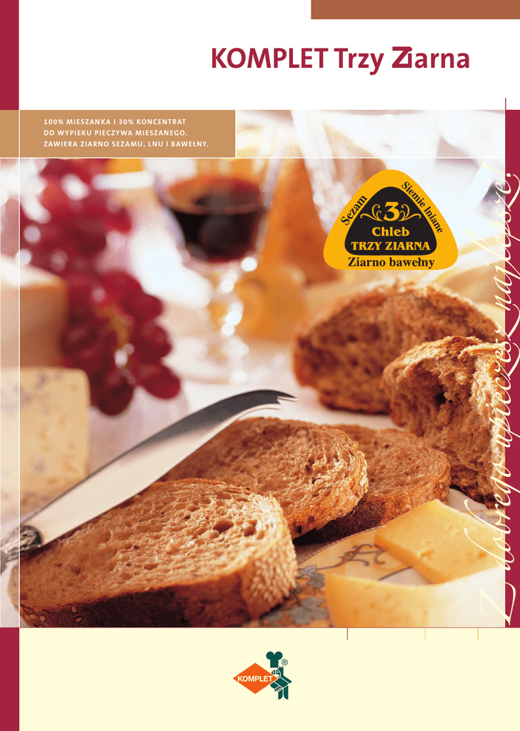 KOMPLET Trzy Ziarna 10 0% MI ESZAN KA I 30% KONCENTR AT D O W YP I EKU P I ECZY WA M I ESZAN E GO. Z dobrego upieczesz najlepsze! ZAWI ERA ZIARNO SEZAMU , LN U I BAWEŁNY. Chleb Trzy ziarna 30 26 szt. KOMPLET Trzy ziarna 30 mąka pszenna typ 550 drożdże woda łączna ilość 3,000 kg 7,000 kg 0,300 kg ok. 5,500 kg ok. 15,800 kg czas zagniatania: (miesiarka spiralna) temp. ciasta: czas gary ciasta: naważka: 3 minuty – pierwszy bieg 6 minut – drugi bieg 26 °C 30 minut 600 g na chleb o wadze 500 g Wykonanie: Odważone kęsy ciasta uformować nadając im okrągły kształt. Lekko zwilżyć, obtoczyć w sezamie i układać do góry dnem w koszyczkach. Odstawić do garowania. czas gary: czas pieczenia: temp. pieczenia: 30-40 minut ok. 35 minut dla chleba o wadze 500 g ok. 230 °C spadająca do 210 °C Chleb Trzy ziarna 100 26 szt. KOMPLET Trzy ziarna 100 drożdże świeże woda łączna ilość Wykonanie: Tak jak Chleb Trzy ziarna 30. 10,000 kg 0,500 kg ok. 5,500 kg ok. 16,000 kg Hamburger i tost Trzy ziarna KOMPLET Trzy ziarna drożdże margaryna woda łączna ilość 10,000 kg 0,400 kg 0,200 kg 5,300 kg ok. 15,900 kg Ze wszystkich składników wyrobić ciasto. Czas zagniatania, temperatura ciasta i czas gary – jak w recepturze podstawowej. Na bułki hamburgerowe odważyć presy po 1800 g. Podzielić i zaokrąglić za pomocą dzielarki do bułek. Następnie uformowane bułki, zwilżyć, obtoczyć w sezamie, spłaszczyć i odstawić do garowania. czas gary ciasta: temp. pieczenia: czas pieczenia: ok. 50 minut ok. 230 °C 12-14 minut Na chleb tostowy podzielić ciasto na kęsy o wadze 600 g. Uformować chleb, lekko zwilżyć i obtoczyć w sezamie. Ułożyć w formach do chleba tostowego i odstawić do garowania. czas gary: temp. pieczenia: czas pieczenia: ok. 50 minut ok. 220 °C ok. 40 minut Z dobrego upieczesz najlepsze! KOMPLET Trzy Ziarna