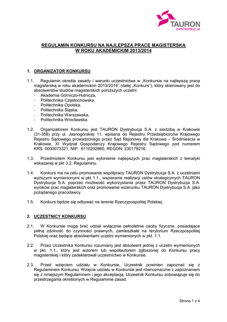 REGULAMIN KONKURSU NA NAJLEPSZĄ PRACĘ MAGISTERSKĄ W ROKU AKADEMICKIM 2013/2014 1. ORGANIZATOR KONKURSU 1.1. Regulamin określa zasady i warunki uczestnictwa w „Konkursie na najlepszą pracę magisterską w roku akademickim 2013/2014” (dalej „Konkurs”), który skierowany jest do absolwentów studiów magisterskich poniższych uczelni: ‐ Akademia Górniczo-Hutnicza, ‐ Politechnika Częstochowska, ‐ Politechnika Opolska, ‐ Politechnika Śląska, ‐ Politechnika Warszawska, ‐ Politechnika Wrocławska. 1.2. Organizatorem Konkursu jest TAURON Dystrybucja S.A. z siedzibą w Krakowie (31-358) przy ul. Jasnogórskiej 11, wpisana do Rejestru Przedsiębiorców Krajowego Rejestru Sądowego prowadzonego przez Sąd Rejonowy dla Krakowa – Śródmieścia w Krakowie, XI Wydział Gospodarczy Krajowego Rejestru Sądowego pod numerem KRS: 0000073321, NIP: 6110202860, REGON: 230179216. 1.3. Przedmiotem Konkursu jest wyłonienie najlepszych prac magisterskich z tematyki wskazanej w pkt 3.2. Regulaminu. 1.4. Konkurs ma na celu promowanie współpracy TAURON Dystrybucja S.A. z uczelniami wyższymi wymienionymi w pkt 1.1., wspieranie realizacji celów strategicznych TAURON Dystrybucja S.A. poprzez możliwość wykorzystania przez TAURON Dystrybucja S.A. wyników prac magisterskich oraz promowanie wizerunku TAURON Dystrybucja S.A. jako pożądanego pracodawcy. 1.5. Konkurs będzie się odbywać na terenie Rzeczypospolitej Polskiej. 2. UCZESTNICY KONKURSU 2.1. W Konkursie mogą brać udział wyłącznie pełnoletnie osoby fizyczne, posiadające pełną zdolność do czynności prawnych, zamieszkałe na terytorium Rzeczpospolitej Polskiej oraz będące absolwentami uczelni wymienionych w pkt. 1.1. 2.2. Przez Uczestnika Konkursu rozumiany jest absolwent jednej z uczelni wymienionych w pkt. 1.1., który jest autorem lub współautorem zgłoszonej do Konkursu pracy magisterskiej i który zadeklarował uczestnictwo w Konkursie. 2.3. Przed wzięciem udziału w Konkursie, Uczestnik powinien zapoznać się z Regulaminem Konkursu. Wzięcie udziału w Konkursie jest równoznaczne z zapoznaniem się z niniejszym Regulaminem i jego akceptacją. Uczestnik Konkursu zobowiązuje się do przestrzegania określonych w Regulaminie zasad. Strona 1 z 4 2.4. Uczestnik deklaruje uczestnictwo w Konkursie poprzez wypełnienie formularza zgłoszeniowego wraz ze streszczeniem pracy, zgodnie z załącznikiem nr 1 do Regulaminu. 2.5. Uczestnicy, którzy nie spełniają warunków udziału w Konkursie określonych w niniejszym Regulaminie, w tym podadzą niekompletne lub nieprawdziwe dane, zostaną z postępowania wykluczeni. W przypadku, gdy jedna praca magisterska zostanie zgłoszona przez dwóch lub większą liczbę współautorów, zgodnie z pkt. 3.6. niniejszego Regulaminu, brak spełnienia warunków udziału w Konkursie przez jednego z Uczestników skutkuje wykluczeniem z postępowania wszystkich Uczestników (współautorów) danej pracy magisterskiej. 2.6. W Konkursie nie mogą brać udziału pracownicy Grupy TAURON. 3. ZAŁOŻENIA KONKURSU 3.1. Konkurs zostanie przeprowadzony zgodnie z następującym harmonogramem: Etap A: Przyjmowanie i selekcja zgłoszeń. 1) Ogłoszenie Konkursu: 28 kwietnia 2014 r. Informacja o Konkursie zostanie opublikowana na stronie internetowej TAURON Dystrybucja S.A. www.tauron-dystrybucja.pl/pl/konkurs, przekazana samorządom studenckim oraz rozpowszechniona w formie plakatów na uczelniach wymienionych w pkt 1.1 Regulaminu. 2) Przyjmowanie zgłoszeń prac Uczestników: do 30 września 2014 r. Zgłoszenia prac przyjmowane są w formie elektronicznej poprzez przesłanie przez Uczestnika na adres: [email protected], wypełnionego i zeskanowanego formularza zgłoszeniowego zgodnego ze wzorem stanowiącym Załącznik nr 1 do Regulaminu. 3) Wybór na podstawie pkt. 3.3. Regulaminu max. 10 prac zakwalifikowanych do etapu B Konkursu: 7 października 2014r. Etap B: Ocena pełnej wersji prac magisterskich i wyłonienie laureata/-ów Konkursu. 1) Przedstawiciel TAURON Dystrybucja S.A. skontaktuje się 8 października 2014r. z uczestnikami, których prace zostały zakwalifikowane do etapu B Konkursu drogą telefoniczną i mailową. Uczestnicy ci będą zobowiązani do dostarczenia do 24 października 2014r.: ‐ pełnej wersji pracy magisterskiej w wersji papierowej i elektronicznej (CD lub DVD), ‐ zaświadczenia z uczelni o złożeniu egzaminu dyplomowego potwierdzającego nadanie w oparciu o zgłoszoną pracę magisterską tytułu zawodowego wraz z oceną uzyskaną z pracy magisterskiej, datą obrony, nazwą uczelni oraz wydziału/ instytutu, w której obrona się odbyła. Strona 2 z 4 2) Wybór najlepszych prac przez Komisję Konkursową TAURON Dystrybucja S.A. na podstawie opinii Rady Naukowej TAURON Dystrybucja S.A. oraz własnej oceny. 3) Ogłoszenie laureatów Konkursu: 12 grudnia 2014r. Przedstawiciel TAURON Dystrybucja S.A. skontaktuje się ze laureatem/-ami Konkursu drogą telefoniczną i mailową w celu ustalenia sposobu przekazania nagrody. 3.2. ‐ ‐ ‐ ‐ Zgłaszane do Konkursu prace magisterskie powinny spełniać następujące założenia: tematyka prac powinna obejmować zagadnienia z obszaru „Inteligentne systemy dostawy energii elektrycznej - nowe wyzwania dla sieci dystrybucyjnej”, prace magisterskie muszą być obronione w roku akademickim 2013/2014 na jednej z uczelni wymienionych w pkt.1.1., prace powinny być napisane w języku polskim lub angielskim, prace nie mogą naruszać praw (w tym praw własności intelektualnej) osób trzecich. 3.3. Kryteriami, które będą brane pod uwagę podczas oceny zgłoszeń oraz prac w pełnej wersji, będzie ich poziom merytoryczny i innowacyjność opisywanego zagadnienia. 3.4. Przewodniczącym Komisji Konkursowej TAURON Dystrybucja S.A. jest Dyrektor Departamentu Rozwoju i Inwestycji. 3.5. W przypadku pracy zbiorowej formularz zgłoszenia powinien zawierać również zgody współautorów na objęcie pracy Konkursem na war