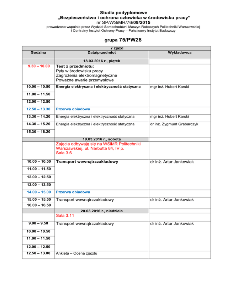 Studia podyplomowe „Bezpieczeństwo i ochrona człowieka w środowisku pracy” nr SP/WSiMR/76/09/2015 prowadzone wspólnie przez Wydział Samochodów i Maszyn Roboczych Politechniki Warszawskiej i Centralny Instytut Ochrony Pracy – Państwowy Instytut Badawczy grupa 75/PW28 7 zjazd Data/przedmiot Godzina Wykładowca 18.03.2016 r., piątek 9.30 – 10.00 10.00 – 10.50 Test z przedmiotu: Pyły w środowisku pracy Zagrożenia elektromagnetyczne Poważne awarie przemysłowe Energia elektryczna i elektryczność statyczna mgr inż. Hubert Karski 11.00 – 11.50 12.00 – 12.50 12.50 – 13.30 Przerwa obiadowa 13.30 – 14.20 Energia elektryczna i elektryczność statyczna mgr inż. Hubert Karski 14.30 – 15.20 Energia elektryczna i elektryczność statyczna dr inż. Zygmunt Grabarczyk 15.30 – 16.20 19.03.2016 r., sobota Zajęcia odbywają się na WSiMR Politechniki Warszawskiej, ul. Narbutta 84, IV p. Sala 3.6 10.00 – 10.50 Transport wewnątrzzakładowy dr inż. Artur Jankowiak 11.00 – 11.50 12.00 – 12.50 13.00 – 13.50 14.00 – 15.00 Przerwa obiadowa 15.00 – 15.50 Transport wewnątrzzakładowy dr inż. Artur Jankowiak 16.00 – 16.50 20.03.2016 r., niedziela Sala 3.11 9.00 – 9.50 Transport wewnątrzzakładowy 10.00 – 10.50 11.00 – 11.50 12.00 – 12.50 12.50 – 13.00 Ankieta – Ocena zjazdu dr inż. Artur Jankowiak
