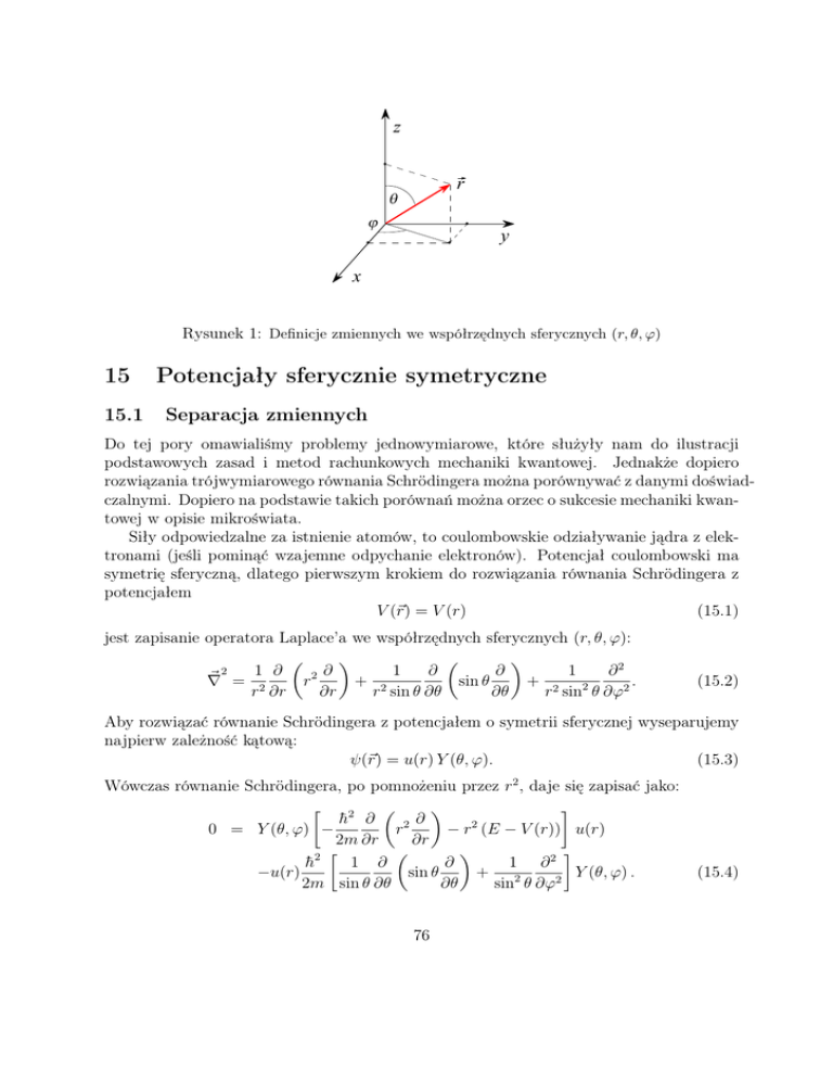 z r θ ϕ y x Rysunek 1: Definicje zmiennych we współrzędnych sferycznych (r, θ, ϕ) 15 15.1 Potencjały sferycznie symetryczne Separacja zmiennych Do tej pory omawialiśmy problemy jednowymiarowe, które służyły nam do ilustracji podstawowych zasad i metod rachunkowych mechaniki kwantowej. Jednakże dopiero rozwiązania trójwymiarowego równania Schrödingera można porównywać z danymi doświadczalnymi. Dopiero na podstawie takich porównań można orzec o sukcesie mechaniki kwantowej w opisie mikroświata. Siły odpowiedzalne za istnienie atomów, to coulombowskie odziaływanie jądra z elektronami (jeśli pominąć wzajemne odpychanie elektronów). Potencjał coulombowski ma symetrię sferyczną, dlatego pierwszym krokiem do rozwiązania równania Schrödingera z potencjałem V (~r) = V (r) (15.1) jest zapisanie operatora Laplace’a we współrzędnych sferycznych (r, θ, ϕ): µ ¶ µ ¶ 2 1 ∂ ∂2 ∂ ∂ 1 ∂ 1 2 ~ = ∇ r + sin θ + . r2 ∂r ∂r r2 sin θ ∂θ ∂θ r2 sin2 θ ∂ϕ2 (15.2) Aby rozwiązać równanie Schrödingera z potencjałem o symetrii sferycznej wyseparujemy najpierw zależność kątową: ψ(~r) = u(r) Y (θ, ϕ). (15.3) Wówczas równanie Schrödingera, po pomnożeniu przez r2 , daje się zapisać jako: · µ ¶ ¸ h̄2 ∂ 2 ∂ 2 0 = Y (θ, ϕ) − r − r (E − V (r)) u(r) 2m ∂r ∂r ¸ · µ ¶ h̄2 1 ∂ ∂ 1 ∂2 Y (θ, ϕ) . −u(r) sin θ + 2m sin θ ∂θ ∂θ sin2 θ ∂ϕ2 76 (15.4) Mnożąc stronami przez 2m/h̄2 i dzieląc przez u Y otrzymujemy dwa równania · µ ¶ ¸ 1 2 1 ∂ ∂ 1 ∂2 L̂ Y (θ, ϕ) = − sin θ + Y (θ, ϕ) = λY (θ, ϕ), (15.5) sin θ ∂θ ∂θ sin2 θ ∂ϕ2 h̄2 · µ ¶ ¸ ∂ 2 ∂ 2 2m − r − r 2 (E − V (r)) + λ u(r) = 0. (15.6) ∂r ∂r h̄ Równanie (15.5) definiuje operator L̂2 , który, jak się później okaże, odpowiada operatorowi momentu pędu i stałą separacji λ, która jest zarazem wartością własną operatora L̂2 . Spodziewamy się, mając na uwadze nasze poprzednie doświadczenie z równaniem Schrödingera w jednym wymiarze, że odpowiednio nałożone warunki brzegowe wymuszą kwantyzację zarówno λ jak i E. 15.2 Część kątowa równania Schrödingera Zauważmy, że część kątowa nie zależy od potencjału V (r) i w związku z tym jest identyczna dla wszystkich problemów o symetrii sferycznej. Operator L̂2 jest operatorem Sturma Lioville’a i dlatego rozwiązania problemu własnego (15.5) stanowią zupełny układ funkcji. Rozwiązania te znane są pod nazwą funkcji kulistych lub harmonik sferycznych. Dokładne wyprowadzenie szeregu własności tych funkcji można znaleźć w podręcznikach mechaniki kwantowej lub matematycznych metod fizyki; tu ograniczymy się do przypomnienia podstawowych wzorów, które będą użyteczne w dalszej części wykładu. 15.2.1 Zależność od kąta ϕ Aby rozwiązać równanie (15.5) musimy przeprowadzić kolejną separację zmienych: Y (θ, ϕ) = P (θ) Φ(ϕ). (15.7) Wówczas równanie (15.5) separuje się na dwa niezależne równania: d2 Φ(ϕ) = −ν Φ(ϕ), dϕ2 · µ ¶ ¸ 1 d d ν sin θ − P (θ) = −λ P (θ), sin θ dθ dθ sin2 θ (15.8) (15.9) gdzie ν jest nową stałą separacji. Rozwiązania równania (15.8) mają postać: Φ(ϕ) = A eimϕ + B e−imϕ , dla ν = m2 6= 0, Φ(ϕ) = A + B ϕ, dla ν = m2 = 0. (15.10) Aby funkcja Φ była jednoznaczna i ciągła na odcinku 2π, m musi być liczbą całkowitą, a w przypadku m = 0 stała B = 0. Stąd funkcje własne unormowane na odcinku od 0 do 2π przyjmują postać 1 Φm (ϕ) = √ eimϕ , m = 0, ±1, ±2, . . . . 2π 77 (15.11) Warto już w tym miejscu zauważyć, że funkcje Φm tworzą zupełny układ funkcji własnych na odcinku 0 do 2π: Z2π dϕ Φ∗m (ϕ)Φn (ϕ) = δ mn , Φn (ϕ)Φ∗n (ϕ0 ) = δ(ϕ − ϕ0 ). (15.12) n=0 0 15.2.2 ∞ X Zależność od kąta θ Aby rozwiązać równanie (15.9) dla dowolnego ν = m2 , rozważymy przypadek z m = 0, a potem pokażemy jak z tego rozwiązania przez wielokrotne różniczkowanie wygenerować rozwiązanie dla dowolnego m. Najpierw jednak wprowadźmy nową zmienną x = cos θ. W zmiennej x równanie (15.9) przyjmuje postać · ¸ · ¸ ¢ d ¡ m2 2 dP (x) 1−x + λ− P (x) = 0. dx dx 1 − x2 (15.13) (15.14) Warto zauważyć, że miara całkowania w zmiennych sferycznych przyjmuje postać d3~r = r2 dr sin θdθ dϕ = r2 dr dx dϕ. Wielomiany Legendre’a. Choć dla interesujących nas przypadków fizycznych zmienna x zawarta jest w przedziale −1 ≤ x ≤ 1, to równanie (15.14) rozwiążemy przy pomocy technik z dziedziny funkcji zespolonych. Naszym podstawowym żądaniem będzie, aby rozwiązania w obszarze fizycznym, t.j. dla rzeczywistych z z odcinka [−1, 1] nie miały żadnych osobliwości. Łatwo przekonać się, że dla m = 0 równanie (15.14) · ¸ ¢ d ¡ 2 dP (z) 1−z + λ P (z) = 0 (15.15) dz dz ma regularne punkty osobliwe w punktach z0 = ±1. Zatem zgodnie z teorią równań różniczkowych powinniśmy szukać rozwiązania w postaci szeregu potęgowego P (z) = ∞ X an (z − z0 )n+α . (15.16) n=0 Podstawiając powyższy szereg do (15.15) znajdujemy, że α2 = 0, lub w ogólnym przypadku α2 = m2 /4. 78 (15.17) Oznacza to, że drugie rozwiązanie równania (15.15) zawiera ln(z − z0 ), a zatem jest rozbieżne w z0 i musimy go odrzucić. Podobnie dla m 6= 0 drugie rozwiązanie jest rozbieżne jak 1/(z − z0 )|m|/2 . Szereg (15.16) ma promień zbieżności 2, a zatem jeśli – dla ustalenia uwagi – z0 = 1 – to rozwiązanie to byłoby rozbieżne w punkcie z = −1. Dlatego, aby uzyskać pełne rozwiązanie w interesującym nas obszarze fizycznym, musimy rozwiązanie to przedłużyć analitycznie do obszaru zawierającego punkt z = −1. Oznacza to, że w jakimś pośrednim punkcie, np. w z = 0, który leży w obszarze zbieżności rozwiązań wokół z0 = 1 i z0 = −1, szereg (15.16) musimy przedstawić jako kombinację liniową rozwiązania typu (15.16) wokół z0 = −1 oraz