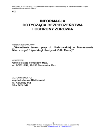PROJEKT WYKONAWCZY - „Oświetlenie terenu przy ul. Niebrowskiej w Tomaszowie Maz. - część 1 (parkingi i budynek O.K. Tkacz)” 6.2. INFORMACJA DOTYCZĄCA BEZPIECZEŃSTWA I OCHRONY ZDROWIA OBIEKT BUDOWLANY: „Oświetlenie terenu przy ul. Niebrowskiej w Tomaszowie Maz. - część 1 (parkingi i budynek O.K. Tkacz)” INWESTOR: Gmina Miasto Tomaszów Maz., ul. POW 10/16, 97-200 Tomaszów Maz. AUTOR PROJEKTU: mgr inż. Janusz Bieńkowski ul. Kolumny 112 93 – 342 Łódź 16 PRO INVEST Obsługa Inwestycji, 97-200 Tomaszów Maz., ul. Legionów 18 tel. 044/724-29-81 [email protected] www.proinv.pl PROJEKT WYKONAWCZY - „Oświetlenie terenu przy ul. Niebrowskiej w Tomaszowie Maz. - część 1 (parkingi i budynek O.K. Tkacz)” Część opisowa informacji bioz 1. ZAKRES ROBÓT. Prace obejmują : - budowę oświetlenia parkingu, terenów zielonych i podświetlenie budynku Ośrodka Kultury „TKACZ”. 2. WYKAZ ISTNIEJĄCYCH OBIEKTÓW BUDOWLANYCH. Na terenie objętym zakresem opracowania istnieją następujące obiekty budowlane: - budynki użyteczności publicznej; - sieć wodociągowa; - sieć gazowa; - sieć energetyczna niskiego i średniego napięcia; - sieć telefoniczna. 3. ELEMENTY ZAGOSPODAROWANIA TERENU LUB DZIAŁKI STWARZAJĄCE ZAGROŻENIE. Elementy zagospodarowania terenu lub działki stwarzające zagrożenie związane z prowadzeniem wykopów kablowych, montażem słupów oświetleniowych. 4. WSKAZANIA DOTYCZĄCE PRZEWIDYWANYCH ZAGROŻEŃ WYSTĘPUJĄCYCH PODCZAS REALIZACJI ROBÓT BUDOWLANYCH. Przewidywane zagrożenia występujące podczas realizacji robót budowlanych wynikają z zakresu prac budowlanych. Do nich należą : - roboty, przy których wykonaniu występuje ryzyko upadku z wysokości ponad 5,0 m; - roboty wykonywane przy użyciu dźwigu; - roboty wykonywane przy użyciu podnośnika koszowego; - roboty wykonywane w pobliżu urządzeń będących pod napięciem; - roboty kablowe wykonywane w pobliżu istniejącego podziemnego uzbrojenia terenu. Powyższe roboty powinny się odbywać pod bezpośrednim nadzorem kierownika budowy. 5. WSKAZANIE SPOSOBU PROWADZENIA INSTRUKTAŻU PRACOWNIKÓW PRZED PRZYSTĄPIENIEM DO REALIZACJI ROBÓT SZCZEGÓLNIE NIEBEZPIECZNYCH. Obowiązkiem kierownika budowy jest przeszkolenie lub zapewnienie przeszkolenia pracowników w miejscu pracy pod względem bhp i ppoż a szczególnie: - określenie zasad postępowania w przypadku wystąpienia zagrożenia; - określenie rodzajów środków ochrony osobistej i zasad ich stosowania; - ustalenie osób odpowiedzialnych za nadzór nad pracami, w tym szczególnie niebezpiecznymi; - zapoznanie pracowników z przepisami bhp podczas budowy urządzeń 17 PRO INVEST Obsługa Inwestycji, 97-200 Tomaszów Maz., ul. Legionów 18 tel. 044/724-29-81 [email protected] www.proinv.pl PROJEKT WYKONAWCZY - „Oświetlenie terenu przy ul. Niebrowskiej w Tomaszowie Maz. - część 1 (parkingi i budynek O.K. Tkacz)” elektrycznych; - zapewnienie pracownikom szkolenia stanowiskowego przeprowadzonego przez osobę posiadająca stosowne uprawnienia. Szkolenie takie powinno być przeprowadzone przez osoby mające odpowiednie przygotowanie merytoryczne i kwalifikacje formalne do jego prowadzenia. Pracownicy powinni go wysłuchać i potwierdzić ten fakt własnoręcznym podpisem. Pracownicy wykonujący pracę powinni posiadać odpowiednie kwalifikacje, a ci, którzy będą pracować w pobliżu urządzeń energetycznych, powinni mieć ważną grupę „E”, dostosowaną do napięcia, w pobliżu, którego pracują oraz wszyscy ważne badania lekarskie. 6. WSKAZANIE ŚRODKÓW TECHNICZNYCH I ORGANIZACYJNYCH ZAPOBIEGAJĄCYCH NIEBEZPIECZEŃSTWOM WYNIKAJĄCYM Z WYKONYWANIA ROBÓT BUDOWLANYCH W STREFACH SZCZEGÓLNEGO ZAGROŻENIA ZDROWIA LUB W ICH SĄSIEDZTWIE. Nie przewiduje się stref szczególnego zagrożenia zdrowia – sposób ewentualnej ewakuacji czy udzielaniem pomocy – zgodnie z zaleceniami ogólnymi bhp. Przed rozpoczęciem prac należy sporządzić szczegółowy ich harmonogram i uzgodnić go służbami technicznymi Inwestora. Przy wykonywaniu wykopów kablowych należy wykonać oznaczenia wykopanych rowów kablowych. Ewentualne prace wykonywane w warunkach szczególnego zagrożenia dla zdrowia i życia ludzkiego powinny być wykonywane, przez co najmniej dwie osoby. Na terenie placu budowy należy przestrzegać ogólnych zasad bhp dotyczących prac budowlanych, w szczególności przy wykonywaniu wykopów pod kable i prac związanych z użyciem sprzętu budowlanego. Przy wykonywaniu prac należy stosować następujące zasady: - rozszerzanie prac poza zakres jest zabronione, - usuwanie ogrodzeń, osłon w czasie pracy jest zabronione, - przechodzenie poza wyznaczoną strefę robót jest zabronione, - korzystanie ze sprzętu ochronnego jest obowiązkowe. 18 PRO INVEST Obsługa Inwestycji, 97-200 Tomaszów Maz., ul. Legionów 18 tel. 044/724-29-81 [email protected] www.proinv.pl