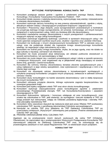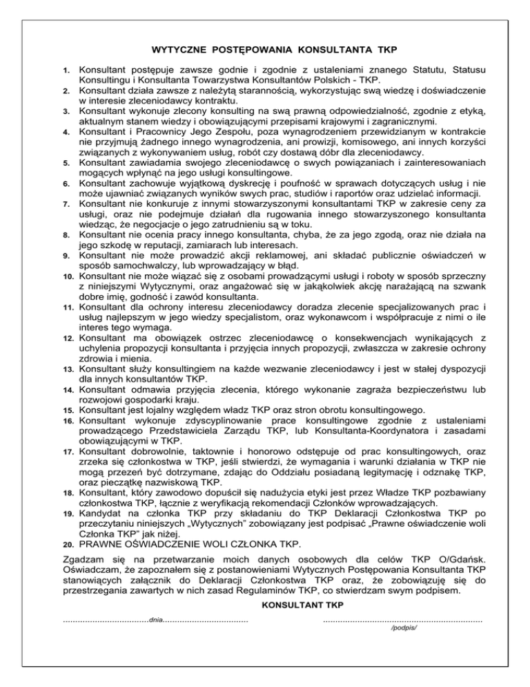 WYTYCZNE POSTĘPOWANIA KONSULTANTA TKP 1. 2. 3. 4. 5. 6. 7. 8. 9. 10. 11. 12. 13. 14. 15. 16. 17. 18. 19. 20. Konsultant postępuje zawsze godnie i zgodnie z ustaleniami znanego Statutu, Statusu Konsultingu i Konsultanta Towarzystwa Konsultantów Polskich - TKP. Konsultant działa zawsze z należytą starannością, wykorzystując swą wiedzę i doświadczenie w interesie zleceniodawcy kontraktu. Konsultant wykonuje zlecony konsulting na swą prawną odpowiedzialność, zgodnie z etyką, aktualnym stanem wiedzy i obowiązującymi przepisami krajowymi i zagranicznymi. Konsultant i Pracownicy Jego Zespołu, poza wynagrodzeniem przewidzianym w kontrakcie nie przyjmują żadnego innego wynagrodzenia, ani prowizji, komisowego, ani innych korzyści związanych z wykonywaniem usług, robót czy dostawą dóbr dla zleceniodawcy. Konsultant zawiadamia swojego zleceniodawcę o swych powiązaniach i zainteresowaniach mogących wpłynąć na jego usługi konsultingowe. Konsultant zachowuje wyjątkową dyskrecję i poufność w sprawach dotyczących usług i nie może ujawniać związanych wyników swych prac, studiów i raportów oraz udzielać informacji. Konsultant nie konkuruje z innymi stowarzyszonymi konsultantami TKP w zakresie ceny za usługi, oraz nie podejmuje działań dla rugowania innego stowarzyszonego konsultanta wiedząc, że negocjacje o jego zatrudnieniu są w toku. Konsultant nie ocenia pracy innego konsultanta, chyba, że za jego zgodą, oraz nie działa na jego szkodę w reputacji, zamiarach lub interesach. Konsultant nie może prowadzić akcji reklamowej, ani składać publicznie oświadczeń w sposób samochwalczy, lub wprowadzający w błąd. Konsultant nie może wiązać się z osobami prowadzącymi usługi i roboty w sposób sprzeczny z niniejszymi Wytycznymi, oraz angażować się w jakąkolwiek akcję narażającą na szwank dobre imię, godność i zawód konsultanta. Konsultant dla ochrony interesu zleceniodawcy doradza zlecenie specjalizowanych prac i usług najlepszym w jego wiedzy specjalistom, oraz wykonawcom i współpracuje z nimi o ile interes tego wymaga. Konsultant ma obowiązek ostrzec zleceniodawcę o konsekwencjach wynikających z uchylenia propozycji konsultanta i przyjęcia innych propozycji, zwłaszcza w zakresie ochrony zdrowia i mienia. Konsultant służy konsultingiem na każde wezwanie zleceniodawcy i jest w stałej dyspozycji dla innych konsultantów TKP. Konsultant odmawia przyjęcia zlecenia, którego wykonanie zagraża bezpieczeństwu lub rozwojowi gospodarki kraju. Konsultant jest lojalny względem władz TKP oraz stron obrotu konsultingowego. Konsultant wykonuje zdyscyplinowanie prace konsultingowe zgodnie z ustaleniami prowadzącego Przedstawiciela Zarządu TKP, lub Konsultanta-Koordynatora i zasadami obowiązującymi w TKP. Konsultant dobrowolnie, taktownie i honorowo odstępuje od prac konsultingowych, oraz zrzeka się członkostwa w TKP, jeśli stwierdzi, że wymagania i warunki działania w TKP nie mogą przezeń być dotrzymane, zdając do Oddziału posiadaną legitymację i odznakę TKP, oraz pieczątkę nazwiskową TKP. Konsultant, który zawodowo dopuścił się nadużycia etyki jest przez Władze TKP pozbawiany członkostwa TKP, łącznie z weryfikacją rekomendacji Członków wprowadzających. Kandydat na członka TKP przy składaniu do TKP Deklaracji Członkostwa TKP po przeczytaniu niniejszych „Wytycznych” zobowiązany jest podpisać „Prawne oświadczenie woli Członka TKP” jak niżej. PRAWNE OŚWIADCZENIE WOLI CZŁONKA TKP. Zgadzam się na przetwarzanie moich danych osobowych dla celów TKP O/Gdańsk. Oświadczam, że zapoznałem się z postanowieniami Wytycznych Postępowania Konsultanta TKP stanowiących załącznik do Deklaracji Członkostwa TKP oraz, że zobowiązuję się do przestrzegania zawartych w nich zasad Regulaminów TKP, co stwierdzam swym podpisem. KONSULTANT TKP ...................................dnia................................... ................................................................. /podpis/