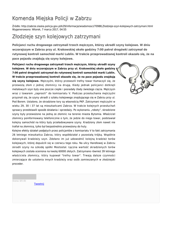 Komenda Miejska Policji w Zabrzu Źródło: http://zabrze.slaska.policja.gov.pl/k29/informacje/wiadomosci/70988,Zlodzieje-szyn-kolejowych-zatrzymani.html Wygenerowano: Wtorek, 7 marca 2017, 04:55 Złodzieje szyn kolejowych zatrzymani Policjanci ruchu drogowego zatrzymali trzech mężczyzn, którzy ukradli szyny kolejowe. W dniu wczorajszym w Zabrzu przy ul. Krakowskiej około godziny 7:00 patrol drogówki zatrzymał do rutynowej kontroli samochód marki Lublin. W trakcie przeprowadzanej kontroli okazało się, że na pace pojazdu znajdują się szyny kolejowe. Policjanci ruchu drogowego zatrzymali trzech mężczyzn, którzy ukradli szyny kolejowe. W dniu wczorajszym w Zabrzu przy ul. Krakowskiej około godziny 7:00 patrol drogówki zatrzymał do rutynowej kontroli samochód marki Lublin. W trakcie przeprowadzanej kontroli okazało się, że na pace pojazdu znajdują się szyny kolejowe. Mężczyźni, którzy przewozili trefny towar tłumaczyli się, że przewożą złom z jednej złomnicy na drugą. Kiedy jednak policjanci dotknęli metalowych szyn były one jeszcze ciepłe i posiadały ślady świeżego cięcia. Mężczyzn wraz z towarem „zaprosili” do komisariatu V. Podczas przesłuchania mężczyźni przyznali się, że szyny ukradli z szlaku kolejowego znajdującego się w Zabrzu przy ul. Pod Borem. Ustalono, że skradzione tory są własnością PKP. Zatrzymani mężczyźni w wieku 29, 30 i 37 lat są mieszkańcami Zabrza. W trakcie kolejnych przesłuchań sprawcy przedstawili sposób działania i sprzedaży. Po wykonaniu „roboty”, skradzione szyny były przewożone na jedną ze złomnic na terenie miasta Bytomia. Właściciel złomnicy poinformowany telefonicznie o tym, że jedzie do niego towar, podstawiał kolejny samochód na który były przeładowywane szyny. Kradziony złom nawet nie trafiał na złomnicę, tylko był bezpośrednio przewożony do huty. Kolejne efekty działań podjętych przez policjantów z komisariatu V to fakt zatrzymania 26 letniego mieszkańca Zabrza, który współdziałał z pozostałą trójką. Wspólnie dokonywali kradzieży szyn. Zdołano im już udowodnić kolejną kradzież torów kolejowych, której dopuścili się w czerwcu tego roku. Na ulicy Handlowej w Zabrzu skradli szyny na szkodę spółki Mostostal. Łączna wartość skradzionych torów kolejowych została oceniona na kwotę 60000 złotych. Zatrzymano również 39 letniego właściciela złomnicy, który kupował "trefny towar". Trwają dalsze czynności zmierzające do ustalenia innych kradzieży oraz osób zamieszanych w złodziejski proceder. Ocena: 0/5 (0) Tweetnij