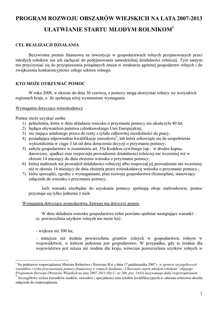 PROGRAM ROZWOJU OBSZARÓW WIEJSKICH NA LATA 2007-2013 UŁATWIANIE STARTU MŁODYM ROLNIKOM1 CEL REALIZACJI DZIAŁANIA Bezzwrotna premia finansowa na inwestycje w gospodarstwach rolnych przejmowanych przez młodych rolników ma ich zachęcać do podejmowania samodzielnej działalności rolniczej. Tym samym ma przyczyniać się do przyspieszenia pożądanych zmian w strukturze agrarnej gospodarstw rolnych i do zwiększenia konkurencyjności całego sektora rolnego. KTO MOŻE OTRZYMAĆ POMOC W roku 2008, w okresie do dnia 30 czerwca, z pomocy mogą skorzystać rolnicy we wszystkich regionach kraju, o ile spełniają niżej wymienione wymagania. Wymagania dotyczące wnioskodawcy Pomoc może uzyskać osoba: 1) pełnoletnia, która w dniu składania wniosku o przyznanie pomocy nie ukończyła 40 lat; 2) będąca obywatelem państwa członkowskiego Unii Europejskiej; 3) nie mająca ustalonego prawa do renty z tytułu całkowitej niezdolności do pracy; 4) posiadająca odpowiednie kwalifikacje zawodowe2, lub która zobowiąże się do uzupełnienia wykształcenia w ciągu 3 lat od dnia doręczenia decyzji o przyznaniu pomocy; 5) nabyła gospodarstwo w rozumieniu art. 55a Kodeksu cywilnego (np.: w drodze kupna, darowizny, spadku) oraz rozpoczęła prowadzenie działalności rolniczej nie wcześniej niż w okresie 14 miesięcy do dnia złożenia wniosku o przyznanie pomocy; 6) której małżonek nie prowadził działalności rolniczej albo rozpoczął jej prowadzenie nie wcześniej niż w okresie 14 miesięcy do dnia złożenia przez wnioskodawcę wniosku o przyznanie pomocy.; 7) która sporządzi, zgodny z wymaganiami, plan rozwoju gospodarstwa (biznesplan), stanowiący załącznik do wniosku o przyznanie pomocy. Jeśli warunki niezbędne do uzyskania pomocy spełniają oboje małżonkowie, pomoc przyznaje się tylko jednemu z nich. Wymagania dotyczące gospodarstwa, którego ma dotyczyć pomoc W dniu składania wniosku gospodarstwo rolne powinno spełniać następujące warunki: : a) powierzchnia użytków rolnych nie może być: - większa niż 300 ha; - mniejsza niż średnia powierzchnia gruntów rolnych w gospodarstwie rolnym w województwie, w którym położone jest gospodarstwo. W przypadku, gdy ta średnia dla województwa jest niższa niż średnia dla kraju, wówczas powierzchnia użytków rolnych w 1 Na podstawie rozporządzenia Ministra Rolnictwa i Rozwoju Wsi z dnia 17 października 2007 r. w sprawie szczegółowych warunków i trybu przyznawania pomocy finansowej w ramach działania „Ułatwianie startu młodym rolnikom” objętego Programem Rozwoju Obszarów Wiejskich na lata 2007-2013 (Dz.U. nr 200, poz. 1443) nazywanego dalej rozporządzeniem. 2 Szczegółowy wykaz kierunków studiów, zawodów i specjalności oraz tytułów kwalifikacyjnych w zakresie rolnictwa określa załącznik do rozporządzenia. 1 posiadanym gospodarstwie nie może być mniejsza niż średnia powierzchnia gruntów rolnych w gospodarstwie rolnym w kraju. b) nie może stanowić przedmiotu współwłasności lub współposiadania, z wyjątkiem małżeńskiej wspólności majątkowej; Osoby, które nabyły gospodarstwo w spadku, na dopełnienie tego warunku mają 180 dni od dnia doręczenia decyzji o przyznaniu pomocy. c) będzie prowadzone samodzielnie przez ubiegającego się o pomoc; d) gospodarstwo spełni wymagania dotyczące ochrony środowiska, higieny i warunków utrzymania zwierząt. Na dopełnienie tego warunku wnioskodawca ma 3 lata, licząc od dnia rozpoczęcia działalności rolniczej. Warunki te powinny być zachowane do dnia upływu 5 lat od dnia wypłaty pomocy. Pomoc może zostać przyznana, jeżeli od dnia rozpoczęcia prowadzenia działalności rolniczej przez wnioskodawcę lub jego małżonka do dnia złożenia wniosku o przyznanie pomocy upłynęło nie więcej niż 14 miesięcy, a do dnia wydania decyzji o przyznaniu pomocy – nie więcej niż 18 miesięcy. Za dzień rozpoczęcia prowadzenia działalności rolniczej uznaje się : 1) dzień wejścia po raz pierwszy w posiadanie nieruchomości o powierzchni użytków rolnych co najmniej 1 ha; 2) w przypadku osób, które nabyły gospodarstwo przed ukończeniem 18 roku życia – dzień ukończenia 18 roku życia; 3) w przypadku osób, które nabyły gospodarstwo przed ukończeniem 18 roku życia i kontynuowały naukę, dzień zakończenia lub zaprzestania nauki, jednakże najpóźniej dzień ukończenia 26 roku życia, pod warunkiem, że wnioskodawca nie miał przerw w nauce, a w przypadku kontynuowania nauki na uczelni – podjęcie nauki nastąpiło w roku uzyskania świadectwa dojrzałości lub świadectwa maturalnego; 4) w przypadku osób, które nabyły gospodarstwo po ukończeniu 18 roku życia, a przed zakończeniem nauki, dzień zakończenia lub zaprzestania nauki, jednakże najpóźniej dzień ukończenia 26 roku życia, pod warunkiem, że wnioskodawca nie miał przerw w nauce, a w przypadku kontynuowania nauki na uczelni – podjęcie nauki nastąpiło w roku uzyskania świadectwa dojrzałości lub świadectwa maturalnego; 5) w przypadku osób, które nabyły gospodarstwo przed rozpoczęciem służby wojskowej lub w trakcie jej odbywania – dzień zakończenia tej służby, pod warunkiem, że rozpoczęcie służby nastąpiło nie później niż 12 miesięcy od dnia nabycia gospodarstwa lub ukończenia 18 roku życia albo od dnia zaprzestania lub zakończenia nauki. 6) dzień dokonania najwcześniejszej z następujących czynności: a) wystąpienie o przyznanie płatności na podstawie przepisów o płatnościach bezpośrednich do gruntów rolnych i oddzielnej płatności cukrowej lub przepisów o płatnościach do gruntów rolnych i płatności cukrowej lub b) wystąpienie o pomoc finansową dla rolników w ramach programu SAPARD, lub c) wystąpienie o pomoc finansową na działania objęte Planem Rozwoju Obszarów Wiejskich na lata 2004-2006, lub d) wystąpienie o przeznaczone dla osób prowadzących działalność rolniczą 