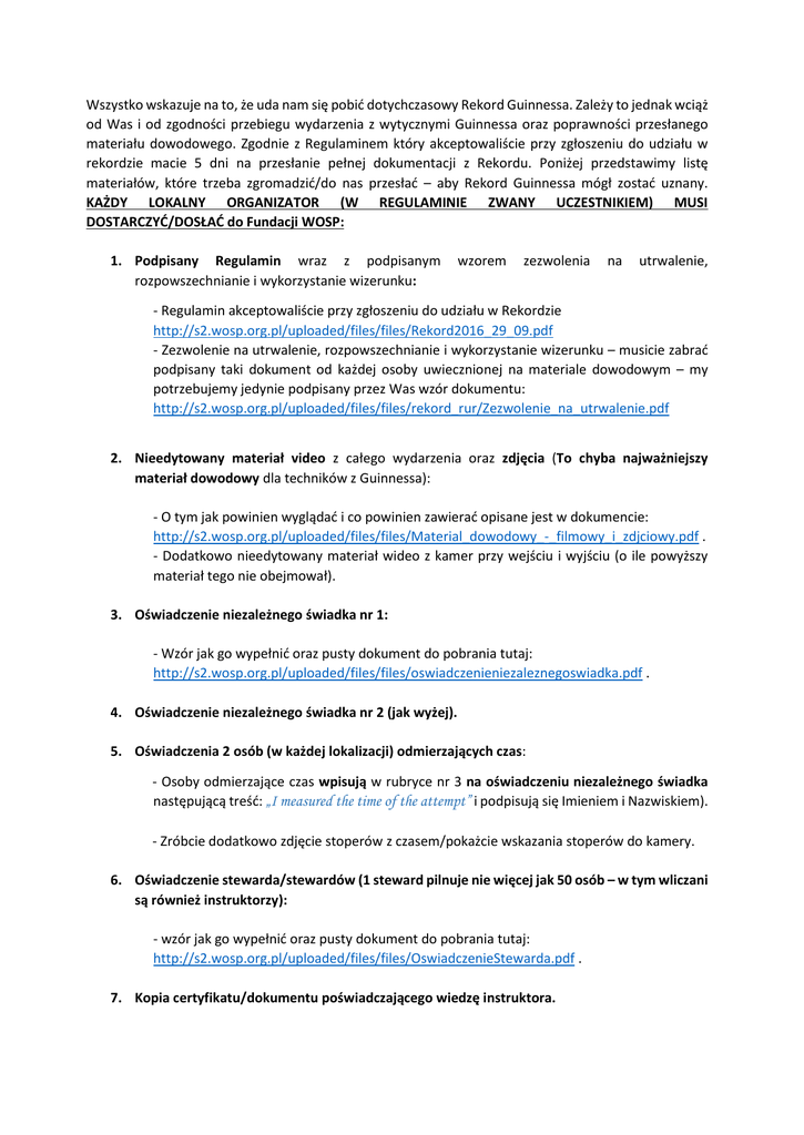Wszystko wskazuje na to, że uda nam się pobić dotychczasowy Rekord Guinnessa. Zależy to jednak wciąż od Was i od zgodności przebiegu wydarzenia z wytycznymi Guinnessa oraz poprawności przesłanego materiału dowodowego. Zgodnie z Regulaminem który akceptowaliście przy zgłoszeniu do udziału w rekordzie macie 5 dni na przesłanie pełnej dokumentacji z Rekordu. Poniżej przedstawimy listę materiałów, które trzeba zgromadzić/do nas przesłać – aby Rekord Guinnessa mógł zostać uznany. KAŻDY LOKALNY ORGANIZATOR (W REGULAMINIE ZWANY UCZESTNIKIEM) MUSI DOSTARCZYĆ/DOSŁAĆ do Fundacji WOSP: 1. Podpisany Regulamin wraz z podpisanym rozpowszechnianie i wykorzystanie wizerunku: wzorem zezwolenia na utrwalenie, - Regulamin akceptowaliście przy zgłoszeniu do udziału w Rekordzie http://s2.wosp.org.pl/uploaded/files/files/Rekord2016_29_09.pdf - Zezwolenie na utrwalenie, rozpowszechnianie i wykorzystanie wizerunku – musicie zabrać podpisany taki dokument od każdej osoby uwiecznionej na materiale dowodowym – my potrzebujemy jedynie podpisany przez Was wzór dokumentu: http://s2.wosp.org.pl/uploaded/files/files/rekord_rur/Zezwolenie_na_utrwalenie.pdf 2. Nieedytowany materiał video z całego wydarzenia oraz zdjęcia (To chyba najważniejszy materiał dowodowy dla techników z Guinnessa): - O tym jak powinien wyglądać i co powinien zawierać opisane jest w dokumencie: http://s2.wosp.org.pl/uploaded/files/files/Material_dowodowy_-_filmowy_i_zdjciowy.pdf . - Dodatkowo nieedytowany materiał wideo z kamer przy wejściu i wyjściu (o ile powyższy materiał tego nie obejmował). 3. Oświadczenie niezależnego świadka nr 1: - Wzór jak go wypełnić oraz pusty dokument do pobrania tutaj: http://s2.wosp.org.pl/uploaded/files/files/oswiadczenieniezaleznegoswiadka.pdf . 4. Oświadczenie niezależnego świadka nr 2 (jak wyżej). 5. Oświadczenia 2 osób (w każdej lokalizacji) odmierzających czas: - Osoby odmierzające czas wpisują w rubryce nr 3 na oświadczeniu niezależnego świadka następującą treść: „I measured the time of the attempt” i podpisują się Imieniem i Nazwiskiem). - Zróbcie dodatkowo zdjęcie stoperów z czasem/pokażcie wskazania stoperów do kamery. 6. Oświadczenie stewarda/stewardów (1 steward pilnuje nie więcej jak 50 osób – w tym wliczani są również instruktorzy): - wzór jak go wypełnić oraz pusty dokument do pobrania tutaj: http://s2.wosp.org.pl/uploaded/files/files/OswiadczenieStewarda.pdf . 7. Kopia certyfikatu/dokumentu poświadczającego wiedzę instruktora. 8. Plan terenu, na którym odbywa się impreza: - Każda lokalizacja przesyła własny plan terenu (odręczny szkic lub zdjęcie z naniesionymi istotnymi z punktu widzenia rekordu informacjami takimi jak: wejście, wyjście, miejsce usytuowania kamer, instruktora/instruktorów, liczba i usytuowanie fantomów itp. )) 9. Lista uczestników: - Imienna (imię i nazwisko osoby biorącej udział w Rekordzie; łącznie z instruktorami) 10. Dodatkowo obowiązkowe, które zostają u Lokalnego Organizatora (zwanego w regulaminie Uczestnikiem) do wglądu przez Organizatora (WOŚP): – Bilety: - Każda potencjalna osoba biorąca udział w lekcji dostaje bilet (łącznie z instruktorem; z wyłączeniem niezależnych świadków (wyraźnie oznaczonych) , stewardów (wyraźnie oznaczonych), osób mierzących czas (wyraźnie oznaczonych), osób obsługujących kamery (wyraźnie oznaczonych) ). - Bilet oddawany jest przy wejściu na teren bicia rekordu bezpośrednio niezależnemu świadkowi lub osobie przez niego nadzorowanej. - Najlepiej, gdyby niezależny świadek po zakończeniu rekordu (jeszcze przy włączonej kamerze) przeliczył bilety. - Bilety pozostają u Lokalnego Organizatora do wglądu dla Fundacji WOŚP. - Zezwolenie na utrwalenie, rozpowszechnianie i wykorzystanie wizerunku: - Każda osoba biorąca udział w Rekordzie, która będzie uwieczniona na materiałach dowodowych (zdjęciowych lub filmowych) musi podpisać stosowne oświadczenie: http://s2.wosp.org.pl/uploaded/files/files/rekord_rur/Zezwolenie_na_utrwalenie.pdf - Zezwolenie pozostaje u Lokalnego Organizatora do wglądu dla Fundacji WOŚP 11. Inne: - We wcześniejszej korespondencji wskazany był dokument ARRA3 – dotyczy on wyłącznie Fundacji WOŚP (nie jest on wymagany od Lokalnych Organizatorów). Opiszcie dokładnie wszystkie materiały od kogo są (nazwa instytucji – jak w formularzu zgłoszeniowym) dodatkowo z podaniem Imienia i Nazwiska Lokalnego Organizatora i kontaktu telefonicznego. Adres wysyłki dokumentacji: Fundacja Wielka Orkiestra Świątecznej Pomocy (Rekord) Ul. Dominikańska 19c 02-738 Warszawa