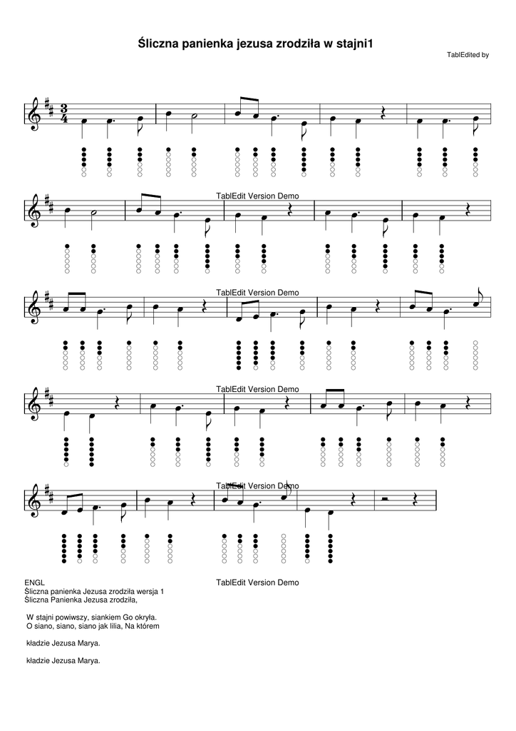 Śliczna panienka jezusa zrodziła w stajni1 TablEdited by ## 3 F 4 U F F F F ## ## ## ## U V U@ U U U. U U U U U. U U@ U. Q U@ U U U. U@ U U Q U U. U U Q ENGL Śliczna panienka Jezusa zrodziła wersja 1 Śliczna Panienka Jezusa zrodziła, W stajni powiwszy, siankiem Go okryła. O siano, siano, siano jak lilia, Na którem kładzie Jezusa Marya. kładzie Jezusa Marya. U U U. V U@ U U U@ Q TablEdit Version Demo U U U. TablEdit Version Demo U U Q TablEdit Version Demo U U U. UJ TablEdit Version Demo TablEdit Version Demo U@ U U Q U U. U U. U@ U U U U U U U. U U Q Q U@ Q UJ U U U. U@ U -R Q U Q