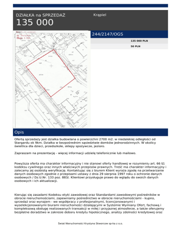 DZIAŁKA na SPRZEDAŻ Krąpiel 135 000 244/2147/OGS 135 000 PLN 50 PLN Opis Ofertą sprzedaży jest działka budowlana o powierzchni 2700 m2. w niedalekiej odległości od Stargardu ok 9km. Działka w bezpośrednim sąsiedztwie domków jednorodzinnych. W okolicy świetlica dla dzieci, przedszkole, sklepy spożywcze, jezioro. Zapraszam na prezentację - więcej informacji udzielę telefonicznie lub mailowo. Powyższa oferta ma charakter informacyjny i nie stanowi oferty handlowej w rozumieniu art. 66 §1 kodeksu cywilnego oraz innych właściwych przepisów prawnych. Treść ma charakter informacyjny i zalecamy jej osobistą weryfikację. Kontaktując się z biurem Klient wyraża zgodę na przetwarzanie danych osobowych zgodnie z przepisami ustawy z dnia 29 sierpnia 1997 roku o ochronie danych osobowych / Dz.U.Nr. 133 poz. 883/. Klientowi przysługuje prawo do wglądu do swoich danych osobowych i ich aktualizacji. Kierując się zasadami Kodeksu etyki zawodowej oraz Standardami zawodowymi pośredników w obrocie nieruchomościami, zapewniamy pośrednictwo w obrocie nieruchomościami - kupno, sprzedaż oraz wynajem - we współpracy z profesjonalnymi, licencjonowanymi i wyselekcjonowanymi biurami nieruchomości działającymi w Systemie Wymiany Ofert, fachową i kompleksową obsługę realizowanych transakcji w miłej i przyjaznej atmosferze, a także oferujemy bezpłatne doradztwo w zakresie doboru kredytu hipotecznego, analizy zdolności kredytowej oraz Świat Nieruchomości Krystyna Skworcow sp-ka z o.o. wszelkich formalności w uzyskaniu kredytu spośród banków PEKAO SA, PKO BP, BZ WBK, BGŻ, GETIN BANK, CREDIT AGRICOLE, MILLENIUM BANK, GE MONEY BANK, ING BANK, DEUTSCHE BANK, BNP PARIBAS, KREDYT BANK, BPH BANK, SANTANDER BANK, ALIOR BANK. Świat Nieruchomości Krystyna Skworcow ul. Chrobrego 5a (Starówka) 73-110 Stargard Szczeciński Tel: 500 296 440 , 915780827 [email protected] Świat Nieruchomości Krystyna Skworcow ul. Chrobrego 5a (Starówka) 73-110 Stargard Szczeciński Tel: 500 296 440 , 915780827 [email protected] Świat Nieruchomości Krystyna Skworcow ul. Chrobrego 5a (Starówka) 73-110 Stargard Szczeciński Tel: 500 296 440 , 915780827 [email protected] mgr Krystyna Skworcow tel. 500 296 440 tel. 91 578 0827 email: [email protected] Świat Nieruchomości Krystyna Skworcow sp-ka z o.o. Powered by TCPDF (www.tcpdf.org)