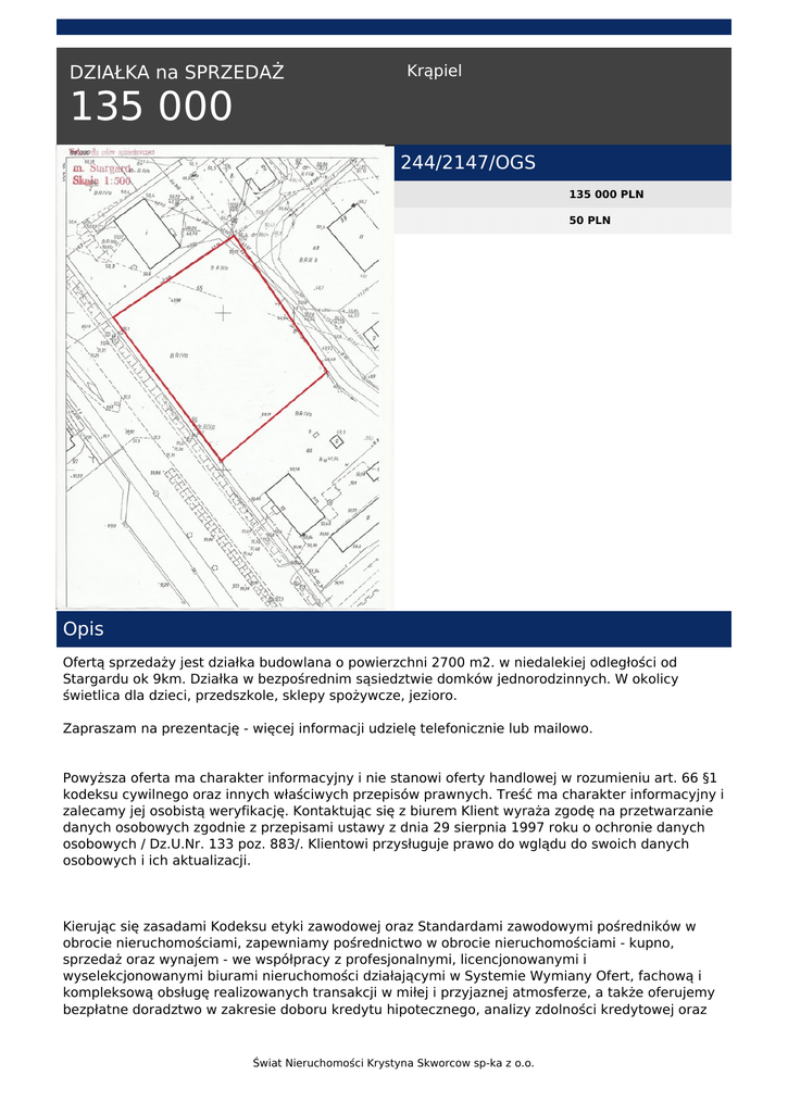 DZIAŁKA na SPRZEDAŻ 244/2147/OGS Opis