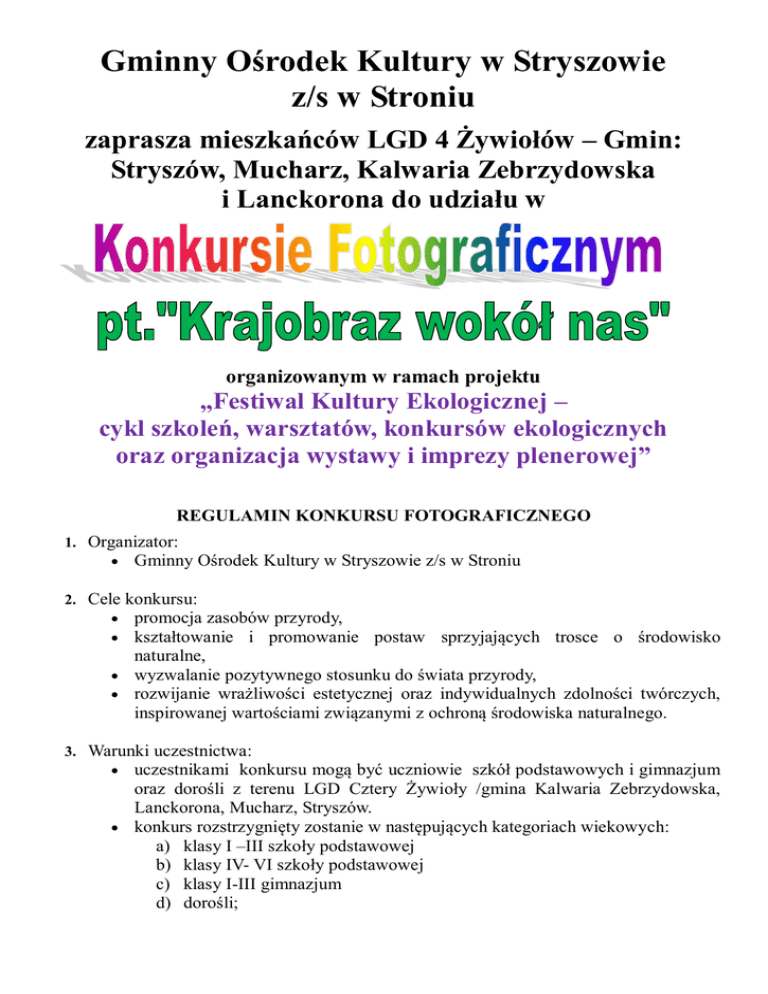 Gminny Ośrodek Kultury w Stryszowie z/s w Stroniu zaprasza mieszkańców LGD 4 Żywiołów – Gmin: Stryszów, Mucharz, Kalwaria Zebrzydowska i Lanckorona do udziału w organizowanym w ramach projektu „Festiwal Kultury Ekologicznej – cykl szkoleń, warsztatów, konkursów ekologicznych oraz organizacja wystawy i imprezy plenerowej” REGULAMIN KONKURSU FOTOGRAFICZNEGO 1. Organizator: Gminny Ośrodek Kultury w Stryszowie z/s w Stroniu 2. Cele konkursu: promocja zasobów przyrody, kształtowanie i promowanie postaw sprzyjających trosce o środowisko naturalne, wyzwalanie pozytywnego stosunku do świata przyrody, rozwijanie wrażliwości estetycznej oraz indywidualnych zdolności twórczych, inspirowanej wartościami związanymi z ochroną środowiska naturalnego. 3. Warunki uczestnictwa: uczestnikami konkursu mogą być uczniowie szkół podstawowych i gimnazjum oraz dorośli z terenu LGD Cztery Żywioły /gmina Kalwaria Zebrzydowska, Lanckorona, Mucharz, Stryszów. konkurs rozstrzygnięty zostanie w następujących kategoriach wiekowych: a) klasy I –III szkoły podstawowej b) klasy IV- VI szkoły podstawowej c) klasy I-III gimnazjum d) dorośli; 4. Tematyka konkursu dotyczy szeroko pojętej ochrony przyrody. Uczestnik konkursu powinien dostarczyć jedną fotografię czarno-białą lub kolorową w postaci wydruku (format min. 18x24 cm) przedstawiającą wybrany krajobraz, przy czym może on być dowolny np.: krajobraz naturalny, krajobraz kulturowy (w szczególności wiejski, miejski, zurbanizowany, zdegradowany). każda praca powinna zawierać następujące informacje: a) dane osobowe autora oraz wiek (klasa), b) adres szkoły do której uczęszcza uczestnik, c) prosimy podpisać prace na odwrocie drukowanymi literami; osoby biorące udział w konkursie „Krajobraz wokół nas” wyrażają zgodę na przetwarzanie danych osobowych zgodnie z ustawą z dnia 29 sierpnia 1997r. o ochronie danych osobowych (Dz. U. z 2002r. Nr 101, poz. 926j.t. ze zmianami); 5. W razie niejasności związanych z regulaminem prosimy o kontakt telefoniczny: 338797479. 6. Termin i miejsce dostarczenia prac: 23.05.2014r., na adres: Gminny Ośrodek Kultury w Stryszowie z/ s w Stroniu 34-145 Stronie 260 (prace można dostarczać osobiście). 7. Prace oceni Jury powołane przez Organizatora. 8. Ogłoszenie wyników i rozdanie nagród odbędzie się podczas imprezy plenerowej „Festiwal Kultury Ekologicznej” przy Dworze Senator w Zakrzowie w dniu 04.06.2014 r. o godz. 11.00. 9. Zwycięzcy zostaną uhonorowani książkami i dyplomami. 10. Uwagi dodatkowe: Rozstrzygnięcie Jury jest ostateczne. Organizator zastrzega sobie prawo zatrzymania prac celem zorganizowania wystawy. Otwarcie wystawy pokonkursowej nastąpi w dniu 04.06.2014 r. w Gminnym Ośrodku Kultury w Stryszowie z/s w Stroniu. Wystawa dostępna będzie przez 1 miesiąc. Projekt współfinansowany ze środków Unii Europejskiej w ramach działania „Wdrażanie lokalnych strategii rozwoju” - mały projekt Programu Rozwoju Obszarów wiejskich na lata 2007-2013.