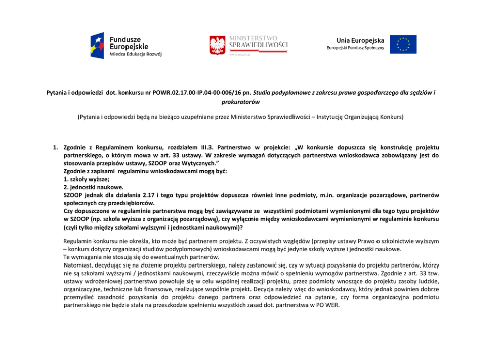 Pytania i odpowiedzi dot. konkursu nr POWR.02.17.00-IP.04-00-006/16 pn. Studia podyplomowe z zakresu prawa gospodarczego dla sędziów i prokuratorów (Pytania i odpowiedzi będą na bieżąco uzupełniane przez Ministerstwo Sprawiedliwości – Instytucję Organizującą Konkurs) 1. Zgodnie z Regulaminem konkursu, rozdziałem III.3. Partnerstwo w projekcie: „W konkursie dopuszcza się konstrukcję projektu partnerskiego, o którym mowa w art. 33 ustawy. W zakresie wymagań dotyczących partnerstwa wnioskodawca zobowiązany jest do stosowania przepisów ustawy, SZOOP oraz Wytycznych.” Zgodnie z zapisami regulaminu wnioskodawcami mogą być: 1. szkoły wyższe; 2. jednostki naukowe. SZOOP jednak dla działania 2.17 i tego typu projektów dopuszcza również inne podmioty, m.in. organizacje pozarządowe, partnerów społecznych czy przedsiębiorców. Czy dopuszczone w regulaminie partnerstwa mogą być zawiązywane ze wszystkimi podmiotami wymienionymi dla tego typu projektów w SZOOP (np. szkoła wyższa z organizacją pozarządową), czy wyłącznie między wnioskodawcami wymienionymi w regulaminie konkursu (czyli tylko między szkołami wyższymi i jednostkami naukowymi)? Regulamin konkursu nie określa, kto może być partnerem projektu. Z oczywistych względów (przepisy ustawy Prawo o szkolnictwie wyższym – konkurs dotyczy organizacji studiów podyplomowych) wnioskodawcami mogą być jedynie szkoły wyższe i jednostki naukowe. Te wymagania nie stosują się do ewentualnych partnerów. Natomiast, decydując się na złożenie projektu partnerskiego, należy zastanowić się, czy w sytuacji pozyskania do projektu partnerów, którzy nie są szkołami wyższymi / jednostkami naukowymi, rzeczywiście można mówić o spełnieniu wymogów partnerstwa. Zgodnie z art. 33 tzw. ustawy wdrożeniowej partnerstwo powołuje się w celu wspólnej realizacji projektu, przez podmioty wnoszące do projektu zasoby ludzkie, organizacyjne, techniczne lub finansowe, realizujące wspólnie projekt. Decyzja należy więc do wnioskodawcy, który jednak powinien dobrze przemyśleć zasadność pozyskania do projektu danego partnera oraz odpowiedzieć na pytanie, czy forma organizacyjna podmiotu partnerskiego nie będzie stała na przeszkodzie spełnieniu wszystkich zasad dot. partnerstwa w PO WER. 2. W jakiej kategorii kosztów (bezpośrednie / pośrednie) należy ująć wynagrodzenie Kierownika studiów podyplomowych? Osoba pełniąca funkcję Kierownika studiów występuje niezależnie od Kierownika projektu odpowiedzialnego za prawidłową realizację projektu i zarządzanie projektem jako całości. W jakiej kategorii kosztów (bezpośrednie / pośrednie) należy ująć wynagrodzenie Sekretarza studiów podyplomowych? Wydaje się więc, iż nie są to czynności wprost wpisujące się w „koszty personelu obsługowego (obsługa kadrowa, finansowa, administracyjna, sekretariat, kancelaria, obsługa prawna) na potrzeby funkcjonowania jednostki” opisane w Wytycznych jako koszty pośrednie, tylko koszty związane z obsługą prowadzonych studiów podyplomowych (nie obsługą samego projektu czy też jednostki jako całości). Decyzję co do tego, czy dany personel należy przypisać do kosztów pośrednich czy bezpośrednich podejmuje i uzasadnia sam wnioskodawca, który sam najlepiej zna potrzeby projektowe oraz zadania, jakie należy przypisać poszczególnym stanowiskom projektowym Poprawność sporządzenia budżetu projektu, także pod kątem wydatków personelu, oceniana jest na etapie oceny merytorycznej dokonywanej przez dwóch niezależnych ekspertów. Zakres kosztów pośrednich w przypadku projektów współfinansowanych z EFS regulują „Wytyczne w zakresie kwalifikowalności wydatków w ramach Europejskiego Funduszu Rozwoju Regionalnego, Europejskiego Funduszu Społecznego oraz Funduszu Spójności na lata 2014-2020” – zgodnie z tym koszty personelu zarządzającego projektem (w poprzedniej perspektywie finansowej – koszty personelu ujętego w zadaniu dot. zarządzania projektem) oraz personelu obsługowego ująć należy w kosztach pośrednich. W kosztach pośrednich powinny być rozliczane a) koszty koordynatora lub kierownika projektu oraz innego personelu bezpośrednio zaangażowanego w zarządzanie projektem i jego rozliczanie, o ile jego zatrudnienie jest niezbędne dla realizacji projektu, w tym w szczególności koszty wynagrodzenia tych osób, ich delegacji służbowych i szkoleń oraz koszty związane z wdrażaniem polityki równych szans przez te osoby, b) koszty zarządu (koszty wynagrodzenia osób uprawnionych do reprezentowania jednostki, których zakresy czynności nie są przypisane wyłącznie do projektu, np. kierownik jednostki), c) koszty personelu obsługowego (obsługa kadrowa, finansowa, administracyjna, sekretariat, kancelaria, obsługa prawna) na potrzeby funkcjonowania jednostki, d) koszty obsługi księgowej (koszty wynagrodzenia osób księgujących wydatki w projekcie, w tym koszty zlecenia prowadzenia obsługi księgowej projektu biuru rachunkowemu). Personel merytoryczny, przypisany bezpośrednio do zadań projektowych stanowi koszt bezpośredni.