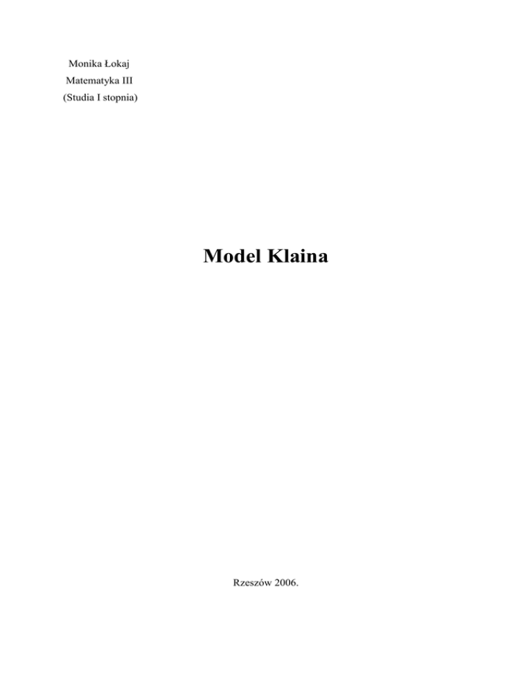 Monika Łokaj Matematyka III (Studia I stopnia) Model Klaina Rzeszów 2006. Geometria hiperboliczna. Płaską geometrię hiperboliczną określa się zwykle w sposób aksjomatyczny, przyjmując wszystkie aksjomaty płaskiej geometrii euklidesowej z wyjątku aksjomatu o równoległości Euklidesa. I tak w miejsce aksjomatu, który brzmi: „przez punkt nie naleŜący do prostej przechodzi, co najwyŜej jedna prosta nie przecinająca danej” przyjmuje się jego zaprzeczenie: „przez punkt nie naleŜący do danej prostej przechodzi co najmniej dwie róŜne proste nie przecinające danej”. Pojęcia pierwotne geometrii hiperbolicznej są te same, co i w geometrii euklidesowej, natomiast mają róŜne własności. W geometrii hiperbolicznej funkcjonują następujące pojęcia: 1. Płaszczyzną Łobaczewskiego nazywać będziemy zbiór wszystkich punktów płaskiej geometrii hiperbolicznej; 2. Proste Łobaczewskiego to proste spełniające aksjomatykę geometrii hiperbolicznej; 3. Odległość punktów – określona dla poszczególnych modeli; 4. Wzajemne połoŜenie prostych: proste równoległe, nadrównoległe, prostopadłe. Oprócz pojęć występują równieŜ określenia, sprecyzowanie których pozwoli na swobodne poruszanie się w terminologii geometrii hiperbolicznej. „Końcem” nazywamy klasę wszystkich prostych równoległych do trzech danych prostych. Koniec na płaszczyźnie hiperbolicznejpełni podobną funkcję, co punkt niewłaściwy na płaszczyźnie afonicznej (Rys. 1). Tak, więc proste równoległe to te proste, które mają wspólny koniec. KaŜda prosta ma dwa końce i dla kaŜdych dwóch końców istnieje wspólna prosta. Oznacza to równieŜ, Ŝe dla dowolnego kąta istnieje prosta równoległa do jego obu ramion. Nosi nazwę prostej zagradzającej dany kąt. Ramiona kąta wraz z tą prostą to obszar zwany trójkątem 2-asymptotycznym (Rys. 2). Proste równoległe mają jeden koniec wspólny; istnieje prosta wspólna dla pozostałych końców. Trzy proste ograniczają obszar zwany trójkątem 3-asymptotycznym. Wszystkie takie trójkąty są przystające (Rys. 3). Istnieje równieŜ trójkąt l-asymptotyczny. Jest to obszar ograniczony przez dwie proste równoległe i prostą ją przecinającą (Rys. 4). Proste nazywamy nadrównoległymi, gdy się nie przecinają i me są równoległe. Takimi prostymi są proste, które maja wspólną prostopadłą. Proste w większej liczbie tworzą tak zwane "pęki" prostych. Pęk I rodzaju - "pęk= właściwy=" tworzą proste przechodzące przez jeden, ustalony punkt (Rys. 5). By poznać i dokładnie zrozumieć przestrzeń hiperboliczną dobrze jest mieć narzędzie ułatwiające to zadanie. Narzędziem takim jest obiekt izomorficzny z dwuwymiarową przestrzenią Boyai-Łobaczewskiego, zwany modelem. Model to inaczej przedstawienie przestrzeni geometrii hiperbolicznej za pomocą aksjomatów i twierdzeń funkcjonujących w geometrii euklidesowej. Do kaŜdego modelu dołączony jest słownik pojęć, tzw. Słownik interpretacyjny pozwalający na lepsze zrozumienie własności modelu. Układ aksjomatów w kaŜdym modelu jest: - niesprzeczny, tzn. na jego podstawie nie moŜna wyprowadzić twierdzeń wzajemnie sobie sprzecznych; - wzajemnie niezaleŜny (mówimy, Ŝe zdanie S jest niezaleŜne od aksjomatów A1, A2, ..., An, jeśli nie da się z nich wyprowadzić). Dowody niesprzeczności i niezaleŜności układu aksjomatów geometrii przeprowadza się metodą interpretacji. Aby dowieść niesprzeczności układu aksjomatów, interpretuje się w pewien sposób jego pojęcia pierwotne i wskazuje się, Ŝe przy tej interpretacji spełnione są wszystkie aksjomaty. Wskazuje się takie zbiory i relacje, które spełniają wszystkie aksjomaty. Dowodząc niezaleŜności pewnego zdania S od aksjomatów A1, A2, ..., An .wskazuje się takie zbiory i relacje, które spełniają aksjomaty A1, A2, ..., An ale nie spełniają zdania S. Model Klaina. Na płaszczyźnie euklidesowej bierzemy wnętrze koła K bez brzegu, zwanego absolutem. Punktami modelu są wszystkie punkty leŜące wewnątrz koła, prostymi są cięciwy koła. Rys. 1 PołoŜenie prostych w modelu Kleina: - proste równoległe; proste, które mają punkt wspólny w absolucie – proste a i b - proste nadrównoległe (rozłączne) np. proste a i c, c i d; - proste prostopadłe do danej prostej to te, których przedłuŜenia przechodzą przez punkt przecięcia stycznych do koła w „końcach” s i g danej prostej, np. b i c. Jak widać w modelu Klaina dwie proste mogą mieć wspólny „koniec” i to są proste równoległe lub mogą mieć wspólną prostopadła tak jak proste nadrównoległe. Przez punkt poza prostą moŜna poprowadzić do niej dwie proste równoległe i nieskończenie wiele prostych nadrównoległych. Odległość w modelu Klaina. Dla określenia odległości między punktami A i B w modelu Klaina potrzebujemy określenia dwustosunku (euklidesowego) czwórki punktów A, B, P, Q. Definicja. Dwustosunkiem czwórki punktów A, B, P, Q na prostej nazywamy liczbę : → → (A,B;P,Q)= AP ⋅ BQ , → → AQ ⋅ BP gdzie strzałki naleŜy rozumieć tak, Ŝe odpowiednie odległości bierzemy z odpowiednim znakiem: plus, gdy punkty następują po sobie zgodnie z ustalonym zwrotem prostej, minus w przeciwnym wypadku. RozwaŜamy wartość bezwzględną dwustosunku więc (A,B;P,Q)= AP ⋅ BQ . AQ ⋅ BP Chcąc, by dwustosunek był większy od 1, wykorzystujemy zaleŜność 1 (A B;P,Q)=a ⇒ (A,B;P,Q)= . a Funkcja określona wzorem d(AB)=lg(A,B;P,Q), która po uwzględnieniu wcześniejszych wzorów przyjmuje postać d(AB)=lg jest metryką w modelu Klaina. AP ⋅ BQ AQ ⋅ BP Literatura. [1] K. Borsuk, W. Szmielew, Podstawy geometrii, Wyd. PWN, Warszawa 1955. [2] M. Kordos, O róŜnych geometriach, Wyd. Alfa, Warszawa 1987. [3] M. Kordos, L. Włodarski, O geometrii dla postronnych, Wyd. PWN, Warszawa1981. [4] L. Dubikajtis, H. Guściora, Interpretacja pojęć geometrii hipe