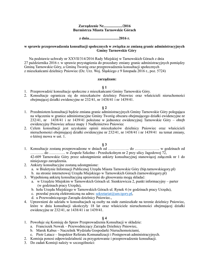 Zarządzenie Nr..................../2016 Burmistrza Miasta Tarnowskie Górach z dnia................................2016 r. w sprawie przeprowadzenia konsultacji społecznych w związku ze zmianą granic administracyjnych Gminy Tarnowskie Góry Na podstawie uchwały nr XXVII/314/2016 Rady Miejskiej w Tarnowskich Górach z dnia 27 października 2016 r. w sprawie przystąpienia do procedury zmiany granic administracyjnych pomiędzy Gminą Tarnowskie Góry, a Gminą Tworóg oraz przeprowadzenia konsultacji społecznych z mieszkańcami dzielnicy Pniowiec (Dz. Urz. Woj. Śląskiego z 9 listopada 2016 r., poz. 5724) zarządzam: §1 1. Przeprowadzić konsultacje społeczne z mieszkańcami Gminy Tarnowskie Góry. 2. Konsultacje ogranicza się do mieszkańców dzielnicy Pniowiec oraz właścicieli nieruchomości obejmującej działki ewidencyjne nr 232/41, nr 1438/41 i nr 1439/41. §2 1. Przedmiotem konsultacji będzie zmiana granic administracyjnych Gminy Tarnowskie Góry polegająca na włączeniu w granice administracyjne Gminy Tworóg obszaru obejmującego działki ewidencyjne nr 232/41, nr 1438/41 i nr 1439/41 położone w jednostce ewidencyjnej Tarnowskie Góry – obręb ewidencyjny Pniowiec arkusz mapy 1 Nadleśnictwo Pniowiec 2. Celem konsultacji jest uzyskanie opinii mieszkańców dzielnicy Pniowiec oraz właścicieli nieruchomości obejmującej działki ewidencyjne nr 232/41, nr 1438/41 i nr 1439/41 na temat zmiany, o której mowa w ust. 1. §3 1. Konsultacje zostaną przeprowadzone w dniach od …………….. do ……………….. w godzinach od ……….. do …………. w Zespole Szkolno - Przedszkolnym nr 2 przy ulicy Jagodowej 72, 42-609 Tarnowskie Góry przez udostępnienie ankiety konsultacyjnej stanowiącej załącznik nr 1 do niniejszego zarządzenia. 2. Ankiety konsultacyjne zostaną udostępnione: a. w Biuletynie Informacji Publicznej Urzędu Miasta Tarnowskie Góry (bip.tarnowskiegory.pl) b. na stronie internetowej Urzędu Miejskiego w Tarnowskich Górach (tarnowskiegory.pl) 3. Wypełnioną ankietę konsultacyjną uprawnieni do głosowania mogą składać: a. w Urzędzie Miejskim w Tarnowskich Górach ul. Sienkiewicza 2, punkt informacyjny – parter (w godzinach pracy Urzędu), b. holu Urzędu Miejskiego w Tarnowskich Górach ul. Rynek 4 (w godzinach pracy Urzędu), c. przesłać pocztą elektroniczną na adres: [email protected], d. u Przewodniczącego Zarządu dzielnicy Pniowiec., 4. Uprawnieni do udziału w konsultacjach są osoby na stałe zamieszkałe na terenie dzielnicy Pniowiec, które w dniu konsultacji ukończyły 18 lat oraz właściciele nieruchomości obejmującej działki ewidencyjne nr 232/41, nr 1438/41 i nr 1439/41. §4 1. Powołuje się Komisję do Spraw Przeprowadzenia Konsultacji w składzie: a. Franciszek Nowak – Przewodniczący Zarządu Dzielnicy Pniowiec, b. Marek Kabus – Naczelnik Wydziału Gospodarki Nieruchomościami, c. Piotr Latacz – Inspektor Referatu Komunalizacji i Postępowań administracyjnych. 2. Komisja ponosi odpowiedzialność za przygotowanie i przeprowadzenie konsultacji. 3. Do zadań Komisji należy w szczególności: a. przeprowadzenie akcji informacyjnej o przedmiocie i zasadach konsultacji, b. przygotowanie punktów i zabezpieczenie urn do głosowania, c. nadzór merytoryczny i formalny nad głosowaniem, d. weryfikacja ankiet konsultacyjnych, e. dyżurowanie w wyznaczonym punkcie przeprowadzania konsultacji. 4. Wyniki konsultacji zostaną zamieszczone w Biuletynie Informacji Publicznej oraz na stronie internetowej Urzędu Miejskiego w Tarnowskich Górach, nie później niż w ciągu 14 dni od zakończenia konsultacji. §5 Zarządzenie wchodzi w życie z dniem podjęcia i podlega ogłoszeniu na stronie internetowej Urzędu Miejskiego w Tarnowskich Górach. Opracował: Piotr Latacz Zatwierdził: Marek Kabus Załącznik nr 1 Do Zarządzenia Nr……………… Burmistrza Miasta Tarnowskie Góry z dnia…………… Ankieta konsultacyjna w sprawie zmiany granic administracyjnych Gminy Tarnowskie Góry polegającej na włączeniu obszaru obejmującego działki ewidencyjne nr 232/41, nr 1438/41 i nr 1439/41 położone w jednostce ewidencyjnej Tarnowskie Góry – obręb ewidencyjny Pniowiec arkusz mapy 1 Nadleśnictwo Pniowiec, do Gminy Tworóg. Pytanie: Czy jest Pan/i za zmianą granic administracyjnych Gminy Tarnowskie Góry polegającą na wyłączeniu obszaru stanowiącego działki nr 232/41, nr 1438/41 i nr 1439/41 położonego w jednostce ewidencyjnej Tarnowskie Góry – obręb ewidencyjny Pniowiec arkusz mapy 1 Nadleśnictwo Pniowiec? Jestem za Jestem przeciw Wstrzymują się Wyrażenie opinii polega na umieszczeniu w odpowiedniej rubryce znaku „X” Uwagi: …………………………………..…………………………………..…………………………………..…… …………………………………..…………………………………..…………………………………..…… …………………………………..…………………………………..…………………………………..…… Ja niżej podpisany(a), oświadczam, że wyrażam zgodę na przetwarzanie moich danych osobowych przez Gminę Tarnowskie Góry, zgodnie z ustawą z dnia 29 sierpnia 1997 r. o ochronie danych osobowych (t.j. Dz. U. z 2002 r., nr 109, poz. 926 z późn zm) z przeznaczeniem ich wykorzystania w procesie ustalania wyników konsultacji społecznej z mieszkańcami Gminy Tarnowskie Góry w przedmiocie zmiany granic administracyjnych Gminy Tarnowskie Góry. Imię i nazwisko Adres zamieszkania Data Podpis Opracował: Piotr Latacz Zatwierdził: Marek Kabus