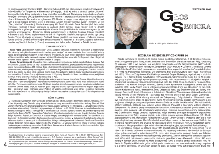 ne zostaną nagrody Explorer 2006 i Camera Extrem 2006. Na stosunkowo młodym Festiwalu Filmów Górskich w Tengersee w Niemczech (IV edycja, 18-22 X) jedną z atrakcji będzie „Odwrót” Jerzego Surdela (który zasiądzie w Jury obok Gerharda Baura). Największy festyn kultury górskiej Ameryki – doroczny (XXXI) Banff Mountain Film Festival – zaprasza do Kanady na dni 28 października – 5 listopada. Do konkursu zgłoszono 300 filmów, z czego przez ekrany przejdzie 50. Jednym z gości będzie Simone Moro z prelekcją „Osiem Tysięcy Metrów Życia” i filmami, w tym „Ciao, Martina”. Prezentacji filmów towarzyszy XIII Banff Mountain Book Festival (1-3 listopada). Francuski Festiwal Filmów Górskich w Autrans (XXIII edycja) skupi fanów kina w dniach 6–10 grudnia, a głównym tematem będzie 30-lecie Groupe Militaire de Haute Montagne z jej dorobkiem wyprawowym i filmowym. Coraz popularniejszy w Bułgarii Festiwal Filmów Górskich w Bansko u stóp Pirynu zaplanowano na dni 15-17 grudnia. Szefem Jury zgodził się i tu być Jerzy Surdel. To już VI edycja tej imprezy. Festiwali filmów górskich jest coraz więcej – l’alliance Internationale pour le Cinéma de Montagne skupia obecnie 17 festiwali z 13 krajów, a jest to tylko mała cząstka ogólnej ich liczby (z Francji zrzeszony jest tylko jeden festiwal, z Polski żaden). WRZESIEŃ 2006 Jubilat w obiektywie Mariana Bały Z NASZEJ POCZTY Maciej Popko. Dziêki za ostatni „G³os Seniora”. Drobna uwaga do wzmianki o Avicennie: nie nazywa³bym go filozofem arabskim, skoro by³ Irañczykiem i wprawdzie iraniœci uwa¿aj¹ go za „swojego”, ale nawet okreœlenie „filozof muzu³mañski” jest zbyt w¹skie, bo tak naprawdê by³ uczonym w skali œwiatowej. W latach 50. na ca³ym œwiecie obchodzono 1000-lecie jego urodzin, w Polsce powsta³ tom wielce naukowych rozpraw z tej okazji. U mnie wci¹¿ trwa sezon letni. Po Gorganach, Litwie i Bu³garii odwiedzi³em Beskid S¹decki i Pieniny. Niebawem wracam w Gorgany. Andrzej Baron Sk³odowski. 12 wrzeœnia 2006 – w kilkanaœcie dni po jubileuszu Micha³a Jagie³³y i Roberta Janika na Zadnim Gierlachu („Gazetka Górska” 29 VIII) – przeszliœmy z Robertem bardzo ³adn¹, prawdopodobnie now¹ drogê na po³udniowej œcianie Huncowskiego Szczytu. 250-metrowa droga o trudnoœciach III+ i znakomitej asekuracji (a wiêc prawdziwie godna polecenia weteranom), wiedzie pomiêdzy drog¹ WHP 3372 a dwiema drogami Marka Pronobisa, opisanymi w „Taterniku” 1–2/2006. Jest to doœæ strome (na dole) ¿ebro o piêknej, mocnej skale. Nie spotkaliœmy ¿adnych œladów ewentualnych poprzedników, sami zostawiliœmy 5 haków. Czas przejœcia oceniamy na 1 1/2 godziny. Gondolka do Stawu £omnickiego skraca podejœcie do 45 minut. A teraz jedziemy z Iwon¹ na 10-dniowy urlop w Alpy. W³adys³aw Janowski. Spêdziliœmy z Hani¹ krótkie wakacje wspinaczkowe w hiszpañskiej Siuranie. Wyjazd bardzo udany, forma roœnie i – jeœli tak dalej pójdzie – mo¿na liczyæ na dobre wspinanie tej jesieni. Wci¹¿ marzy mi siê poprowadzenie trudnoœci 5.13a... Tymczasem w ostatnim numerze „Climbinga” ukaza³ siê trochê humorystyczny artyku³ o wspinaniu w ska³kach pod Krakowem. G³ównie zreszt¹ o tym, co mo¿e tam goœci z zagranicy dra¿niæ, czyli o ogranicznikach na drogach, zagêszczeniu dróg i – co siê z tym wi¹¿e – nadmiarze spitów. Problem, jak wiadomo, nie tylko nasz, u nas jednak – ze wzglêdu na niewielk¹ iloœæ ska³y, w porównaniu np. z Hiszpani¹ czy choæby Czechami – szczególnie rzucaj¹cy siê w oczy. O Siuranie postaram siê napisaæ osobno. GÓRY I LUDZIE 14 wrzeœnia w Zakopanem zmar³ w wieku 85 lat Adam Liberak, taternik, narciarz i dziennikarz, redaktor „Pamiêtnika PTT”. W dwa dni póŸniej u stóp Gierlachu zgin¹³ w lawinie kamiennej znany warszawski taternik i dzia³acz klubowy, Ziemowit Wirski „Ziomek”. Mia³ 48 lat. Obu zmar³ych po¿egnaliœmy w naszej „Gazetce Górskiej” z 16 i 18 wrzeœnia. ● Janusz Kurczab informuje o zmianie adresu redakcji „Taternika” i jego prywatnego: ul. Krakusa 1 m 13; 03-390 Warszawa. Numery telefonów i adresy mailowe pozostaj¹ bez zmian. ● Istniej¹cy od 15 lat s³owacki Klub Tatrancov zaprosi³ 2 wrzeœnia do Jaworzyny Spiskiej delegacje Klubów Seniora TOPR i Przewodników Tatrzañskich. W spotkaniu udzia³ wziêli m.in. Jan Krupski, Kazimierz G¹sienica Byrcyn, Apoloniusz Rajwa i Jan Komornicki, w sk³adzie delegacji s³owackiej byli m.in. burmistrz Vysoké Tatry Jan Mokoš oraz dawny szef HS, himalaista Ivan Gálfy. Spotkania postanowiono powtarzaæ co roku. ● Du¿y zaszczyt spotka³ naukê polsk¹ ale tak¿e nasz alpinizm za spraw¹ prof. dra Zdzis³awa Ryna, którego czo³owy peruwiañski Universidad Científica del Sur w Limie obdarzy³ doktoratem honoris causa. Nadano mu ten tytu³ 27 czerwca – „w uznaniu wieloletniego wk³adu w wymianê kulturaln¹ i budowanie porozumienia miêdzy narodami Polski i Peru”. Równoczeœnie Academia Peruana de Salud mianowa³a Prof. Ryna swoim académico honorarío. Serdecznie Gratulujemy! ● 4 Redakcja i teksty (z wyjątkiem osobno sygnowanych): Józef Nyka, ul. Klaudyny 12 m 79; 01-684 Warszawa. Tel. [48] 22-833-07-75; e-mail <[email protected]>. P.T. Seniorzy proszeni są o współpracę. „Głos Seniora” nie czerpie materiałów z krajowych czasopism górskich ani z bliskich tematycznie polskich stron internetowych. Pisemko rozprowadzane jest bezpłatnie, numer bieżący można pobrać do druku z adresu internetowego <www.nyka. home.pl/pub/gs200609.pdf>; ostatnie numery są dostępne w internecie na stronie: <www.nyka.home.pl>. ZDZISŁAW DZIĘDZIELEWICZ-KIRKIN 90 Każda rozmowa ze Zdzichem to lekcja historii polskiego taternictwa. Z 90 lat jego życia nieomal 75 wypełniły góry: Tatry, skałki, śnieżne stoki Beskidów, ale także Kaukaz i Alpy. Urodzony 25 września 1916 r. we Lwowie, jest wnukiem przyrodnika Józefa D