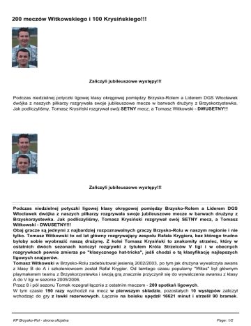 200 meczów Witkowskiego i 100 Krysińskiego!!! Zaliczyli jubileuszowe występy!!! Podczas niedzielnej potyczki ligowej klasy okręgowej pomiędzy Brzysko-Rolem a Liderem DGS Włocławek dwójka z naszych piłkarzy rozgrywała swoje jubileuszowe mecze w barwach drużyny z Brzyskorzystewka. Jak podliczyliśmy, Tomasz Krysiński rozgrywał swój SETNY mecz, a Tomasz Witkowski - DWUSETNY!!! Zaliczyli jubileuszowe występy!!! Podczas niedzielnej potyczki ligowej klasy okręgowej pomiędzy Brzysko-Rolem a Liderem DGS Włocławek dwójka z naszych piłkarzy rozgrywała swoje jubileuszowe mecze w barwach drużyny z Brzyskorzystewka. Jak podliczyliśmy, Tomasz Krysiński rozgrywał swój SETNY mecz, a Tomasz Witkowski - DWUSETNY!!! Obaj gracze są jednymi z najbardziej rozpoznawalnych graczy Brzysko-Rolu w naszym regionie i nie tylko. Tomasz Witkowski to od lat główny rozgrywający zespołu Rafała Krygiera, bez którego trudno byłoby sobie wyobrazić naszą drużynę. Z kolei Tomasz Krysiński to znakomity strzelec, który w ostatnich dwóch sezonach kończył rozgrywki z tytułem Króla Strzelców V ligi i w obecnych rozgrywkach pewnie zmierza po "klasycznego hat-tricka", jeśli chodzi o tą klasyfikację najlepszych ligowych snajperów. Tomasz Witkowski w Brzysko-Rolu zadebiutował jesienią 2002/2003, po tym jak drużyna wywalczyła awans z klasy B do A i szkoleniowcem został Rafał Krygier. Od tamtego czasu popularny "Witos" był głównym playmakerem teamu z Brzyskorzystewka i swoją grą znacznie przyczynił się do wywalczenia awansu z klasy A do V ligi w sezonie 2005/2006. Przez 8 i pół sezonu Tomek rozegrał łącznie z ostatnim meczem - 200 spotkań ligowych. W tym czasie 190 razy wychodził na mecz w pierwszym składzie, pozostałych 10 występów zaliczył wchodząc do gry z ławki rezerwowych. Łącznie na boisku spędził 16621 minut i strzelił 90 bramek. KP Brzysko-Rol - strona oficjalna Page: 1/2 Asyst oraz rozgrywania akcji po których gole zdobywali jego partnerzy nie sposób zliczyć. Powyższe rezultaty dają mu średnią 83 minut na mecz oraz 0,45 gola/mecz (gol średnio co 83 minuty). Zobacz statystyki Tomasza Witkowskiego ---> KLIKNIJ Tomasz Krysiński z kolei w Brzyskorzystewku pojawił się wraz z początkiem rundy wiosennej sezonu 2006/2007. Od tamtej pory zaliczył w barwach naszej drużyny dokładnie 100 występów!!!/ "Krysina" to absolutny rekordzista jeśli chodzi o statystyki strzeleckie w Brzysko-Rolu. W 100 meczach napastnik ten zdobył aż 93 bramki, co daje średnią 0,93 gola/mecz!!!. Pod tym względem wyprzedza nawet Piotra Rutkowskiego, który w 234 meczach zaliczył 212 trafień ze średnią 0,90 gola/mecz. We wspomnianych 100 występach Tomasz Krysiński 96 razy zaczynał mecz w wyjściowej jedenastce, a cztery razy wchodził na boisko z ławki rezerwowych. W grze uczestniczył łącznie 8444 minuty. Imponujące wyniki strzeleckie w minionych dwóch sezonach dały naszemu napastnikowi tytuły Króla Strzelców V ligi i wszystkie znaki na niebie wskazują, że Tomek w obecnych rozgrywkach powtórzy ten wyczyn. Zobacz statystyki Tomasza Krysińskiego ---> KLIKNIJ Nawiązując do w/w statystyk, to najwięcej występów w Brzysko-Rolu zaliczył Piotr Rutkowski - 234 mecze. Drugi pod tym względem jest Jarosław Milejczak, który uczestniczył w 211 meczach. Trzeci w klasyfikacji jest Tomasz Witkowski - 200 meczów. Wkrótce do tego gron dołączyć powinni Karol Klucz - 196 występów oraz Rafał Krygier - 188 występów. Statystyczne osiągnięcia wszystkich obecnych graczy Brzysko-Rolu znajdziecie w dziale "KARDA BRZYSKO-ROLU", gdzie po kliknięciu na konkretnego piłkarza, znajdziecie wszystkie liczbowe dane dotyczące występów w meczach ligowych w pierwszej drużynie. Zobacz statystyki ---> KLIKNIJ Wysłane przez : koniubrzesc, dnia 31 marzec 2011 KP Brzysko-Rol - strona oficjalna Page: 2/2