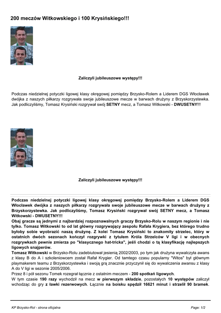200 meczów Witkowskiego i 100 Krysińskiego!!! - KP Brzysko-Rol