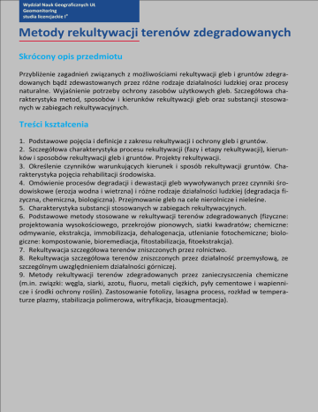 Wydział Nauk Geograficznych UŁ Geomonitoring o studia licencjackie I Metody rekultywacji terenów zdegradowanych Skrócony opis przedmiotu Przybliżenie zagadnień związanych z możliwościami rekultywacji gleb i gruntów zdegradowanych bądź zdewastowanych przez różne rodzaje działalności ludzkiej oraz procesy naturalne. Wyjaśnienie potrzeby ochrony zasobów użytkowych gleb. Szczegółowa charakterystyka metod, sposobów i kierunków rekultywacji gleb oraz substancji stosowanych w zabiegach rekultywacyjnych. Treści kształcenia 1. Podstawowe pojęcia i definicje z zakresu rekultywacji i ochrony gleb i gruntów. 2. Szczegółowa charakterystyka procesu rekultywacji (fazy i etapy rekultywacji), kierunków i sposobów rekultywacji gleb i gruntów. Projekty rekultywacji. 3. Określenie czynników warunkujących kierunek i sposób rekultywacji gruntów. Charakterystyka pojęcia rehabilitacji środowiska. 4. Omówienie procesów degradacji i dewastacji gleb wywoływanych przez czynniki środowiskowe (erozja wodna i wietrzna) i różne rodzaje działalności ludzkiej (degradacja fizyczna, chemiczna, biologiczna). Przejmowanie gleb na cele nierolnicze i nieleśne. 5. Charakterystyka substancji stosowanych w zabiegach rekultywacyjnych. 6. Podstawowe metody stosowane w rekultywacji terenów zdegradowanych (fizyczne: projektowania wysokościowego, przekrojów pionowych, siatki kwadratów; chemiczne: odmywanie, ekstrakcja, immobilizacja, dehalogenacja, utlenianie fotochemiczne; biologiczne: kompostowanie, bioremediacja, fitostabilizacja, fitoekstrakcja). 7. Rekultywacja szczegółowa terenów zniszczonych przez rolnictwo. 8. Rekultywacja szczegółowa terenów zniszczonych przez działalność przemysłową, ze szczególnym uwzględnieniem działalności górniczej. 9. Metody rekultywacji terenów zdegradowanych przez zanieczyszczenia chemiczne (m.in. związki: węgla, siarki, azotu, fluoru, metali ciężkich, pyły cementowe i wapiennicze i środki ochrony roślin). Zastosowanie fotolizy, lasagna process, rozkład w temperaturze plazmy, stabilizacja polimerowa, witryfikacja, bioaugmentacja).