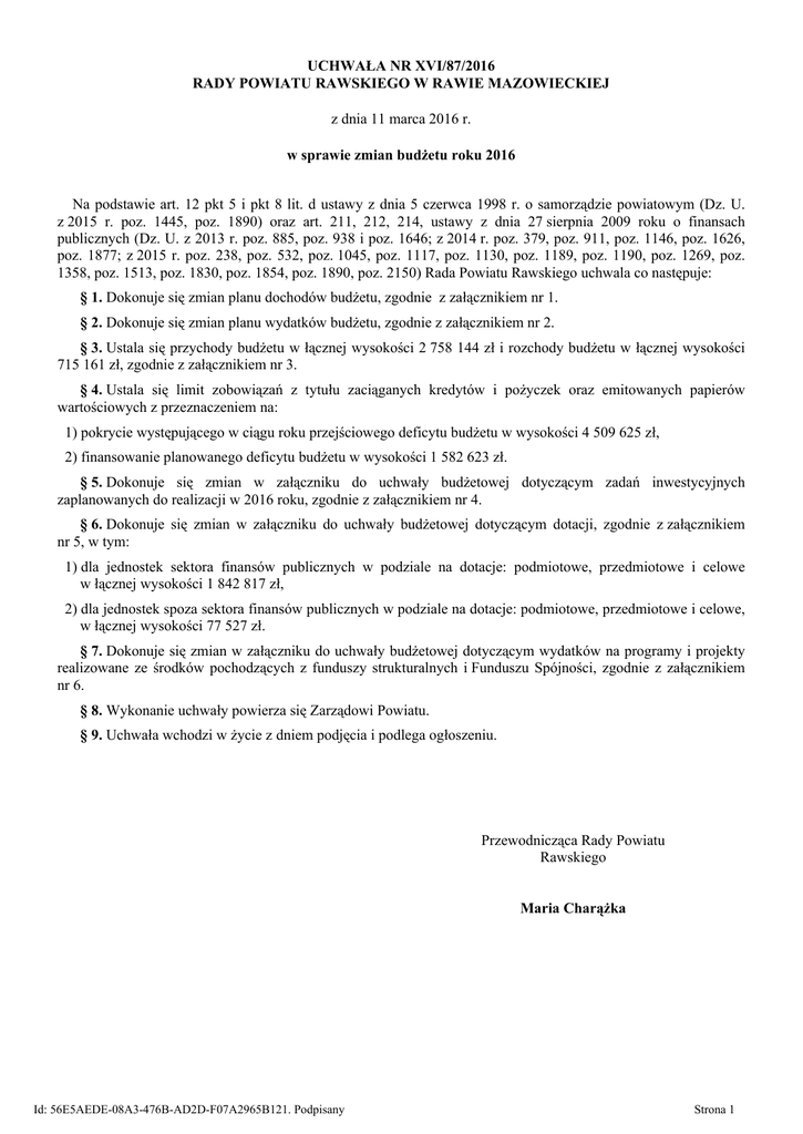 UCHWAŁA NR XVI/87/2016 RADY POWIATU RAWSKIEGO W RAWIE MAZOWIECKIEJ z dnia 11 marca 2016 r. w sprawie zmian budżetu roku 2016 Na podstawie art. 12 pkt 5 i pkt 8 lit. d ustawy z dnia 5 czerwca 1998 r. o samorządzie powiatowym (Dz. U. z 2015 r. poz. 1445, poz. 1890) oraz art. 211, 212, 214, ustawy z dnia 27 sierpnia 2009 roku o finansach publicznych (Dz. U. z 2013 r. poz. 885, poz. 938 i poz. 1646; z 2014 r. poz. 379, poz. 911, poz. 1146, poz. 1626, poz. 1877; z 2015 r. poz. 238, poz. 532, poz. 1045, poz. 1117, poz. 1130, poz. 1189, poz. 1190, poz. 1269, poz. 1358, poz. 1513, poz. 1830, poz. 1854, poz. 1890, poz. 2150) Rada Powiatu Rawskiego uchwala co następuje: § 1. Dokonuje się zmian planu dochodów budżetu, zgodnie z załącznikiem nr 1. § 2. Dokonuje się zmian planu wydatków budżetu, zgodnie z załącznikiem nr 2. § 3. Ustala się przychody budżetu w łącznej wysokości 2 758 144 zł i rozchody budżetu w łącznej wysokości 715 161 zł, zgodnie z załącznikiem nr 3. § 4. Ustala się limit zobowiązań z tytułu zaciąganych kredytów i pożyczek oraz emitowanych papierów wartościowych z przeznaczeniem na: 1) pokrycie występującego w ciągu roku przejściowego deficytu budżetu w wysokości 4 509 625 zł, 2) finansowanie planowanego deficytu budżetu w wysokości 1 582 623 zł. § 5. Dokonuje się zmian w załączniku do uchwały budżetowej dotyczącym zadań inwestycyjnych zaplanowanych do realizacji w 2016 roku, zgodnie z załącznikiem nr 4. § 6. Dokonuje się zmian w załączniku do uchwały budżetowej dotyczącym dotacji, zgodnie z załącznikiem nr 5, w tym: 1) dla jednostek sektora finansów publicznych w podziale na dotacje: podmiotowe, przedmiotowe i celowe w łącznej wysokości 1 842 817 zł, 2) dla jednostek spoza sektora finansów publicznych w podziale na dotacje: podmiotowe, przedmiotowe i celowe, w łącznej wysokości 77 527 zł. § 7. Dokonuje się zmian w załączniku do uchwały budżetowej dotyczącym wydatków na programy i projekty realizowane ze środków pochodzących z funduszy strukturalnych i Funduszu Spójności, zgodnie z załącznikiem nr 6. § 8. Wykonanie uchwały powierza się Zarządowi Powiatu. § 9. Uchwała wchodzi w życie z dniem podjęcia i podlega ogłoszeniu. Przewodnicząca Rady Powiatu Rawskiego Maria Charążka Id: 56E5AEDE-08A3-476B-AD2D-F07A2965B121. Podpisany Strona 1 Załącznik Nr 1 do Uchwały Nr XVI/87/2016 Rady Powiatu Rawskiego w Rawie Mazowieckiej z dnia 11 marca 2016 r. Dochody Budżetu Powiatu Rawskiego Dział Rozdział § Nazwa Kwota zmniejszenia Kwota zwiększenia Dochody bieżące własne (5+6+7+8 +9) 1 801 80195 2007 853 85333 2690 2 Oświata i wychowanie Pozostała działalność Dotacje celowe w ramach programów finansowanych z udziałem środków europejskich oraz środków, o których mowa w art. 5 ust. 1 pkt 3 oraz ust. 3 pkt 5 i 6 ustawy, lub płatności w ramach budżetu środków europejskich, Pozostałe zadania w zakresie polityki społecznej Powiatowe urzędy pracy Środki Funduszu Pracy przekazane powiatom z przeznaczeniem na finansowanie kosztów wynagrodzenia i składek na ubezpieczenia społeczne pracowników powiatowego urzędu pracy Razem Id: 56E5AEDE-08A3-476B-AD2D-F07A2965B121. Podpisany 3 3 4 5 5 910 5 910 5 910 5 910 5 910 5 910 188 000 188 000 188 000 188 000 188 000 188 000 188 000 188 000 188 000 193 910 193 910 188 000 z zakresu adm. rządowej i innych zleconych jst ustawami 6 w tym realizowane w drodze umów lub porozumień z organami adm. rządowej 7 w drodze umów lub porozumień jst oraz pozostałe dotacje 8 środki na zadania bieżące z udziałem środków unijnych 9 Dochody majątkowe 10 5 910 5 910 5 910 5 910 Strona 1 Załącznik Nr 2 do Uchwały Nr XVI/87/2016 Rady Powiatu Rawskiego w Rawie Mazowieckiej z dnia 11 marca 2016 r. Wydatki Budżetu Powiatu Rawskiego – zmniejszenia i zwiększenia w tym w tym Dz. 1 758 801 851 852 853 Rozdział 2 Różne rozliczenia 75818-zadania własne Starostwo Oświata i wychowanie 80195 Projekt ZS CEZiU RM Ochrona zdrowia 85111-zadania własne Starostwo Pomoc społeczna 85204-zadania własne Starostwo 85218-zadania własne Starostwo Pozostałe zadania w zakresie polityki społecznej 85333-zadania własne PUP RM 85395-zadania własne Starostwo Wydatki zmniejszenia 3 22 000 22 000 22 000 4 000 4 000 4 000 Wydatki zwiększenia 3 10 077 10 077 10 077 22 000 22 000 22 000 4 000 Razem wydatki bieżące 4 -22 000 -22 000 -22 000 10 077 10 077 10 077 Jednostki budżetowe Razem 5 -22 000 -22 000 -22 000 Wynagr. i pochodne 6 Zadania statutowe 7 -22 000 -22 000 -22 000 Dotacje na zadania bieżące 8 Wydatki z udział. środków UE Poręczen. i gwaranc. Obsługa długu 9 10 11 12 Razem wydatki majątk. 13 14 22 000 22 000 22 000 22 000 22 000 22 000 15 10 077 10 077 10 077 0 -4 000 -4 000 4 000 4 000 1 000 -3 000 -3 000 4 000 4 000 -1 000 -1 000 -1 000 4 000 4 000 0 -4 000 -4 000 4 000 4 000 134 188 134 188 000 187 866 188 000 -134 134 188 000 188 000 0 0 188 000 188 000 -134 -134 188 000 188 000 134 134 188 000 188 000 134 134 -134 -134 134 134 Id: 56E5AEDE-08A3-476B-AD2D-F07A2965B121. Podpisany Świadcz. na rzecz osób fizyczn. Inwestycje i zakupy inwestycyjne w tym z udziałem środków z UE Strona 1 Razem: 26 134 224 211 Id: 56E5AEDE-08A3-476B-AD2D-F07A2965B121. Podpisany 176 077 165 866 189 000 -23 134 134 10 077 22 000 22 000 Strona 2 Załącznik Nr 3 do Uchwały Nr XVI/87/2016 Rady Powiatu Rawskiego w Rawie Mazowieckiej z dnia 11 marca 2016 r. Przychody i rozchody budżetu w 2016 roku Lp. Treść 1 2 Przychody ogółem: 1 Kredyty i pożyczki 2 Pożyczki na finansowanie zadań realizowanych z udziałem środków pochodzących z budżetu UE 3 Spłaty pożyczek udzielonych 4 Prywatyzacja majątku jst 5 Nadwyżka budżetu z lat ubiegłych 6 Papiery wartościowe (obligacje) 7 Inne źródła (wolne środki) Rozchody: 1 Spłaty kredytów i pożyczek 2 Spłaty pożyczek otrzymanych na finansowanie zadań realizowanych z udziałem środków pochod