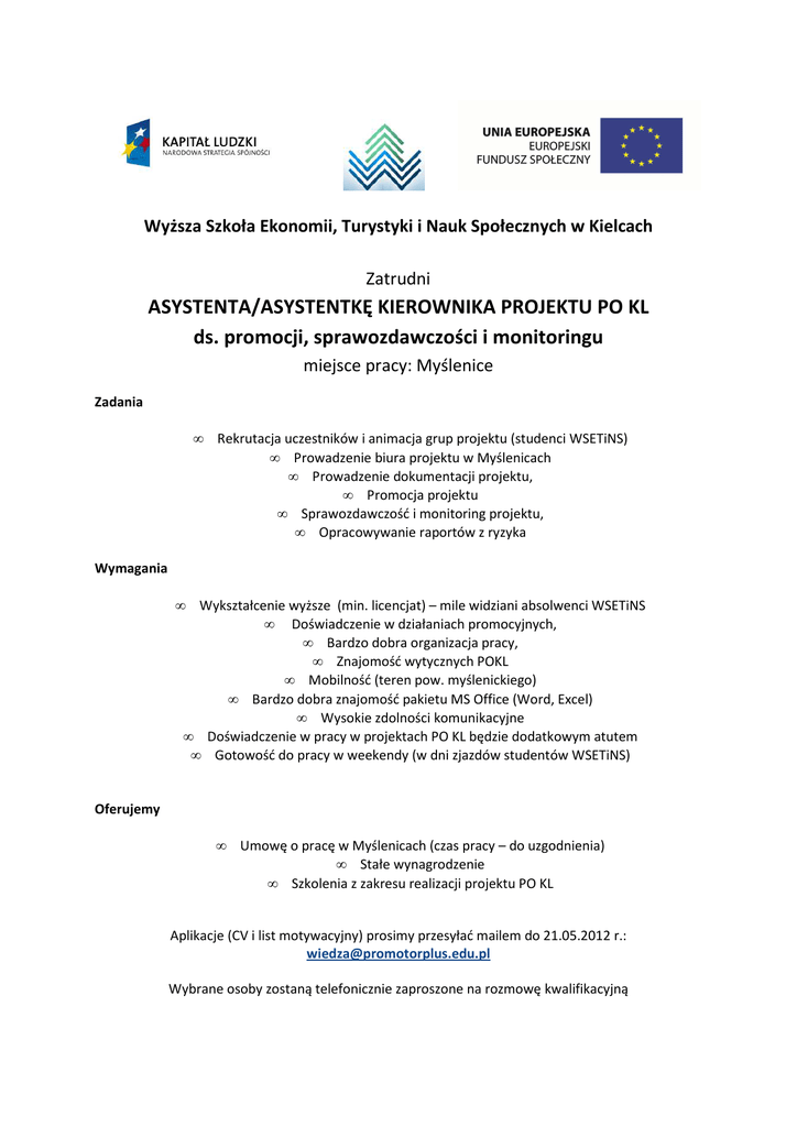 Wyższa Szkoła Ekonomii, Turystyki i Nauk Społecznych w Kielcach Zatrudni ASYSTENTA/ASYSTENTKĘ KIEROWNIKA PROJEKTU PO KL ds. promocji, sprawozdawczości i monitoringu miejsce pracy: Myślenice Zadania • Rekrutacja uczestników i animacja grup projektu (studenci WSETiNS) • Prowadzenie biura projektu w Myślenicach • Prowadzenie dokumentacji projektu, • Promocja projektu • Sprawozdawczość i monitoring projektu, • Opracowywanie raportów z ryzyka Wymagania • Wykształcenie wyższe (min. licencjat) – mile widziani absolwenci WSETiNS • Doświadczenie w działaniach promocyjnych, • Bardzo dobra organizacja pracy, • Znajomość wytycznych POKL • Mobilność (teren pow. myślenickiego) • Bardzo dobra znajomość pakietu MS Office (Word, Excel) • Wysokie zdolności komunikacyjne • Doświadczenie w pracy w projektach PO KL będzie dodatkowym atutem • Gotowość do pracy w weekendy (w dni zjazdów studentów WSETiNS) Oferujemy • Umowę o pracę w Myślenicach (czas pracy – do uzgodnienia) • Stałe wynagrodzenie • Szkolenia z zakresu realizacji projektu PO KL Aplikacje (CV i list motywacyjny) prosimy przesyłać mailem do 21.05.2012 r.: [email protected] Wybrane osoby zostaną telefonicznie zaproszone na rozmowę kwalifikacyjną