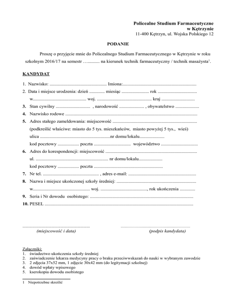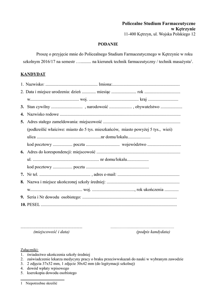 Policealne Studium Farmaceutyczne w Kętrzynie 11-400 Kętrzyn, ul. Wojska Polskiego 12 PODANIE Proszę o przyjęcie mnie do Policealnego Studium Farmaceutycznego w Kętrzynie w roku szkolnym 2016/17 na semestr ….......... na kierunek technik farmaceutyczny / technik masażysta1. KANDYDAT 1. Nazwisko: ................................................ Imiona:.............................................................. 2. Data i miejsce urodzenia: dzień ............. miesiąc ....................... rok ................................. w............................................. woj. .............................................. kraj ............................ 3. Stan cywilny ............................. , narodowość ..................... , obywatelstwo .................... 4. Nazwisko rodowe ............................................................................................................... 5. Adres stałego zameldowania: miejscowość ....................................................................... (podkreślić właściwe: miasto do 5 tys. mieszkańców, miasto powyżej 5 tys., wieś) ulica ...........................................................nr domu/lokalu..................... kod pocztowy .................. poczta ............................... województwo ............................... 6. Adres do korespondencji: miejscowość ............................................................................. ul. ............................................................. nr domu/lokalu.................... kod pocztowy .................. poczta .......................................................... 7. Nr tel. ............................................... , adres e-mail: ......................................................... 8. Nazwa i miejsce ukończonej szkoły średniej: ................................................................... w................................................ woj. ......................................., rok ukończenia ............. 9. Seria i Nr dowodu osobistego: ....................................................................................... 10. PESEL ............................................................................................................................. .............................................................. (miejscowość i data) ...................................................................... (podpis kandydata) Załączniki: 1. świadectwo ukończenia szkoły średniej 2. zaświadczenie lekarza medycyny pracy o braku przeciwwskazań do nauki w wybranym zawodzie 3. 2 zdjęcia 37x52 mm, 1 zdjęcie 30x42 mm (do legitymacji szkolnej) 4. dowód wpłaty wpisowego 5. kserokopia dowodu osobistego 1 Niepotrzebne skreślić ANKIETA KWALIFIKACYJNA 1 Imię i nazwisko 2 Wykształcenie, posiadany tytuł 3 Nazwy i rok ukończenia szkół: - średniej - policealnej / wyższej 4 Uzyskane końcowe oceny z przedmiotów - biologia - chemia */ wychowanie fizyczne** 5 Wybór języka obcego 6 Doświadczenie zawodowe - staż pracy - aktualne/ostatnie miejsce pracy 7 Uzasadnienie wyboru Policealnego Studium Farmaceutycznego w Kętrzynie 8 Źródło informacji o Policealnym Studium Farmaceutycznym w Kętrzynie * dla zawodu technik farmaceutyczny, ** dla zawodu technik masażysta OŚWIADCZENIE Oświadczam, że zgodnie z art. 24 Ustawy z dnia 29 sierpnia 1997 roku o ochronie danych osobowych (tekst jednolity: Dz.U.2014 r. poz. 1182 z późn. zm.) zostałam (em) poinformowana(y) o tym, że: 1) Studium jest administratorem danych osobowych, które zbierane są w celu spełnienia wymagań prawa oświatowego w związku z rekrutacją do szkoły i realizacją procesu dydaktycznego; 2) przewidywanymi odbiorcami danych osobowych będą: nauczyciele i inni upoważnieni pracownicy szkoły oraz SSP"Stopka", a także inne podmioty prowadzące bazy danych szkół; 3) uczeń ma prawo dostępu do treści swoich danych osobowych oraz ich poprawiania; 4) uczeń ma obowiązek podania danych osobowych wynikający z przepisów prawa oświatowego. .............................................................. ...................................................................... (miejscowość i data) (podpis kandydata)