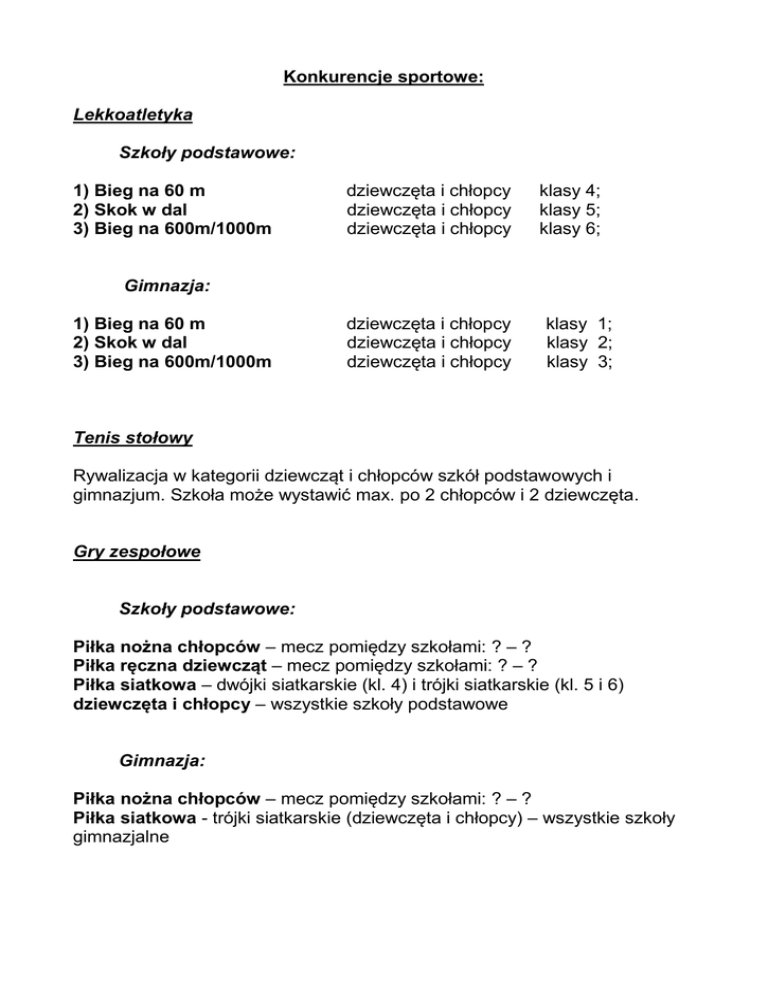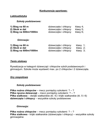 Konkurencje sportowe: Lekkoatletyka Szkoły podstawowe: 1) Bieg na 60 m 2) Skok w dal 3) Bieg na 600m/1000m dziewczęta i chłopcy dziewczęta i chłopcy dziewczęta i chłopcy klasy 4; klasy 5; klasy 6; Gimnazja: 1) Bieg na 60 m 2) Skok w dal 3) Bieg na 600m/1000m dziewczęta i chłopcy dziewczęta i chłopcy dziewczęta i chłopcy klasy 1; klasy 2; klasy 3; Tenis stołowy Rywalizacja w kategorii dziewcząt i chłopców szkół podstawowych i gimnazjum. Szkoła może wystawić max. po 2 chłopców i 2 dziewczęta. Gry zespołowe Szkoły podstawowe: Piłka nożna chłopców – mecz pomiędzy szkołami: ? – ? Piłka ręczna dziewcząt – mecz pomiędzy szkołami: ? – ? Piłka siatkowa – dwójki siatkarskie (kl. 4) i trójki siatkarskie (kl. 5 i 6) dziewczęta i chłopcy – wszystkie szkoły podstawowe Gimnazja: Piłka nożna chłopców – mecz pomiędzy szkołami: ? – ? Piłka siatkowa - trójki siatkarskie (dziewczęta i chłopcy) – wszystkie szkoły gimnazjalne