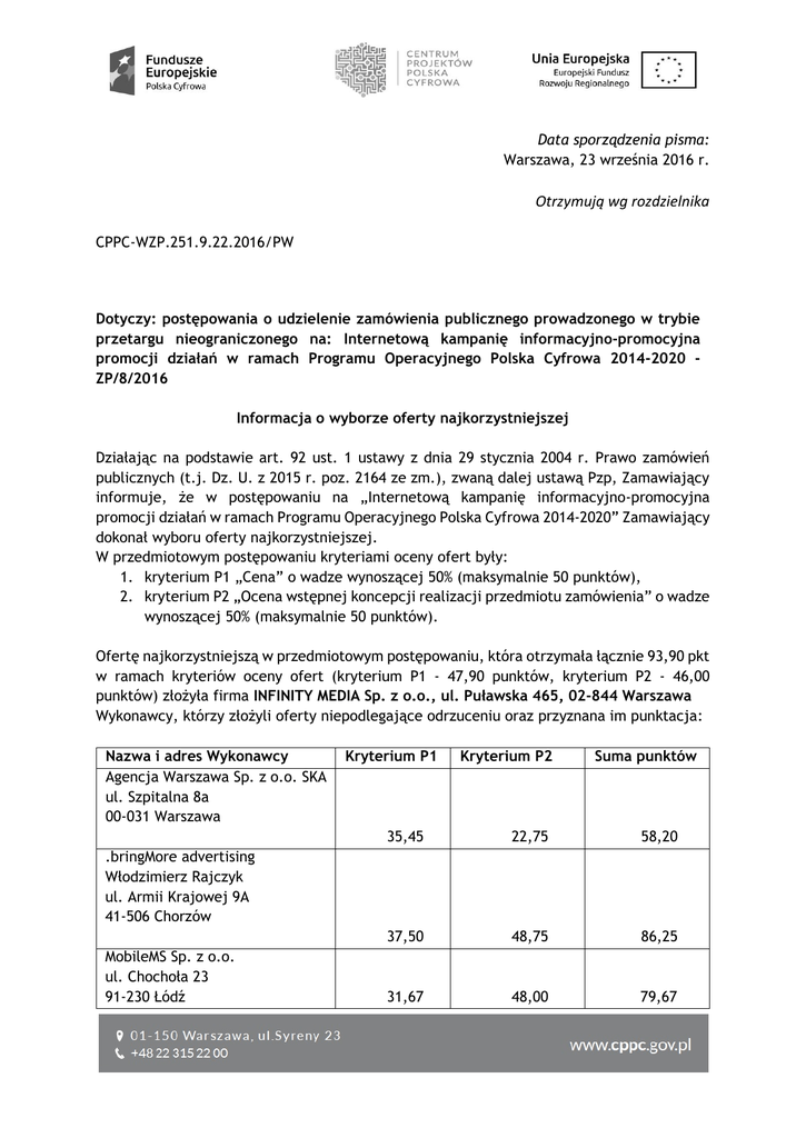 Data sporządzenia pisma: Warszawa, 23 września 2016 r. Otrzymują wg rozdzielnika CPPC-WZP.251.9.22.2016/PW Dotyczy: postępowania o udzielenie zamówienia publicznego prowadzonego w trybie przetargu nieograniczonego na: Internetową kampanię informacyjno-promocyjna promocji działań w ramach Programu Operacyjnego Polska Cyfrowa 2014-2020 ZP/8/2016 Informacja o wyborze oferty najkorzystniejszej Działając na podstawie art. 92 ust. 1 ustawy z dnia 29 stycznia 2004 r. Prawo zamówień publicznych (t.j. Dz. U. z 2015 r. poz. 2164 ze zm.), zwaną dalej ustawą Pzp, Zamawiający informuje, że w postępowaniu na „Internetową kampanię informacyjno-promocyjna promocji działań w ramach Programu Operacyjnego Polska Cyfrowa 2014-2020” Zamawiający dokonał wyboru oferty najkorzystniejszej. W przedmiotowym postępowaniu kryteriami oceny ofert były: 1. kryterium P1 „Cena” o wadze wynoszącej 50% (maksymalnie 50 punktów), 2. kryterium P2 „Ocena wstępnej koncepcji realizacji przedmiotu zamówienia” o wadze wynoszącej 50% (maksymalnie 50 punktów). Ofertę najkorzystniejszą w przedmiotowym postępowaniu, która otrzymała łącznie 93,90 pkt w ramach kryteriów oceny ofert (kryterium P1 - 47,90 punktów, kryterium P2 - 46,00 punktów) złożyła firma INFINITY MEDIA Sp. z o.o., ul. Puławska 465, 02-844 Warszawa Wykonawcy, którzy złożyli oferty niepodlegające odrzuceniu oraz przyznana im punktacja: Nazwa i adres Wykonawcy Agencja Warszawa Sp. z o.o. SKA ul. Szpitalna 8a 00-031 Warszawa Kryterium P1 Kryterium P2 Suma punktów 35,45 22,75 58,20 37,50 48,75 86,25 31,67 48,00 79,67 .bringMore advertising Włodzimierz Rajczyk ul. Armii Krajowej 9A 41-506 Chorzów MobileMS Sp. z o.o. ul. Chochoła 23 91-230 Łódź APLAN Michał Wasilewski ul. 6 sierpnia 52/4 90-637 Łódź 33,22 43,25 76,47 32,02 38,25 70,27 50,00 37,00 87,00 47,90 46,00 93,90 Fabryka Komunikacji Społecznej s.c. ul. Filtrowa 75/22 02-032 Warszawa Ideo Sp. z o.o. ul. Nad Przyrwą 13 35-234 Rzeszów „INFINITY MEDIA” Sp. z o.o. ul. Puławska 465 02-844 Warszawa mrTarget Sp. z o.o. ul. Raciborska 35a 44-200 Rybnik Oferta odrzucona 2
