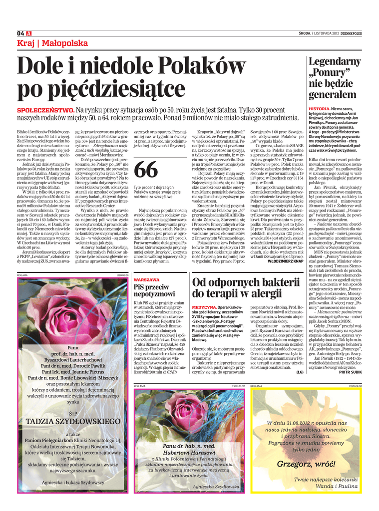 04 A ŚRODA, 7 LISTOPADA 2012 Kraj | Małopolska Dole i niedole Polaków po pięćdziesiątce Legendarny „Ponury” nie będzie generałem SPOŁECZEŃSTWO. Na rynku pracy sytuacja osób po 50. roku życia jest fatalna. Tylko 30 procent HISTORIA. Niemaszans, bylegendarnydowódcaArmii Krajowej,cichociemnymjrJan Piwnikps.Ponuryzostaławansowanydostopniagenerała. Atego–po decyzjiMinisterstwa ObronyNarodowejoprzyznaniu mustopniapułkownika–chcą żołnierze,którymidowodziłpodczaswalkwŚwiętokrzyskiem. naszych rodaków między 50. a 64. rokiem pracowało. Ponad 9 milionów nie miało stałego zatrudnienia. Blisko13milionówPolaków,czyli co trzeci, ma 50 lat i więcej. Za 25 lat powyżej tego wieku będzie co drugi mieszkaniec naszego kraju. Staniemy się jednym z najstarszych społeczeństw Europy. Jednak już dziś sytuacja Polakówpo50.rokużycianarynku pracy jest fatalna. Mamy jedną z najniższych w UE stóp zatrudnieniawtejgrupiewiekowej(gorzej wypada tylko Malta). W 2011 r. tylko 30,4 proc. rodaków mających od 50 do 64 lat pracowało. Oznacza to, że ponad 9 milionów Polaków nie ma stałego zatrudnienia. Tymczasem w Szwecji odsetek pracujących 50-cio i 60-latków wynosi ponad 70 proc., w Danii, Finlandii czy Niemczech niewiele mniej. Także u naszych sąsiadów jest on znacząco wyższy. W Czechach i na Litwie wynosi około 50 proc. JeremiMordasewicz,ekspert z PKPP „Lewiatan”, członek radynadzorczejZUS,zwracauwa- gę, żeprawieczworonapięcioro niepracujących Polaków w grupie 50+ jest na rencie lub emeryturze. – Zdecydowana większośćznichmogłabyjeszczepracować – mówi Mordasewicz. Dość powszechne jest przekonanie, że Polacy po „50” nie uprawiają sportu, nie prowadzą aktywnego trybu życia. Czy taki obraz jest prawdziwy? Na to i inne pytania dotyczące aktywności Polaków po 50. roku życia starali się uzyskać odpowiedź autorzybadań„Aktywnidojrzali”, przygotowanych przez Interactive Research Center. Wynika z nich, że prawie dwie trzecie Polaków mających co najmniej pół wieku życia zasobą twierdzi, iż prowadzi aktywny styl życia, utrzymuje licznekontaktyzeznajomymi,atakże, że – w większości – są zadowoleni z tego, jak żyją. Autorzy badań podkreślają, że dla dojrzałych Polaków aktywne życie oznacza głównie regularne uprawianie ćwiczeń fi- REKLAMA zycznych oraz spacery. Przynajmniej raz w tygodniu ćwiczy 51 proc., a 18 proc. nie podejmuje żadnej aktywności fizycznej. 66 Tyle procent dojrzałych Polaków uznaje swoje życie rodzinne za szczęśliwe Największą popularnością wśród dojrzałych rodaków cieszą się ćwiczenia ogólnorozwojowe.Doichwykonywaniaprzyznaje się 28 proc. z nich. Na drugim miejscu jest praca w ogrodzie lub na działce (27 proc.). Porównywalnie duża grupa Polaków,którarozpoczęłaprzynajmniejszósty„krzyżyk”,korzysta z nordic walking (spacery z kijkami) oraz pływania. Zraportu„Aktywnidojrzali” wynika też, że Polacy po „50” są w większości optymistami. Ponad jedna trzecia jest przekonana, że rzeczywistość im sprzyja, a tylko co piąty ocenia, iż w życiumusięnieposzczęściło.Dwoje na troje Polaków uznaje życie rodzinne za szczęśliwe. Dojrzali Polacy mają oczywiście powody do narzekania. Najczęściej skarżą się na kiepskie zarobki oraz niskie emerytury.Marnepensjelubświadczenia są dla nich najczęstszym powodem stresu. Znacznie bardziej pesymistyczny obraz Polaków po „50” przynoszą badania SHARE (Badania Zdrowia, Starzenia się i Procesów Emerytalnych w Europie),wnaszymkrajjuprzeprowadzane przez ekonomistów zUniwersytetuWarszawskiego. Pokazały one, że wPolsce zaledwie 38 proc. mężczyzn i 29 proc. kobiet deklaruje aktywność fizyczną (co najmniej raz wtygodniu).Przyprawie70proc. Szwajcarów i 60 proc. Szwajcarek aktywność Polaków po „50” wypada blado. Co gorsza, zbadania SHARE wynika, że Polska ma jedne z gorszych statystyk zdrowotnych w grupie 50+. Tylko 7 proc. Polaków i 6 proc. Polek uważa zdrowie za bardzo dobre lub doskonałe w porównaniu np. z 19 i 17 proc. w Czechach czy 53 i 54 proc. w Danii. Biorącpoduwagękonkretny czynnikkontrolny,jakimjestwysokie ciśnienie krwi czy otyłość, Polacy po pięćdziesiątce także mająnajgorszestatystyki.Ażpołowa badanych Polek ma zidentyfikowane wysokie ciśnienie krwi. Dla porównania w przypadku Szwajcarek jest to tylko 25 proc. Także znaczny odsetek polskich mężczyzn (22 proc.) w wieku 50+ jest otyłych, co jest wskaźnikiem na podobnym poziomiejakwHiszpaniiczywCzechach, ale dużo wyższym niż wDaniiiSzwajcarii(po13proc.). WŁODZIMIERZ KNAP 1988096/00 WARSZAWA PiS przeciw nepotyzmowi Panu prof. dr. hab. n. med. Ryszardowi Lauterbachowi Pani dr n. med. Dorocie Pawlik Pani lek. med. Joannie Pietras Pani dr n. med. Ilonie Lisowskiej-Miszczyk oraz pozostałym lekarzom którzy z oddaniem, troską i determinacją walczyli o uratowanie życia i zdrowia naszego synka Klub PiS zgłosi projekty zmian w ustawach, które mają przyczynić się do zwalczenia nepotyzmu; PiS chce m.in. utworzenia Centralnego Rejestru Oświadczeń o środkach finansowych osób zatrudnionych w administracji rządowej i spółkach Skarbu Państwa. Dziennik „Pulsu Biznesu” napisał, że 428 działaczy Platformy Obywatelskiej, członków ich rodzin i znajomych znalazło się we władzach państwowych spółek i agencji. W ciągu pięciu lat mieli zarobić 200 mln zł. (PAP) Od odpornych bakterii do terapii w alergii MEDYCYNA. Opera Krakowska gości lekarzy, uczestników XVIII Sympozjum Naukowo-Szkoleniowego „Postępy w alergologii i pneumonologii”. Placówka kulturalna chwilowo zamieniła się więc w salę wykładową. Okazuje się, że motorem postępu mogą być także prymitywne organizmy. Bakterie z nieprzyjaznego środowiska pustynnego przyczyniły się np. do opracowania REKLAMA 1988101/00 preparatów z ektoiną. Prof. Roman Nowicki mówił o ich zastosowaniu m.in. w leczeniu atopowego