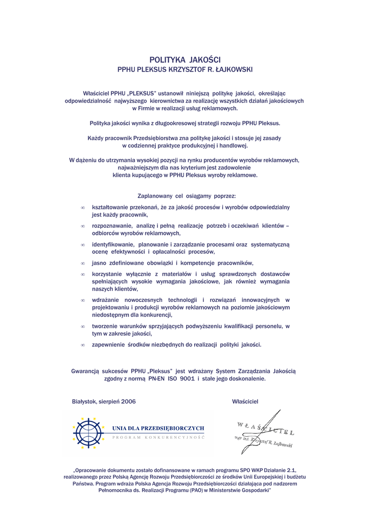 POLITYKA JAKOŚCI PPHU PLEKSUS KRZYSZTOF R. ŁAJKOWSKI Właściciel PPHU „PLEKSUS” ustanowił niniejszą politykę jakości, określając odpowiedzialność najwyższego kierownictwa za realizację wszystkich działań jakościowych w Firmie w realizacji usług reklamowych. Polityka jakości wynika z długookresowej strategii rozwoju PPHU Pleksus. Każdy pracownik Przedsiębiorstwa zna politykę jakości i stosuje jej zasady w codziennej praktyce produkcyjnej i handlowej. W dążeniu do utrzymania wysokiej pozycji na rynku producentów wyrobów reklamowych, najważniejszym dla nas kryterium jest zadowolenie klienta kupującego w PPHU Pleksus wyroby reklamowe. Zaplanowany cel osiągamy poprzez: • kształtowanie przekonań, że za jakość procesów i wyrobów odpowiedzialny jest każdy pracownik, • rozpoznawanie, analizę i pełną realizację potrzeb i oczekiwań klientów – odbiorców wyrobów reklamowych, • identyfikowanie, planowanie i zarządzanie procesami oraz systematyczną ocenę efektywności i opłacalności procesów, • jasno zdefiniowane obowiązki i kompetencje pracowników, • korzystanie wyłącznie z materiałów i usług sprawdzonych dostawców spełniających wysokie wymagania jakościowe, jak również wymagania naszych klientów, • wdrażanie nowoczesnych technologii i rozwiązań innowacyjnych w projektowaniu i produkcji wyrobów reklamowych na poziomie jakościowym niedostępnym dla konkurencji, • tworzenie warunków sprzyjających podwyższeniu kwalifikacji personelu, w tym w zakresie jakości, • zapewnienie środków niezbędnych do realizacji polityki jakości. Gwarancją sukcesów PPHU „Pleksus” jest wdrażany System Zarządzania Jakością zgodny z normą PN-EN ISO 9001 i stałe jego doskonalenie. Białystok, sierpień 2006 Właściciel „Opracowanie dokumentu zostało dofinansowane w ramach programu SPO WKP Działanie 2.1, realizowanego przez Polską Agencję Rozwoju Przedsiębiorczości ze środków Unii Europejskiej i budżetu Państwa. Program wdraża Polska Agencja Rozwoju Przedsiębiorczości działająca pod nadzorem Pełnomocnika ds. Realizacji Programu (PAO) w Ministerstwie Gospodarki”